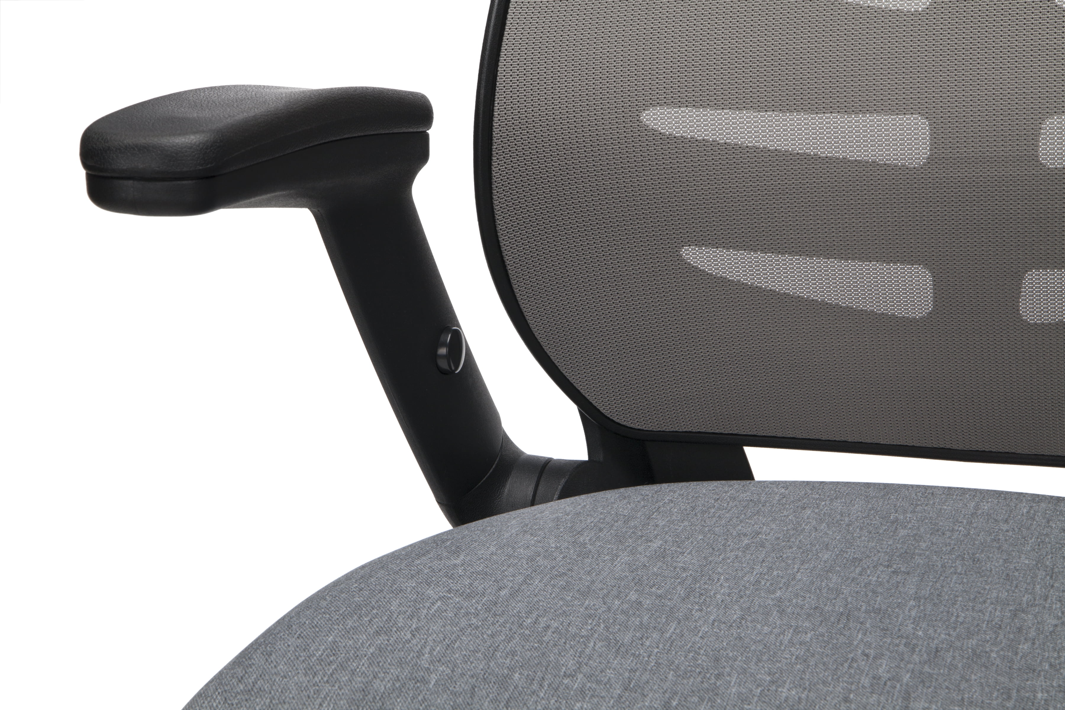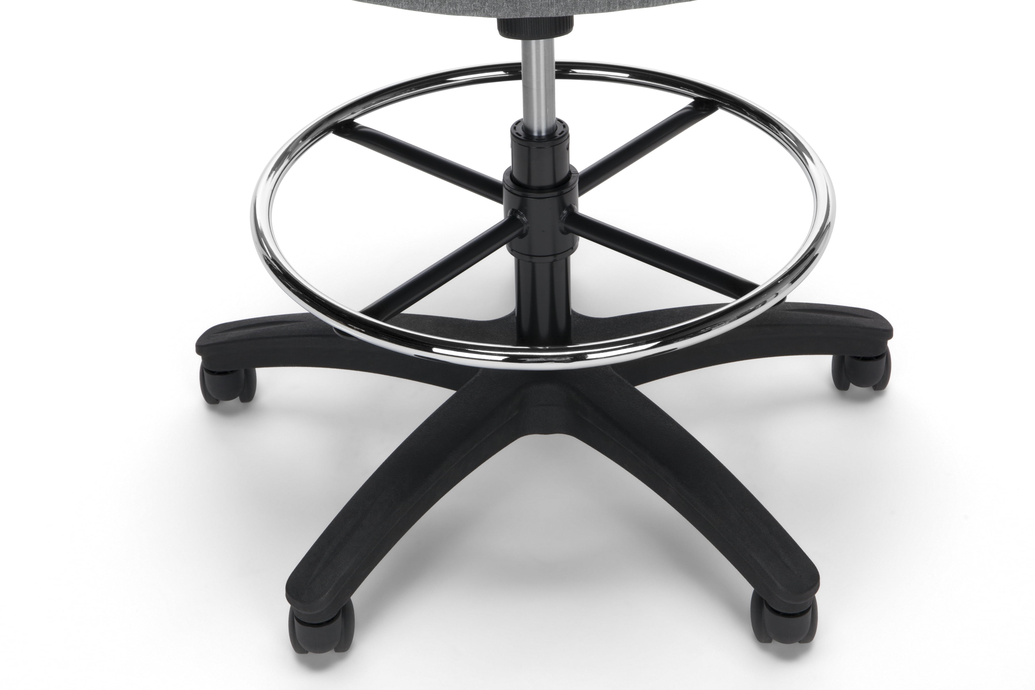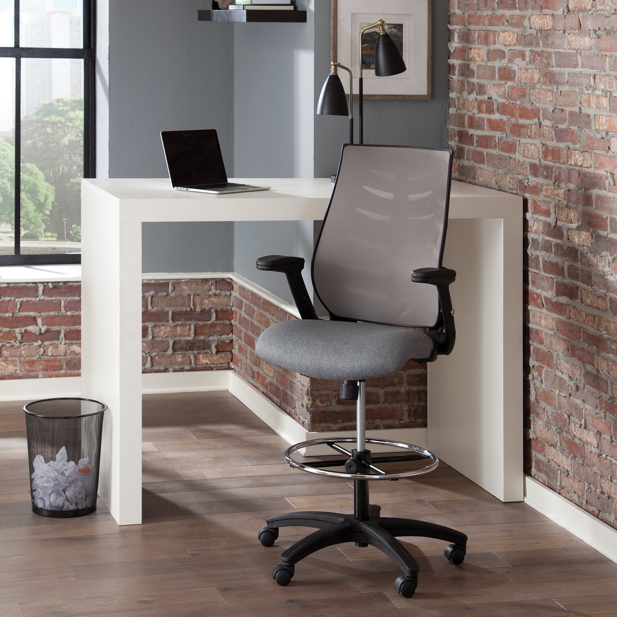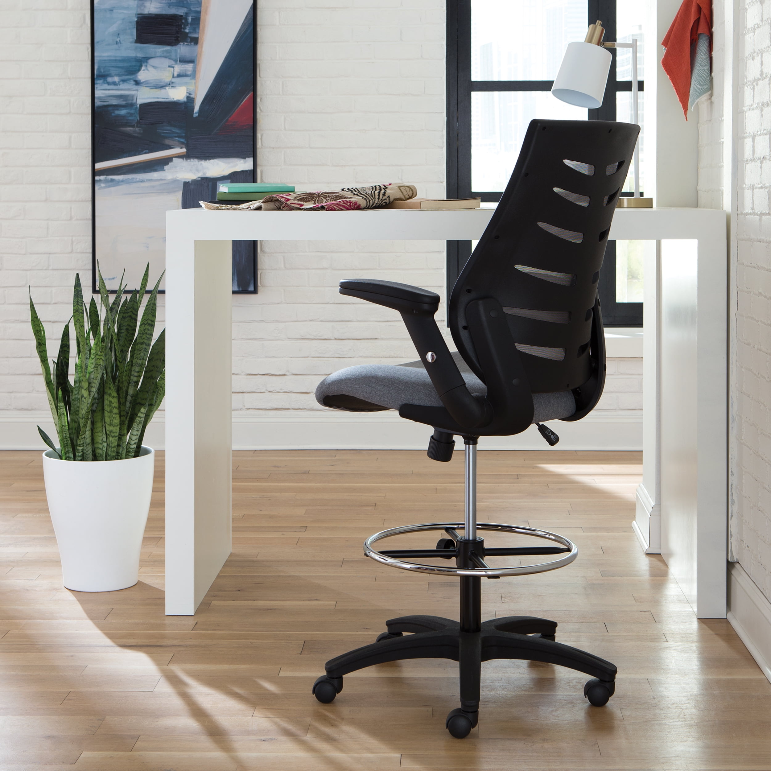 The stylish ventilated design of the mesh back provides air circulation for your back The conforming fabric seat with waterfall edge takes the pressure off the back of your thighs Draft stool features an integrated lumbar support for all-day back comfort The drafting stool features metal footring to provide a resting spot, and support, for your feet The flip up and height-adjustable arms on the drafting chair provide support and allow for freedom of movement The center-tilt mechanism rotates the seat back into a comfortable reclining position This task chair features upright tilt lock which secures the chair in the full upright position to prevent unintended reclining Tilt tension controls the rate and ease of recline to make tilting easy but not too fast Pneumatic seat height adjustment controls the seat’s up and down movement to adapt to various user heights The office chair features a five-star base that is molded from reinforced resin and has a 360-degree swivel that provides freedom of movement in any direction This roomy chair measures 28.54″ D x 28.15″ W x 47.24 – 55.91″ H This multi-purpose chair features a 275 lb weight capacity and is backed by the OFM 10-Year Limited Warranty