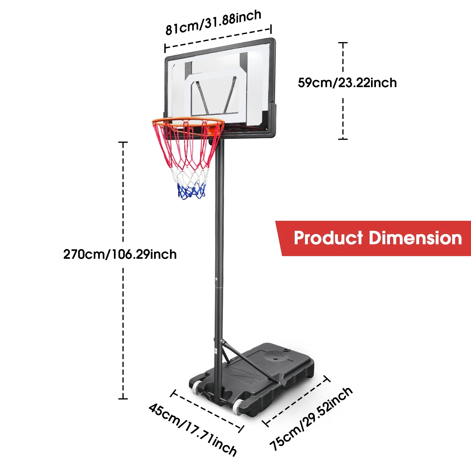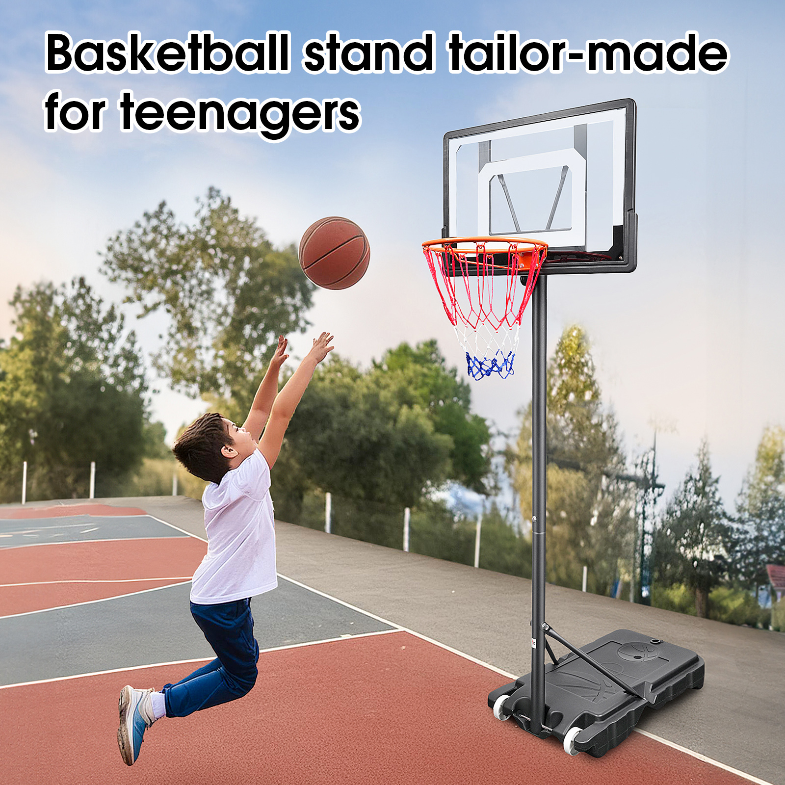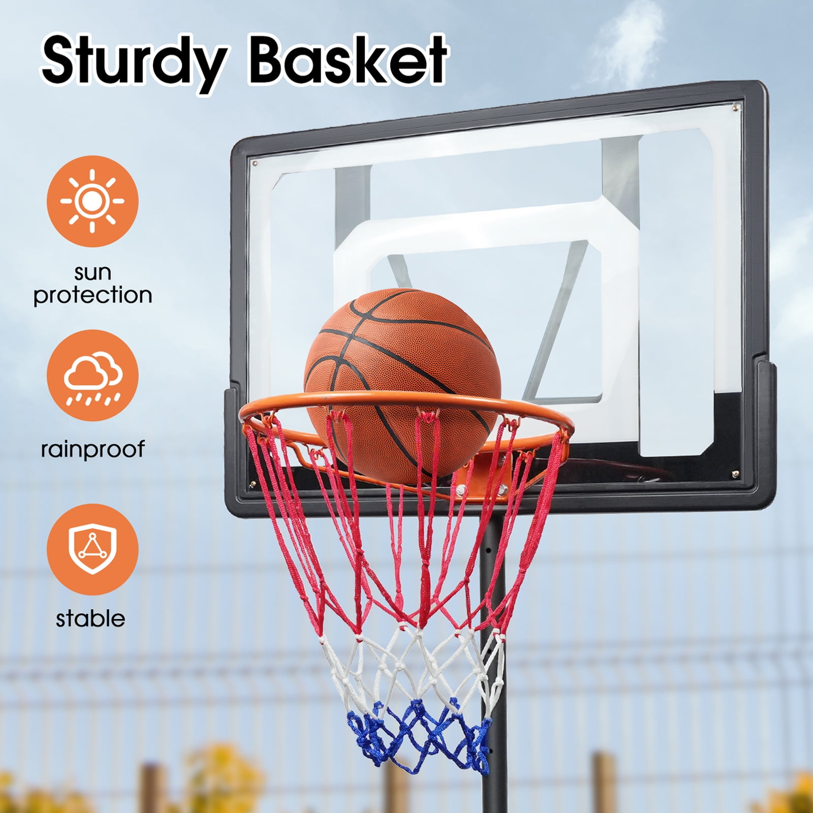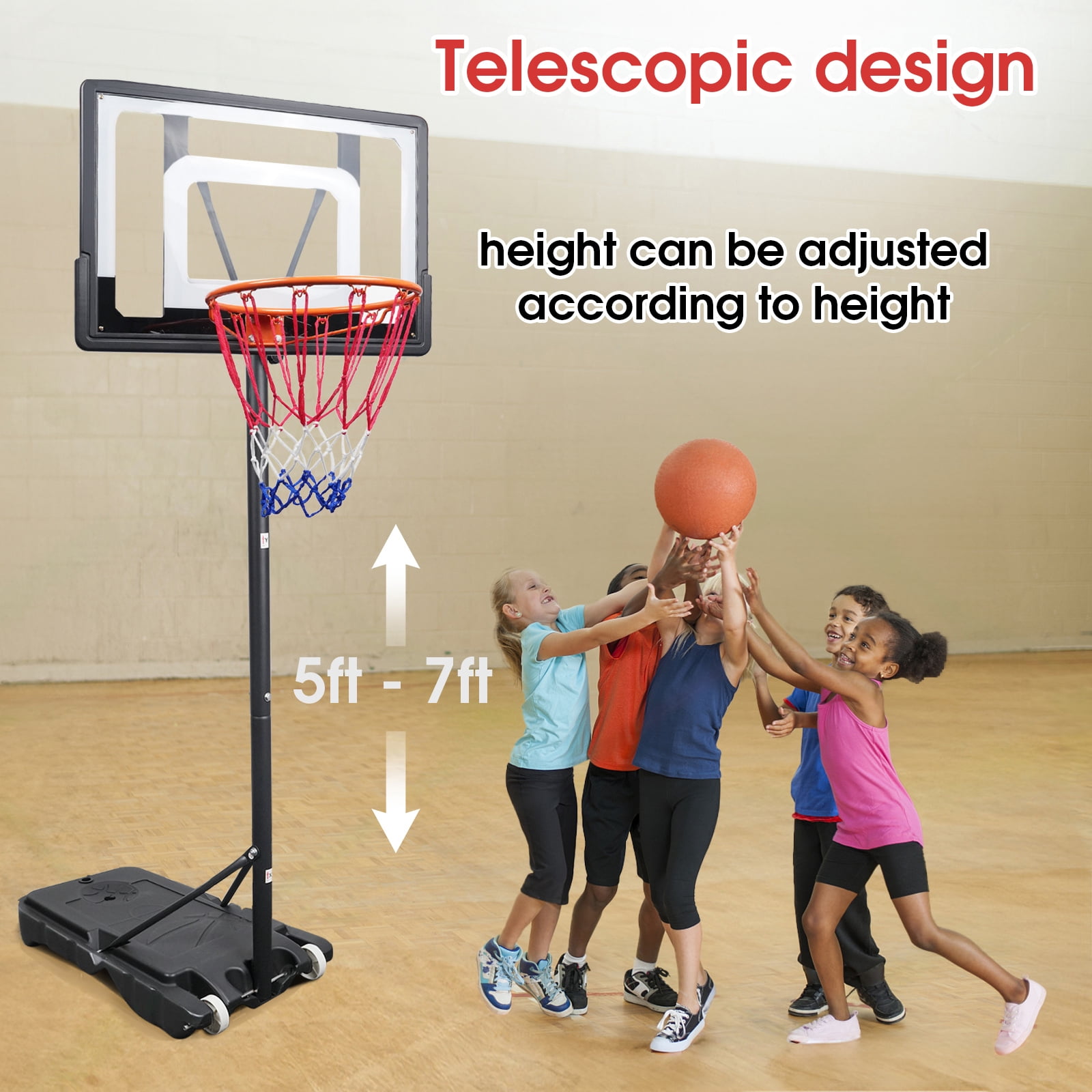 Ogednac 60″ – 84″ Adjustable Height 33″ x 23″ Indoor and Outdoor Portable Basketball System (Adult) Portable Basketball Hoop System: Designed for easy mobility, the OGEDNAC basketball goal allows you to set up a game wherever you go, making it perfect for outdoor activities and on-the-go fun Effortless Height Adjustment: Adjust the hoop’s height from 5 to 7 ft without any tools, accommodating players of all ages and skill levels Durable Frame with Permanent Bonding: Features a 44-inch shatterproof backboard made from robust PC material, designed to withstand vigorous play and prevent cracking due to thermal expansion and contraction Outdoor Ready: Built to endure outdoor elements, this basketball goal is ideal for backyards, garages, or outdoor courts, providing endless entertainment Multi-Age Appropriate: Suitable for both kids and adults, this basketball hoop grows with your family, offering adjustable fun