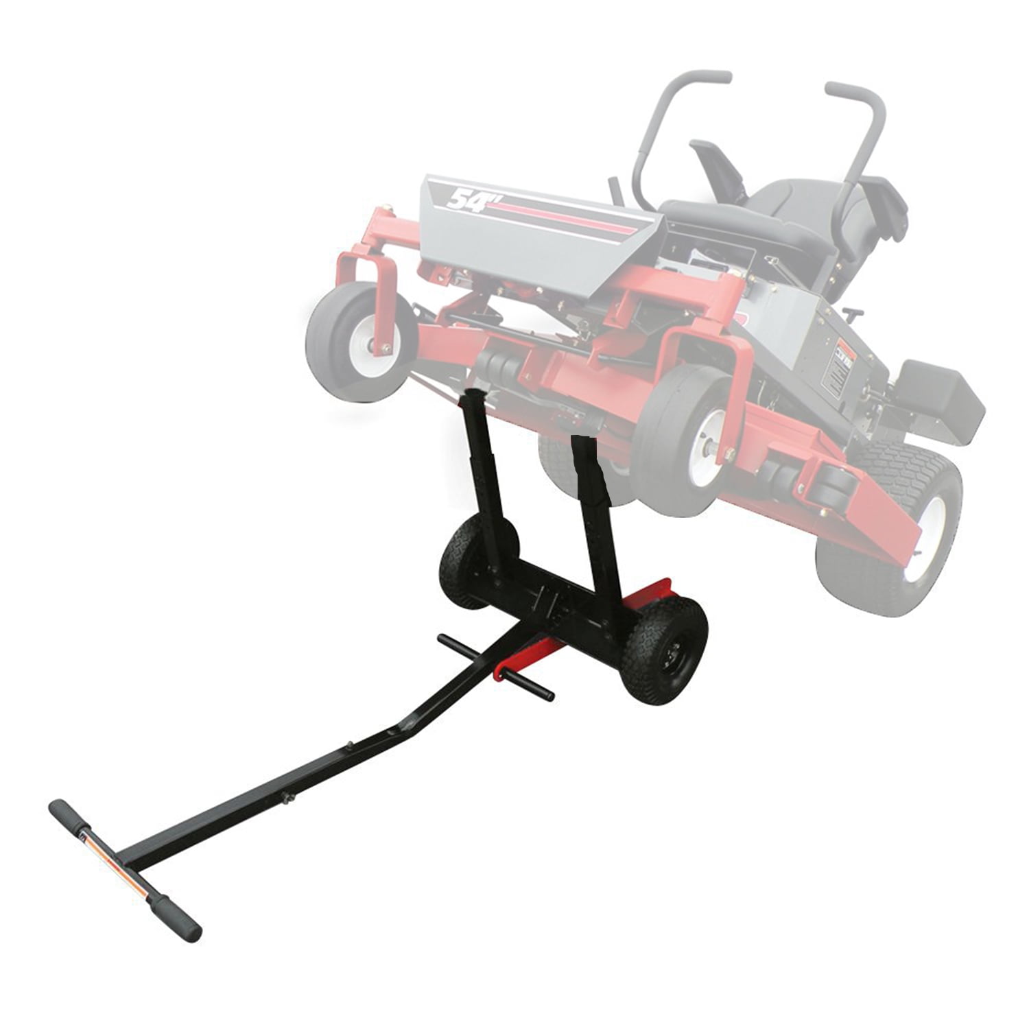 Lift zero turn mower with up to 60-inch deck widths using this tractor lift Easily service and clean your mower without putting stress on your back Stabilizer bar locks mower in upright position while raised Constructed from heavy-duty steel with a black powder coat finish Equipped with 10-inch 2 ply pneumatic tires for smooth transport Color: Black, red Dimensions (L x W x H): 12.5 x 18 x 28 inches Weight: 55 pounds Manufacturer warranty: 3-year warranty