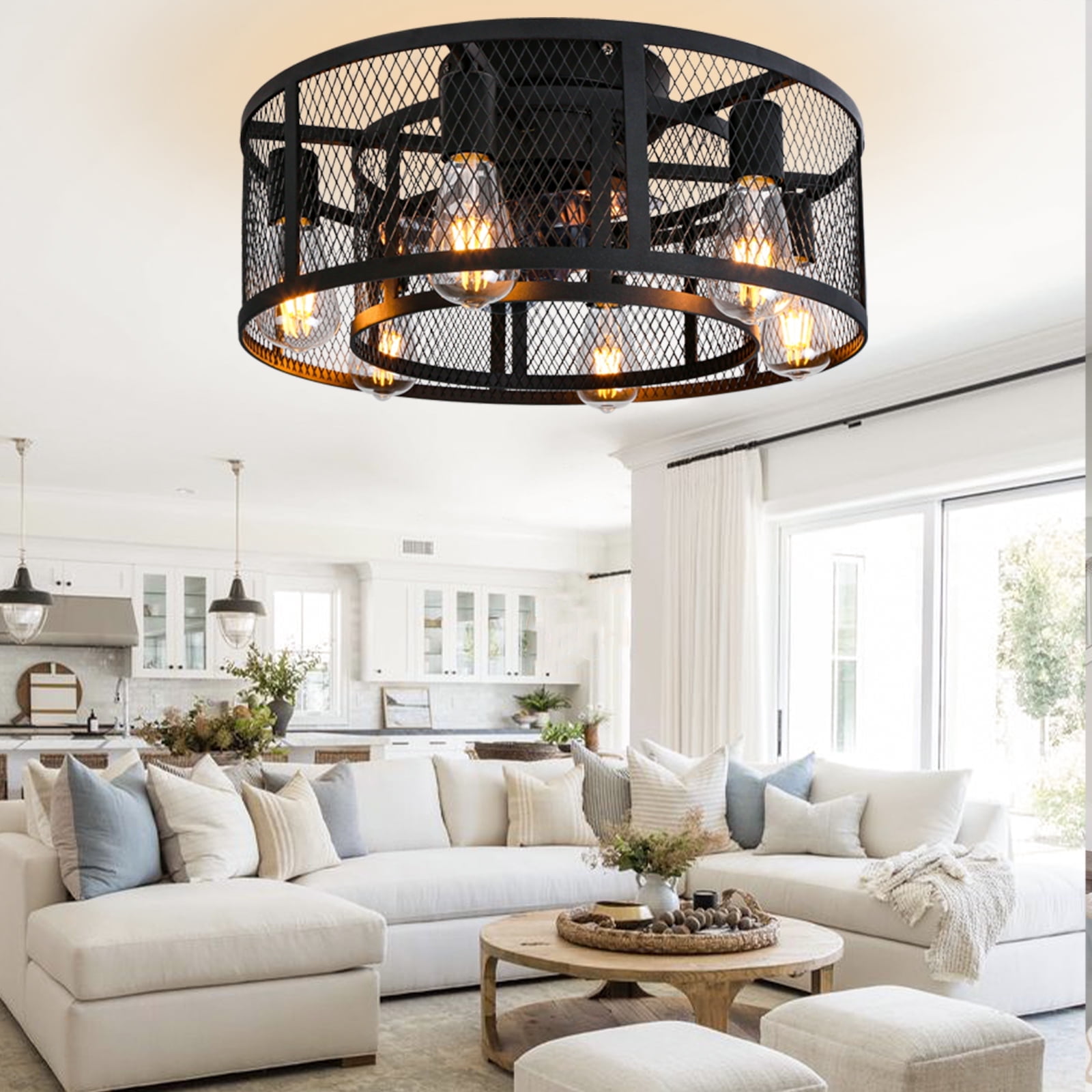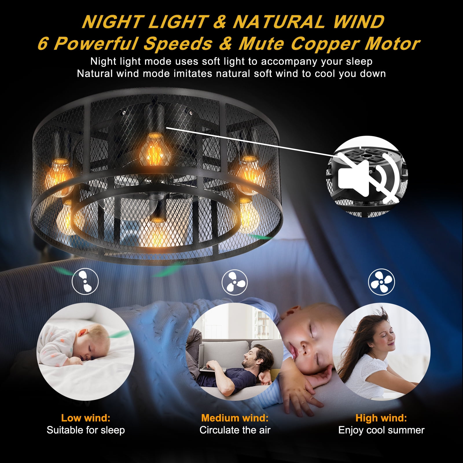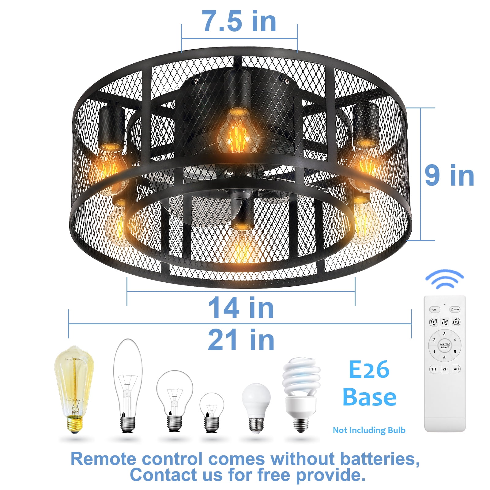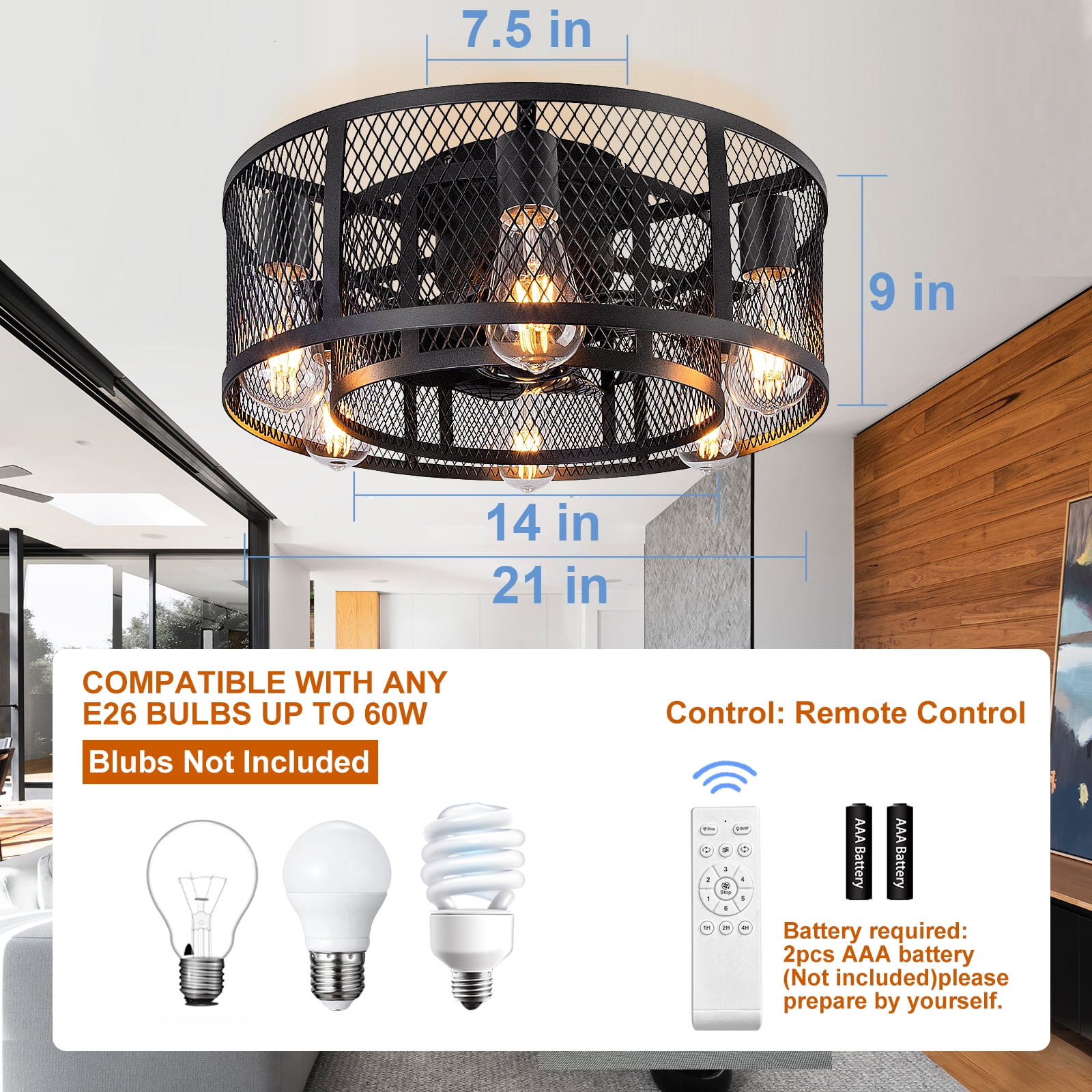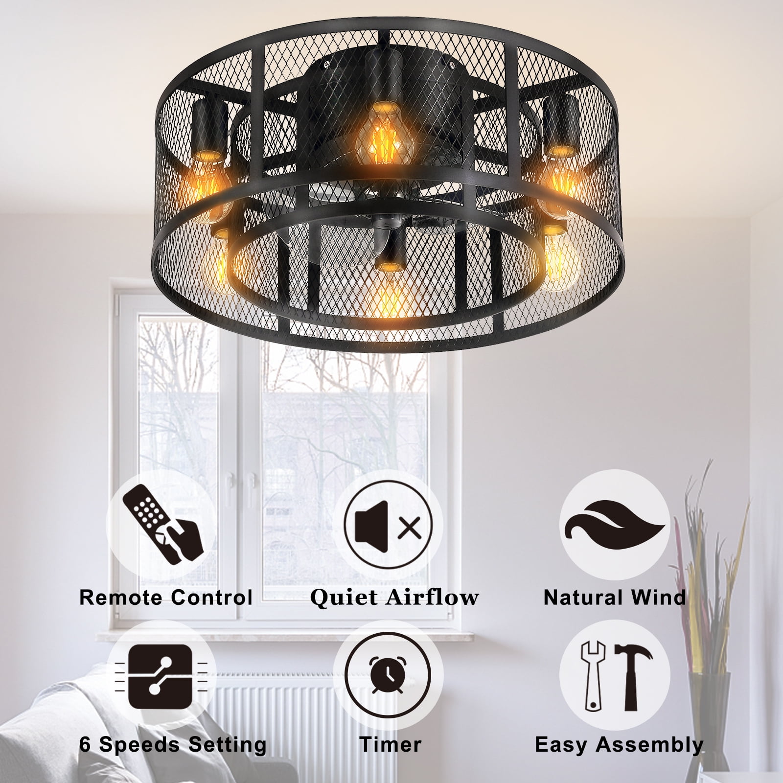 Elevate your home decor with the Ohniyou 21-inch Farmhouse Caged Ceiling Fan. This modern industrial ceiling fan features a flush mount design, 8 semi-enclosed black blades, and 6 E26 light sockets compatible with any E26 Edison bulb (bulbs not included). With a Max load of 60 watts, a 10w LED light bulb is recommended. Equipped with a quiet DC motor offering 6-speed settings, this ceiling fan also comes with a remote control to easily adjust the fan speed, turn the lights on/off, and reverse the wind direction. Suitable for small to medium-sized rooms, this versatile ceiling fan is perfect for bedroom, living room, kitchen.