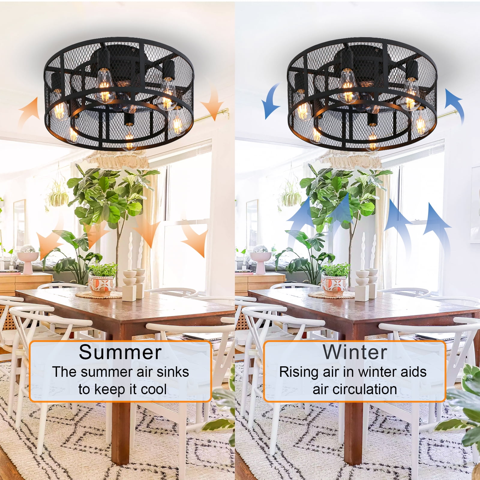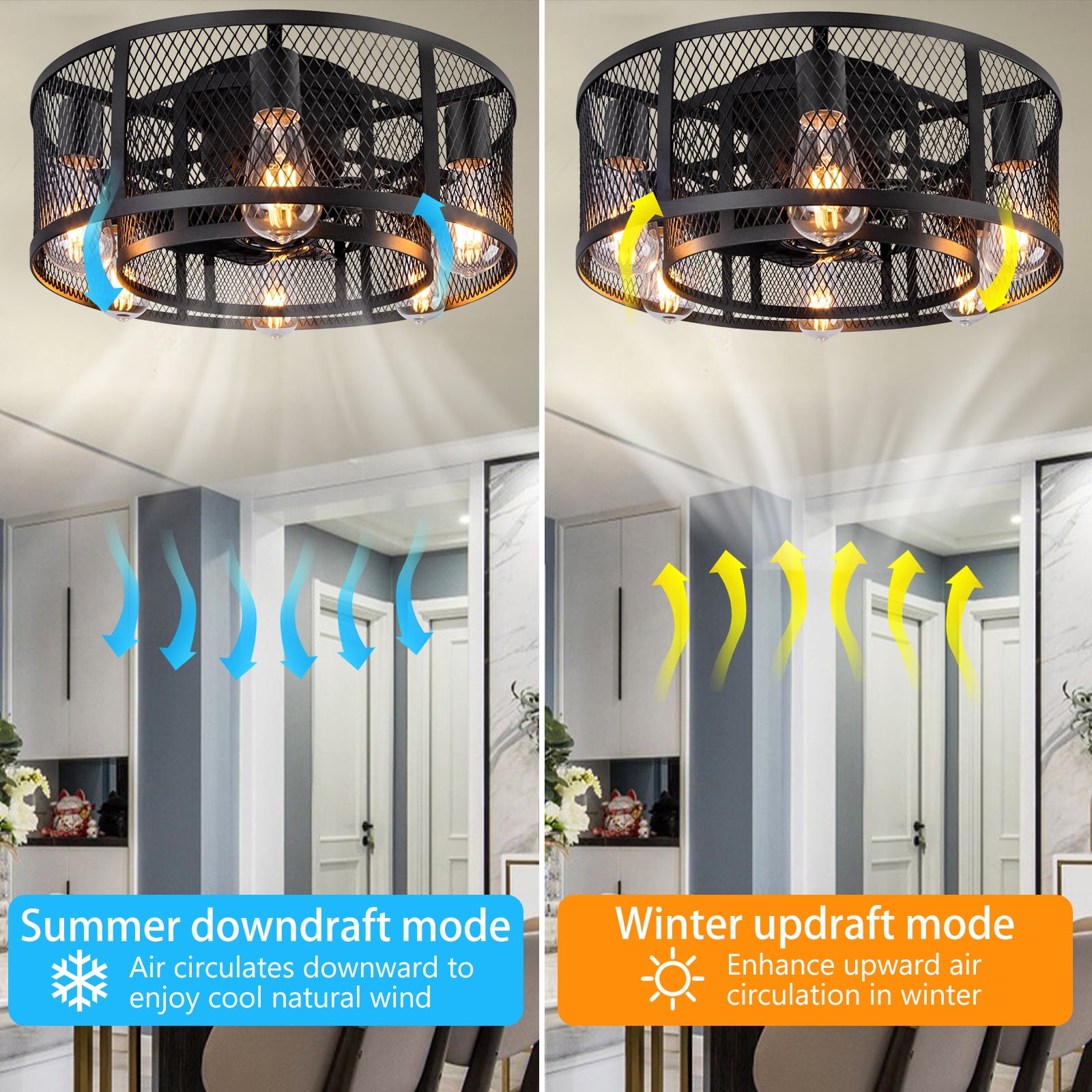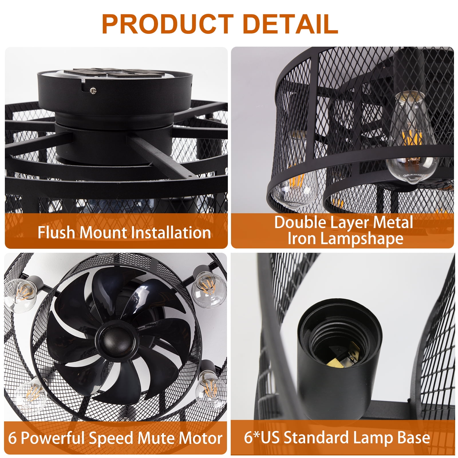 – 21inch industrial small double cage ceiling fan with remote and 8 Semi-enclosed black blades, 6 E26 light sockets compatible with any E26 Edison bulb(bulbs not included), choose warm or cool light bulbs as your need. With a Max load of 60 watts, a 10w LED light bulb is recommended. – Ohniyou Flush mount bladeless caged ceiling fan comes with a remote. You can easily operate the fan speed, turn on/off the light, set 1/2/4 hours timing, and reverse the wind direction by using the remote. Create an excellent life and sleep environment to accompany you in all seasons. – The farmhouse black flush mount DC ceiling fan with light offers a 6-speed setting and is quiet when running, noise ≦ 40dB (ideal sleeping environment). Semi-open design, easy to replace the light bulb and clean the fan blade, helps the motor to dissipate heat quickly, making the fandelier safer and longer lasting, and easy to install. – This Ohniyou 21 inch small low profile caged ceiling fan with lighting fixture is good for small or medium-sized rooms (15-30㎡), such as a kitchen, bedroom, home office, dining room, living room, or any small room. You can choose where it is installed according to your actual needs. – Semi-enclosed farmhouse caged ceiling fans come with manual, remote control, and installation instructions. Flush mount enclosed ceiling fan with light fixtures is safer and saves your space suitable for low ceilings, and small to medium size room.