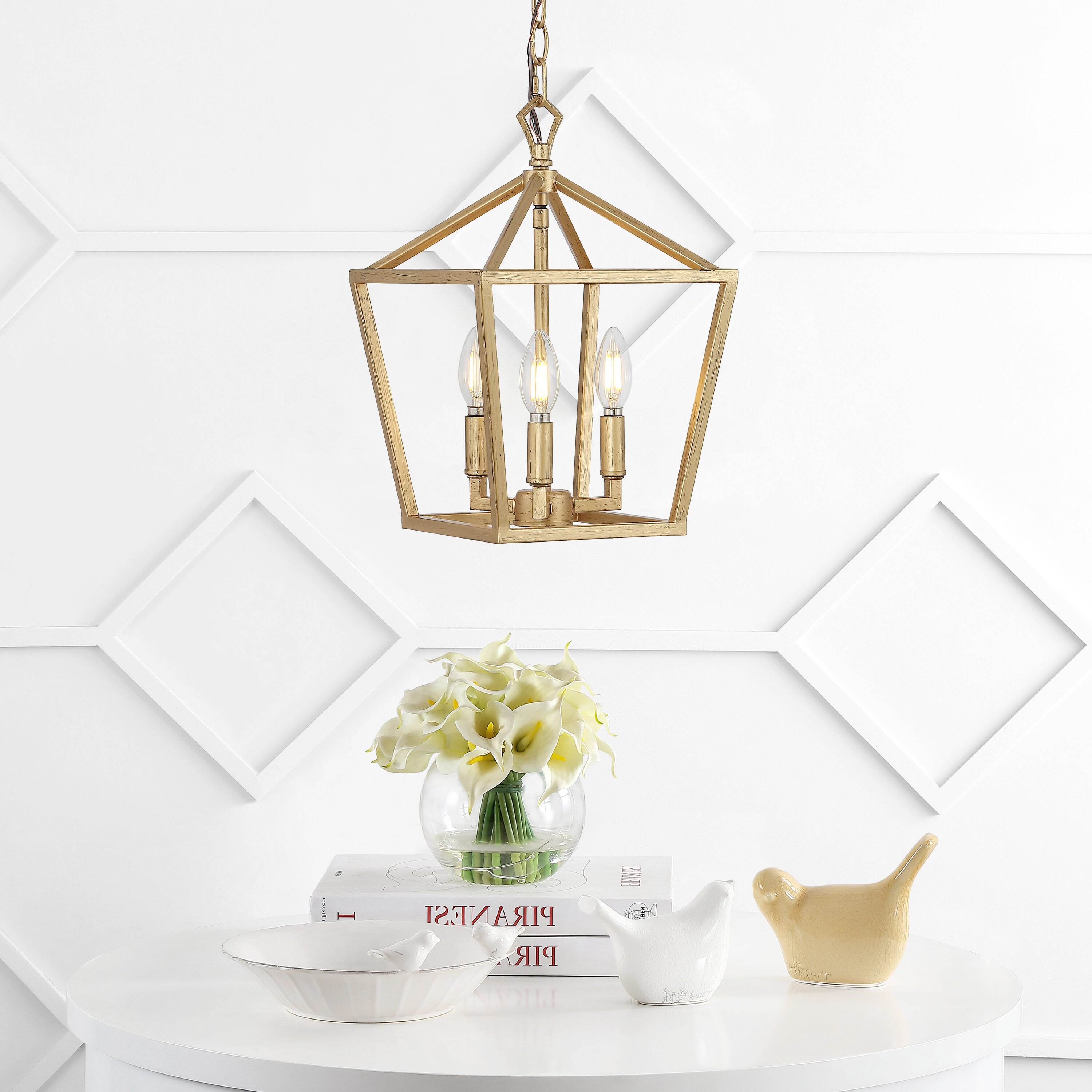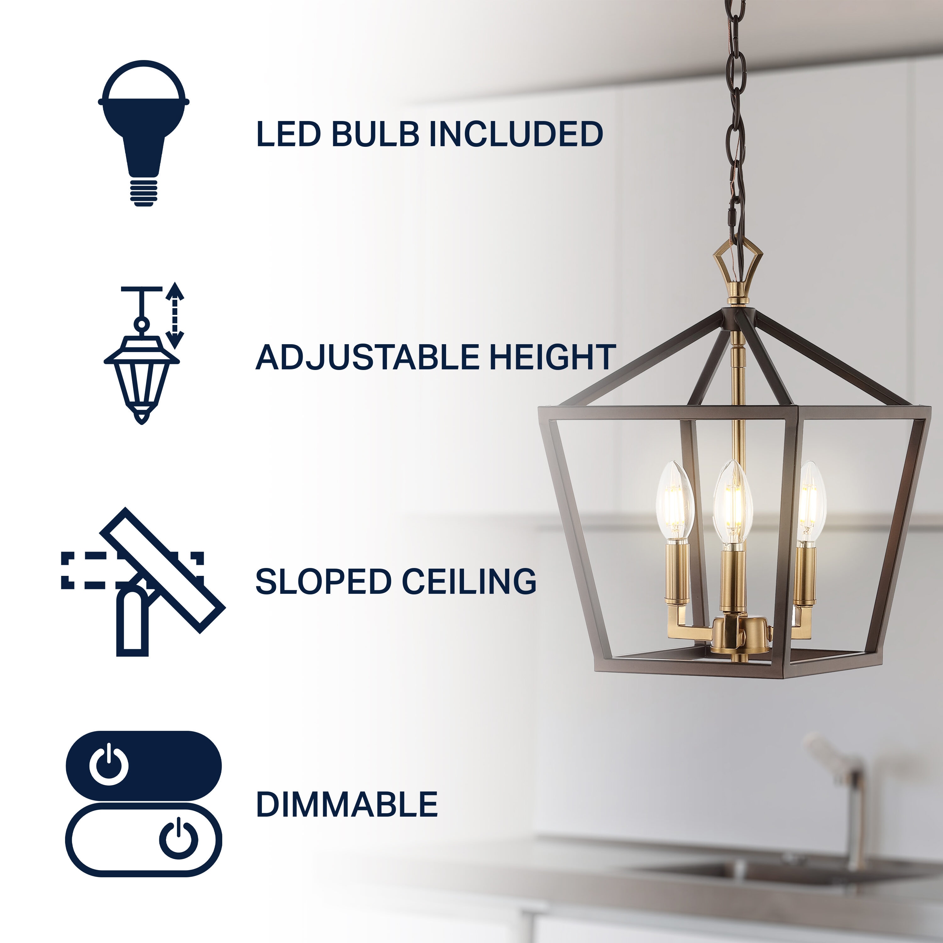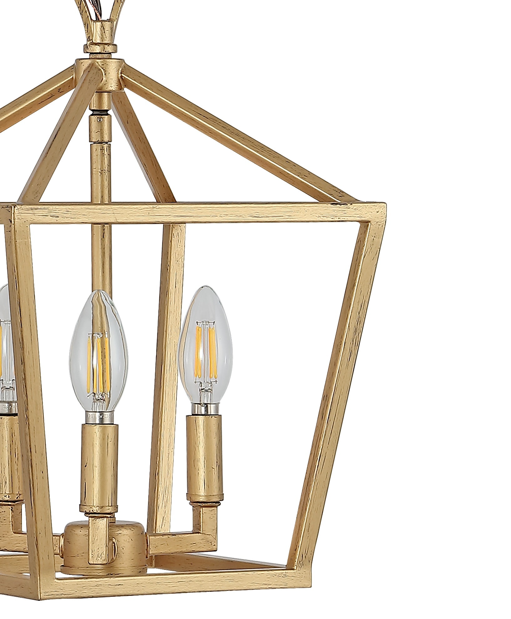 Perfectly sized for a kitchen island, small dining table, entry or hallway, the traditional silhouette of our pendant lantern is updated with a bright gold finish. The open frame contains three candles with LED bulbs that provide warm light for a vintage touch. With its adjustable chain, this versatile lantern is ideal for a modern farmhouse kitchen, rustic entry, or traditional foyer.