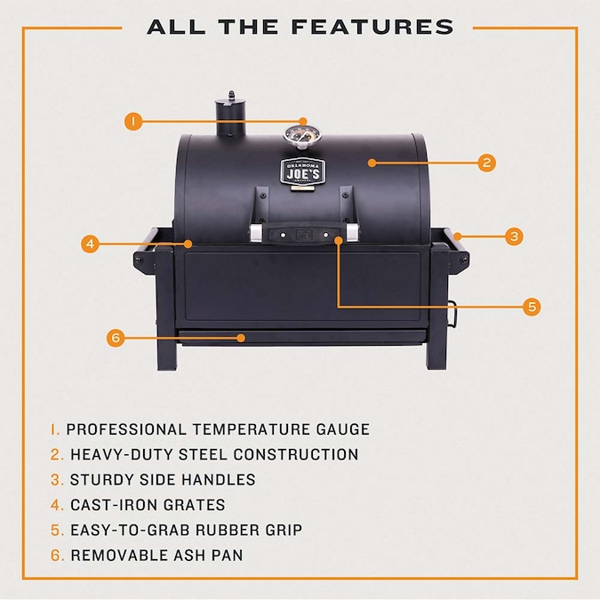 The Oklahoma Joe’s® Rambler Tabletop Charcoal Grill offers portability, but never at the expense of quality. Its heavy-duty construction ensures supreme durability, while the height-adjustable tray and large air dampers let you create the ideal temperature and airflow. Great on the go or in your backyard.