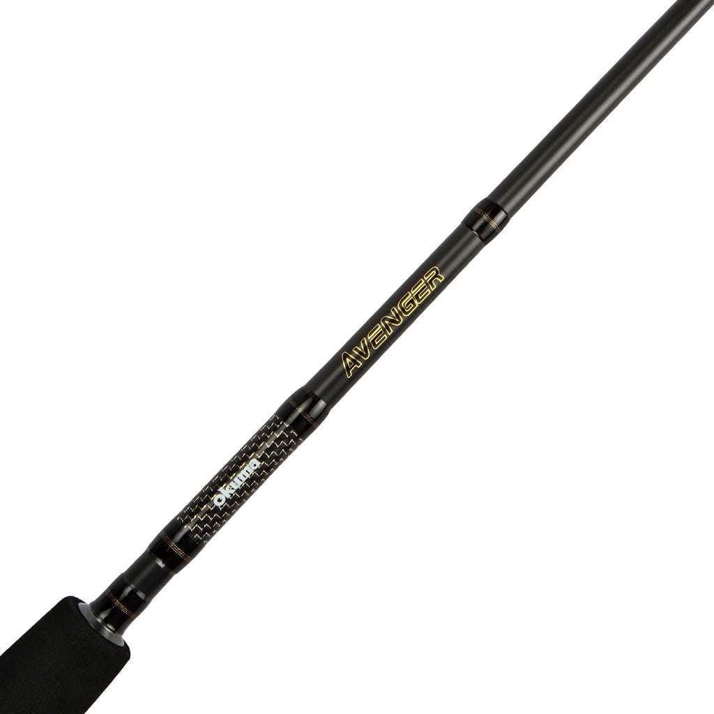 Okuma Avenger 1-Pc Spinning Fishing Rod and Reel Combo, 7 ft. The Okuma Avenger spinning combos pair responsive and durable 24-ton carbon rod blanks with an avenger spinning reel for the ultimate package. New Okuma Avengers feature freshwater, bait feeder, and inshore spinning combos. Avenger spinning combos also feature Okuma’s ultimate flex reinforcement tip technology. Available with standard or bait feeder spinning reel. Okuma Avengers have a 6bb+1rb drive system for ultimate smoothness and performance. Okuma Avenger spinning reels feature precision elliptical gearing system and cyclonic flow rotor design that create less friction during casting for increased distance, greater accuracy, longer line life and minimize water intrusion and corrosion. The CFR, or Cyclonic Flow Rotor creates a “cyclonic” airflow which significantly increases air flow through the rotor creating a faster drying time if the reel should become wet, minimizing corrosion possibilities throughout the reel.They offer a wide size range that is suitable for different fish species and fishing methods.