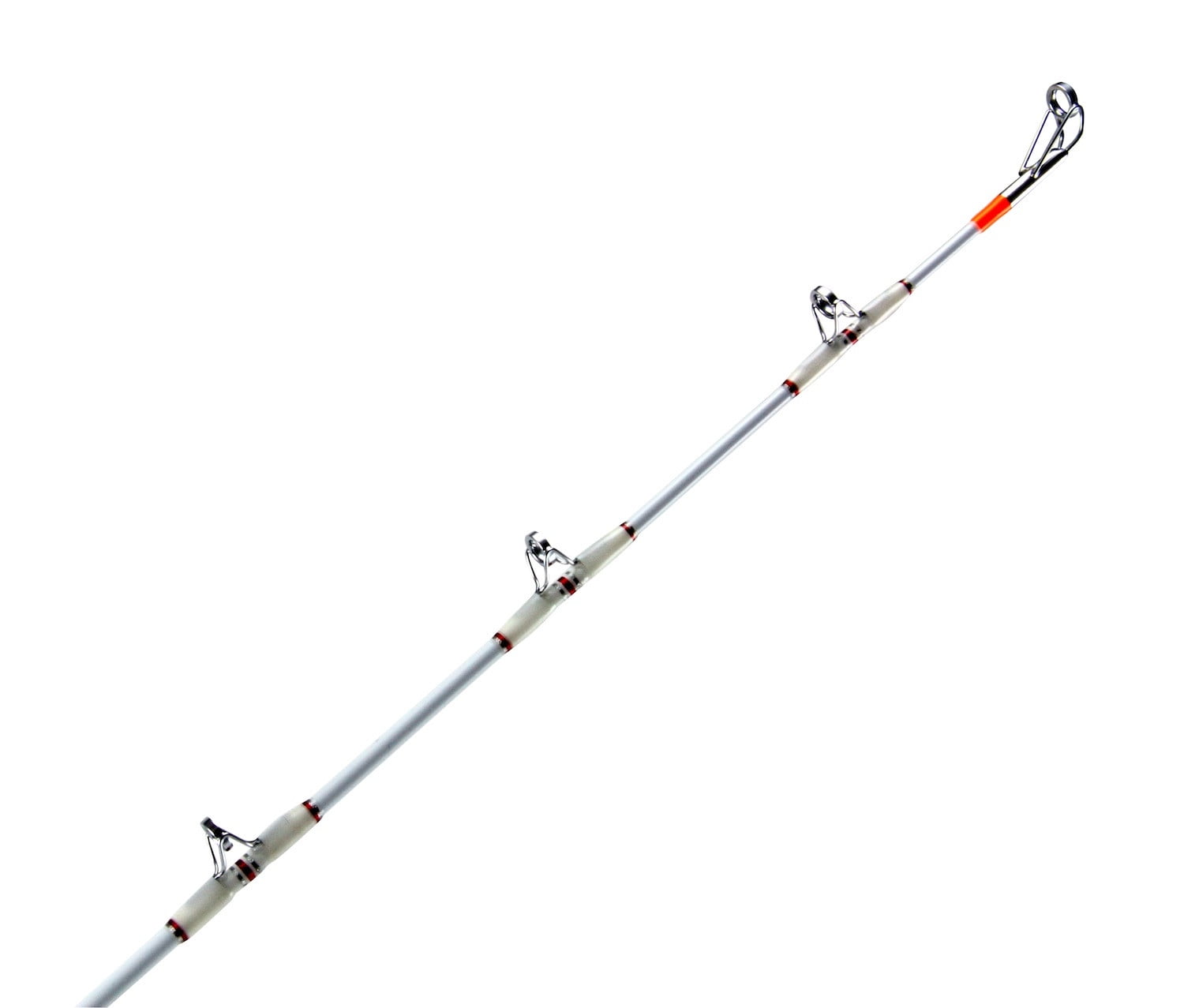 Okuma Battle Cat 2-Piece Heavy 7’6″ Casting Rod: Extremely durable E-glass rod blank construction EVA fore grip for comfort while fighting big cats Cork butt section reduces binding while fishing in rod holders Double foot welded stainless steel guides for ultimate durability Heavy-duty stainless steel hook keeper 7′ 6″ heavy casting rod has a graphite pipe reel seat with oversized anodized aluminum hoods Durable non-skid, rubber gimbals on all models 2-piece blank construction, butted in handle for 1-piece strength and feel 2-piece blank design also offers easy transportation Freshwater fishing rod has a fluorescent wrapped indicator tip for improved visibility at night Backed by a limited lifetime warranty Heavy action Medium fast taper Rod length: 7′ 6″ Line weight: 15-60 lbs Lure weight: 1.8 oz Guides: 9 plus tip Weighs: 17 oz Features a fluorescent wrapped indicator tip and heavy-duty stainless steel hook keeper Durable E-glass rod blank construction and double foot welded stainless steel guides