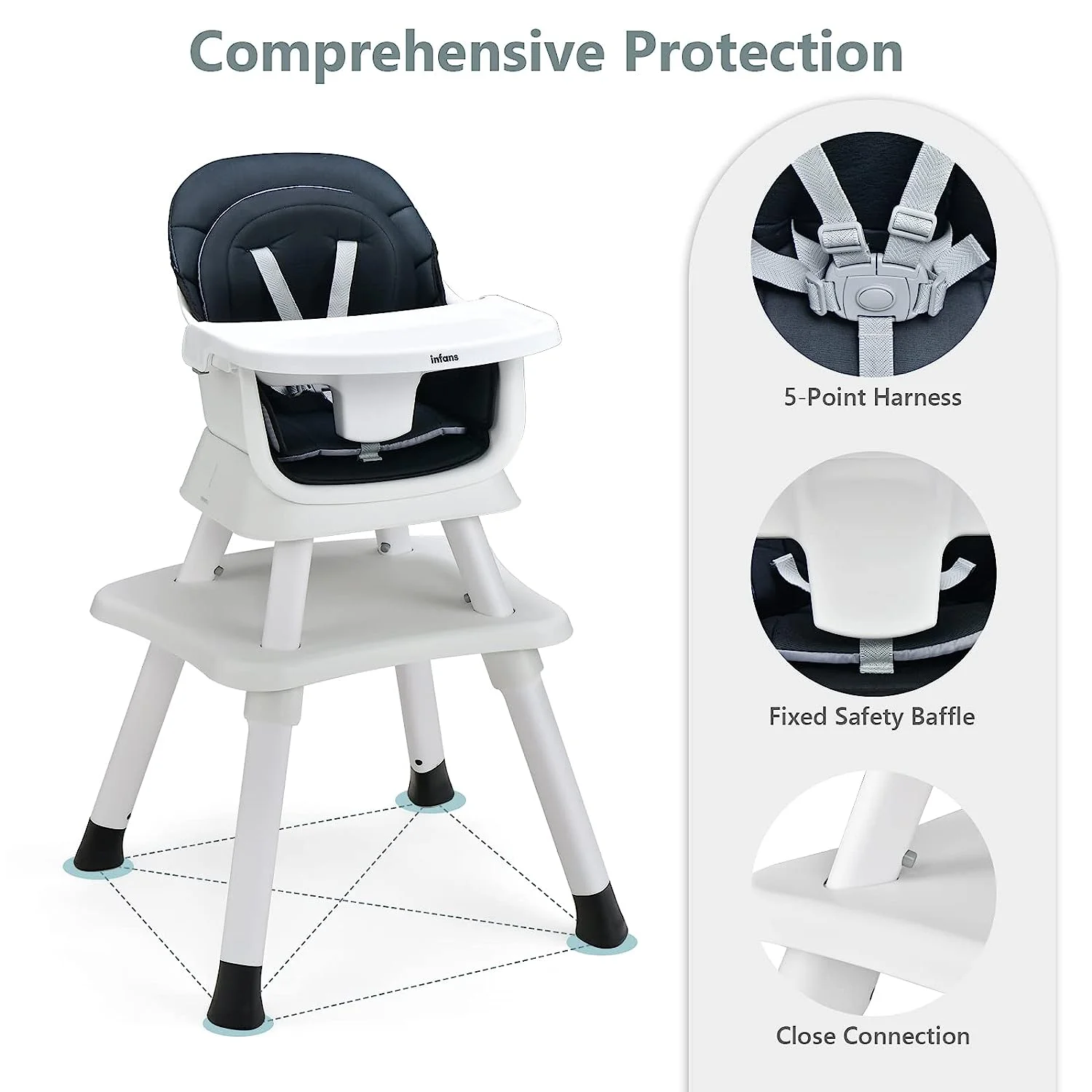 8 In 1 Convertible Design: OLAKIDS multifunctional baby highchair has a variety of modes to convert: traditional baby highchair, baby feeding chair, toddler booster seat, kids table and chair, studying table, ordinary stool, toddler chair, building block table, mini dining chair. Recommended age :6-36 months Max Weight Capacity: 55lbs. Safety First: To prevent the baby from falling off the chair, the multi-functional high chair is equipped with an adjustable 5-point harness with shoulder pads and a fixed safety baffle. Besides, the entire chair is a stable pyramid structure with non-slip pads for increased stability. Detachable & Adjustable Tray: The tray has 3 positions to adjust, you can easily adjust it when baby needs more free space. In addition, the tray is made of kids-friendly PP, which is safe and features great toughness. Easy to Install & Clean: The assembly of this dining chair is very simple. Most parts are connected by buckle-connected. Various modes of transformation are convenient and fast. moreover, the PU cushions and trays are removable for cleaning. Perfect Gift for Toddlers: This 7-in-1 baby highchair meets the various needs of the baby’s growth and change. The simple and modern style is suitable for all kinds of places. It’s the perfect holiday gift for baby.