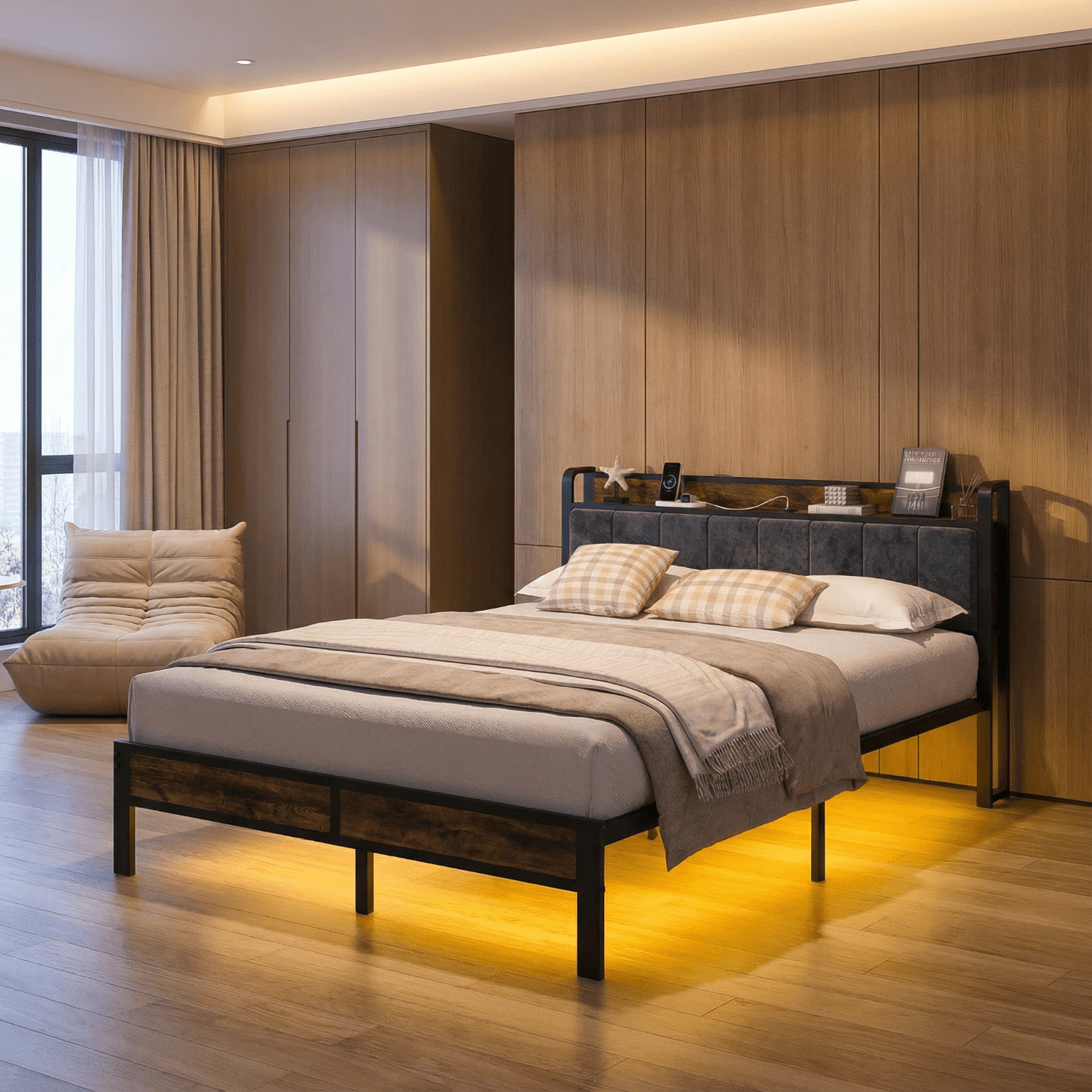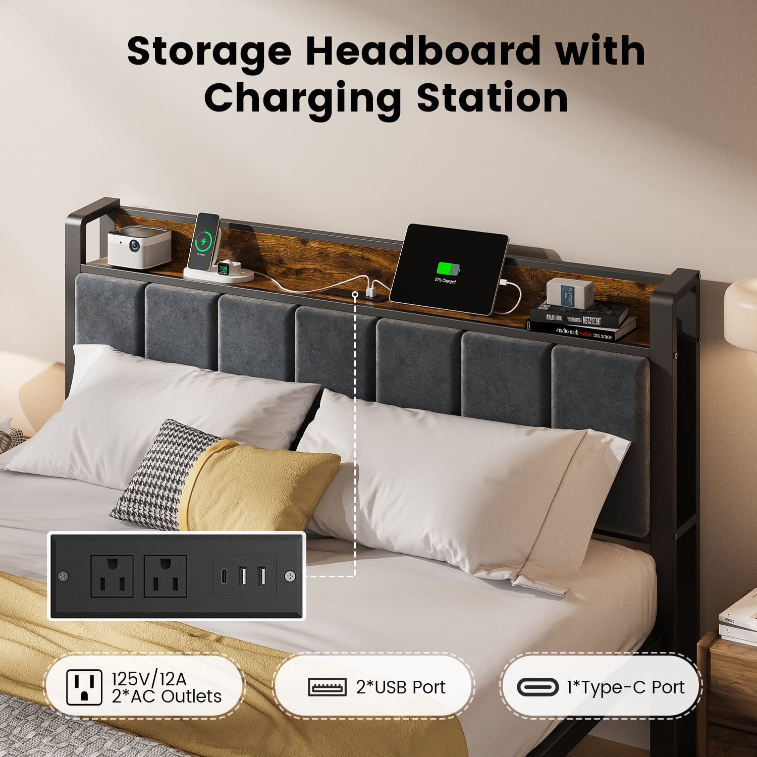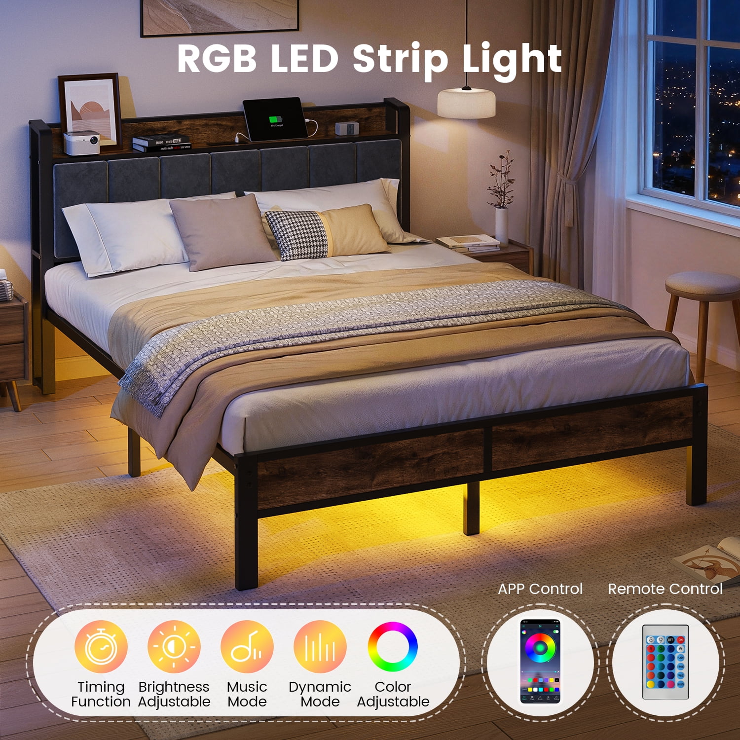 Integrated Charging System: Enjoy the convenience of a built-in charging station with 2 AC outlets, 2 USB ports, and 1 type-C port, allowing you to keep your devices powered and organized. Functional Storage Headboard: The integrated storage headboard provides a handy shelf for storing essentials like magazines, phones, and glasses, keeping your bedside clutter-free. Smart LED Ambient Lighting System: Elevate your bedroom’s ambiance with the under-bed LED lights, which can be customized using the included remote control to adjust the color, brightness, and lighting modes. Whisper-Quiet Sleep Technology: Experience a peaceful night’s sleep with the soundproof design, featuring a mute sponge bar that reduces friction between metal components, eliminating any creaky noises. Industrial-Grade Metal Construction: Crafted with an all-metal support system and 11 metal rods, this sturdy and durable queen bed frame can effortlessly support up to 1000 lbs without the need for a box spring. Vintage Modern Design: The 2-in-1 design combines a vintage-inspired shelf aesthetic with a comfortable, grey upholstered headboard, allowing you to seamlessly integrate this bed frame into any room style.