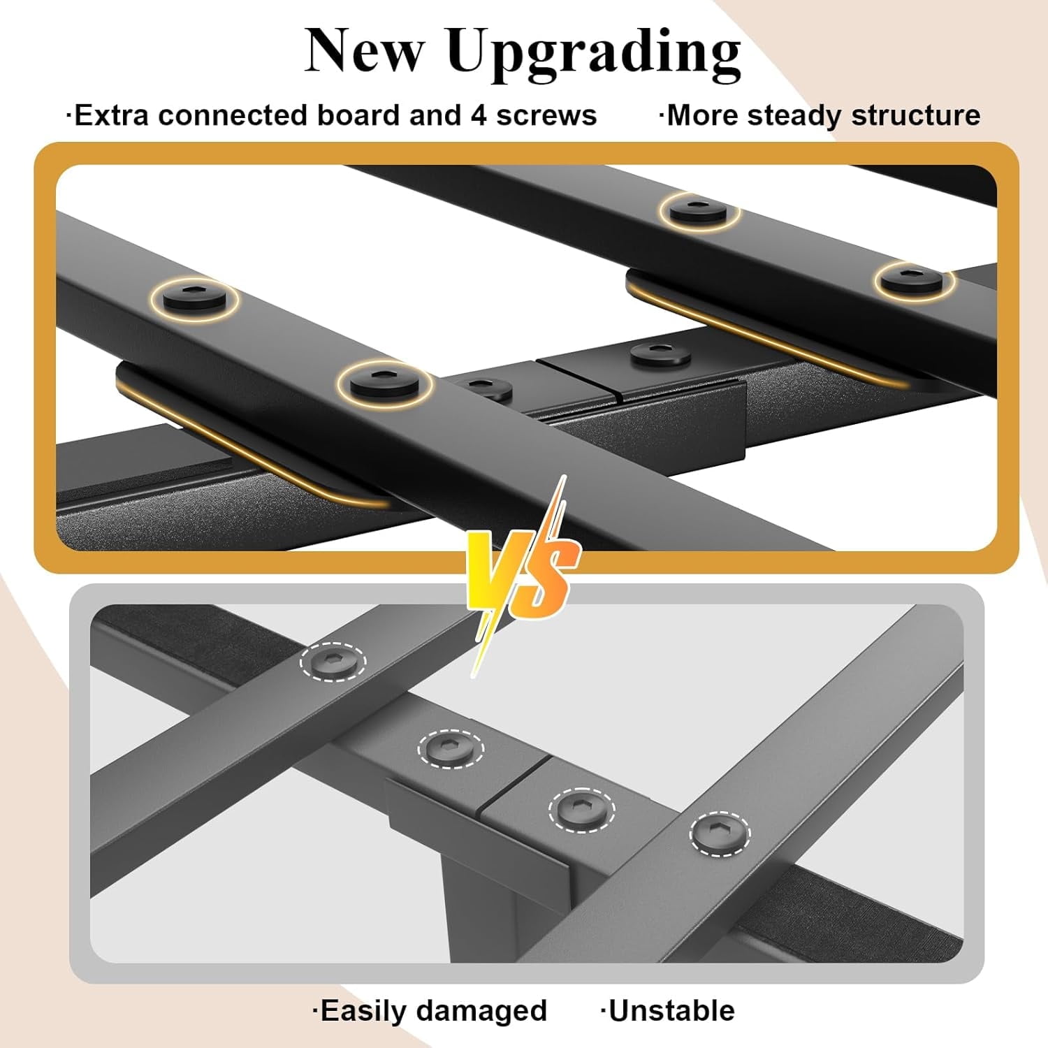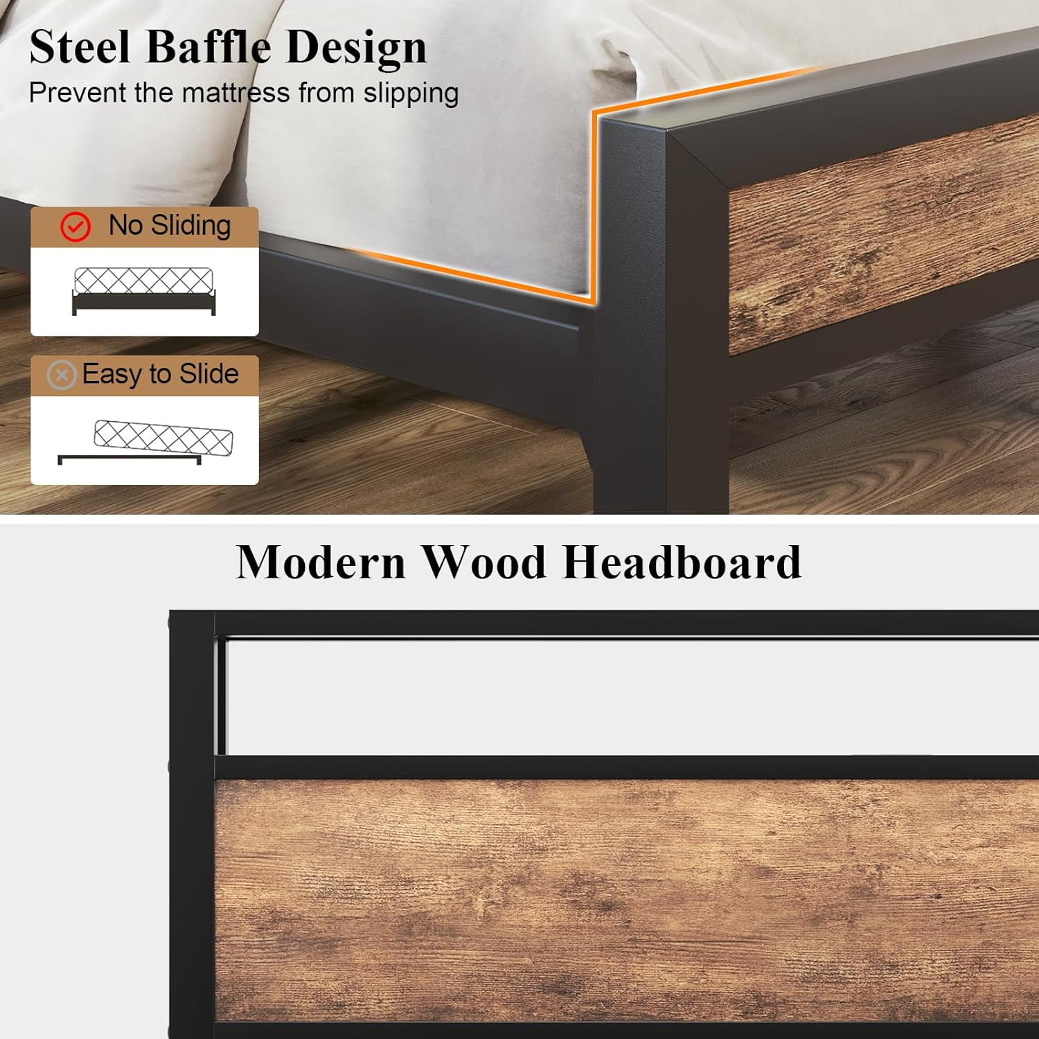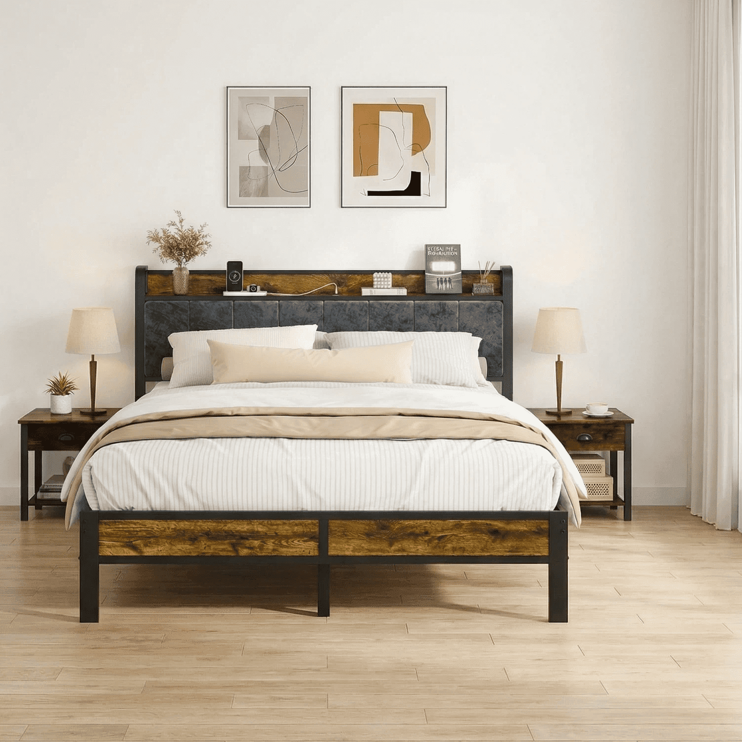Integrated Charging System: Enjoy the convenience of a built-in charging station with 2 AC outlets, 2 USB ports, and 1 type-C port, allowing you to keep your devices powered and organized. Functional Storage Headboard: The integrated storage headboard provides a handy shelf for storing essentials like magazines, phones, and glasses, keeping your bedside clutter-free. Smart LED Ambient Lighting System: Elevate your bedroom’s ambiance with the under-bed LED lights, which can be customized using the included remote control to adjust the color, brightness, and lighting modes. Whisper-Quiet Sleep Technology: Experience a peaceful night’s sleep with the soundproof design, featuring a mute sponge bar that reduces friction between metal components, eliminating any creaky noises. Industrial-Grade Metal Construction: Crafted with an all-metal support system and 11 metal rods, this sturdy and durable queen bed frame can effortlessly support up to 1000 lbs without the need for a box spring. Vintage Modern Design: The 2-in-1 design combines a vintage-inspired shelf aesthetic with a comfortable, grey upholstered headboard, allowing you to seamlessly integrate this bed frame into any room style.