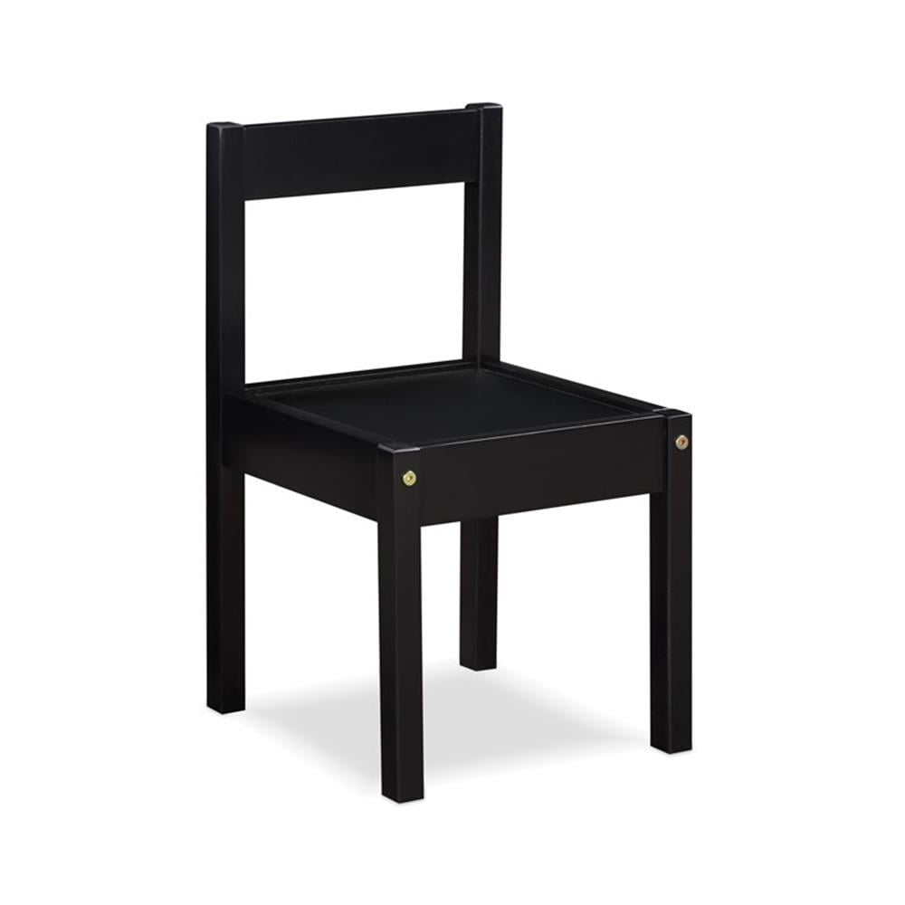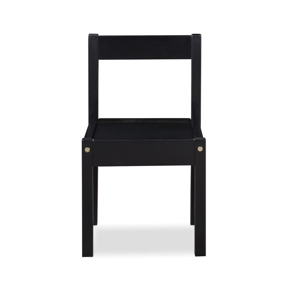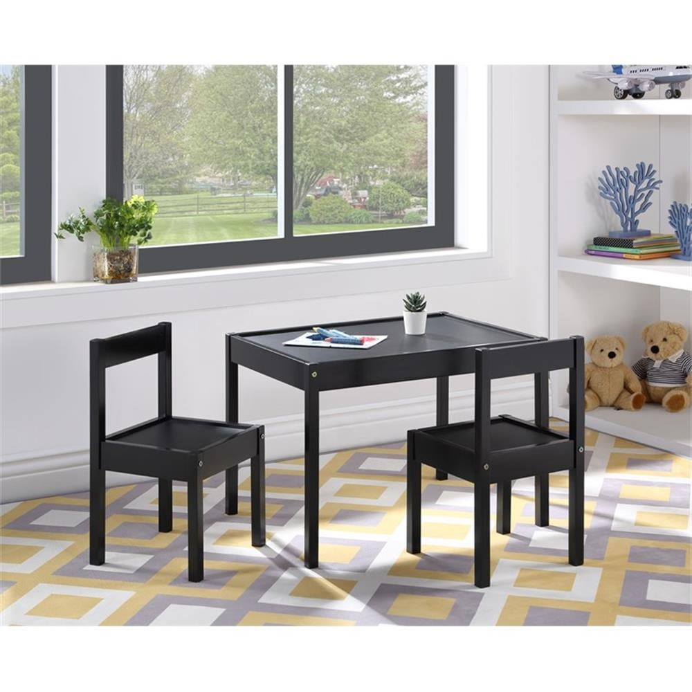 Materials: Wood Finish: Black Durable construction using solid wood that is kiln-dried to ensure quality and longevity Kid-safety finishes 2 Chairs included with table