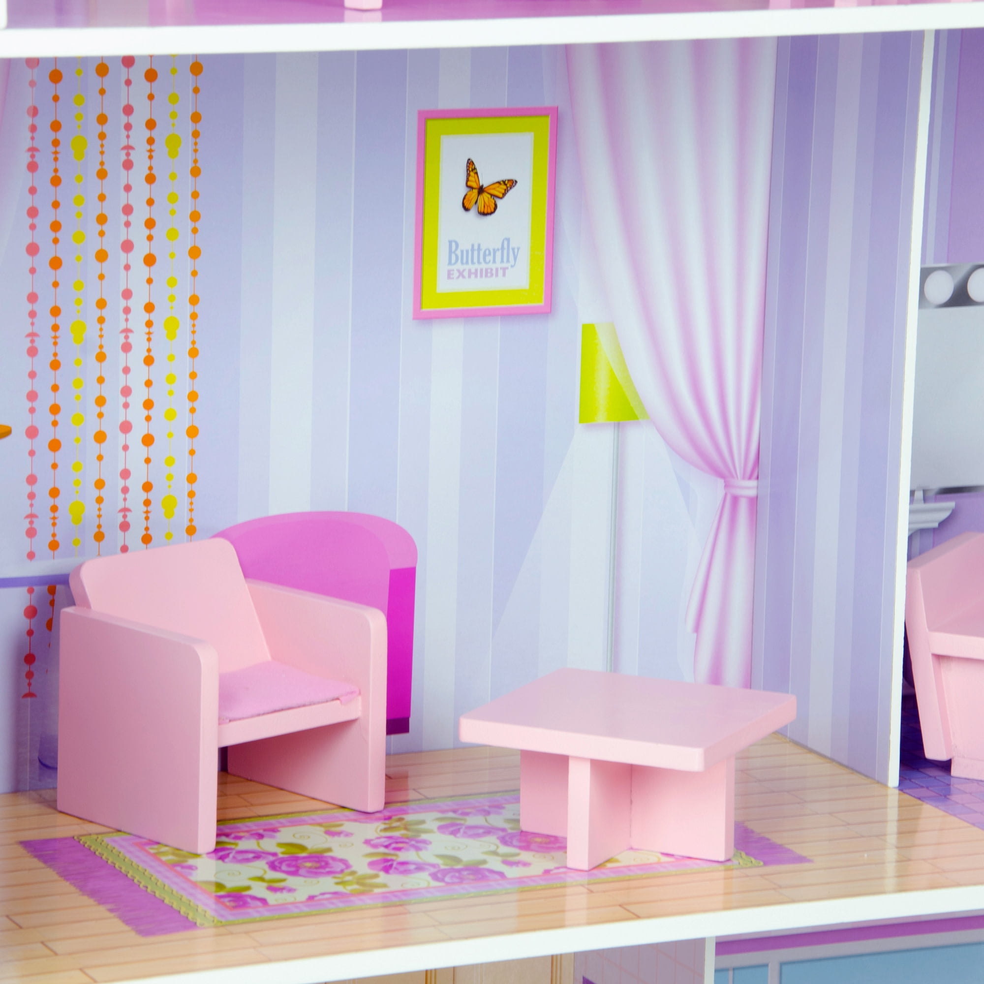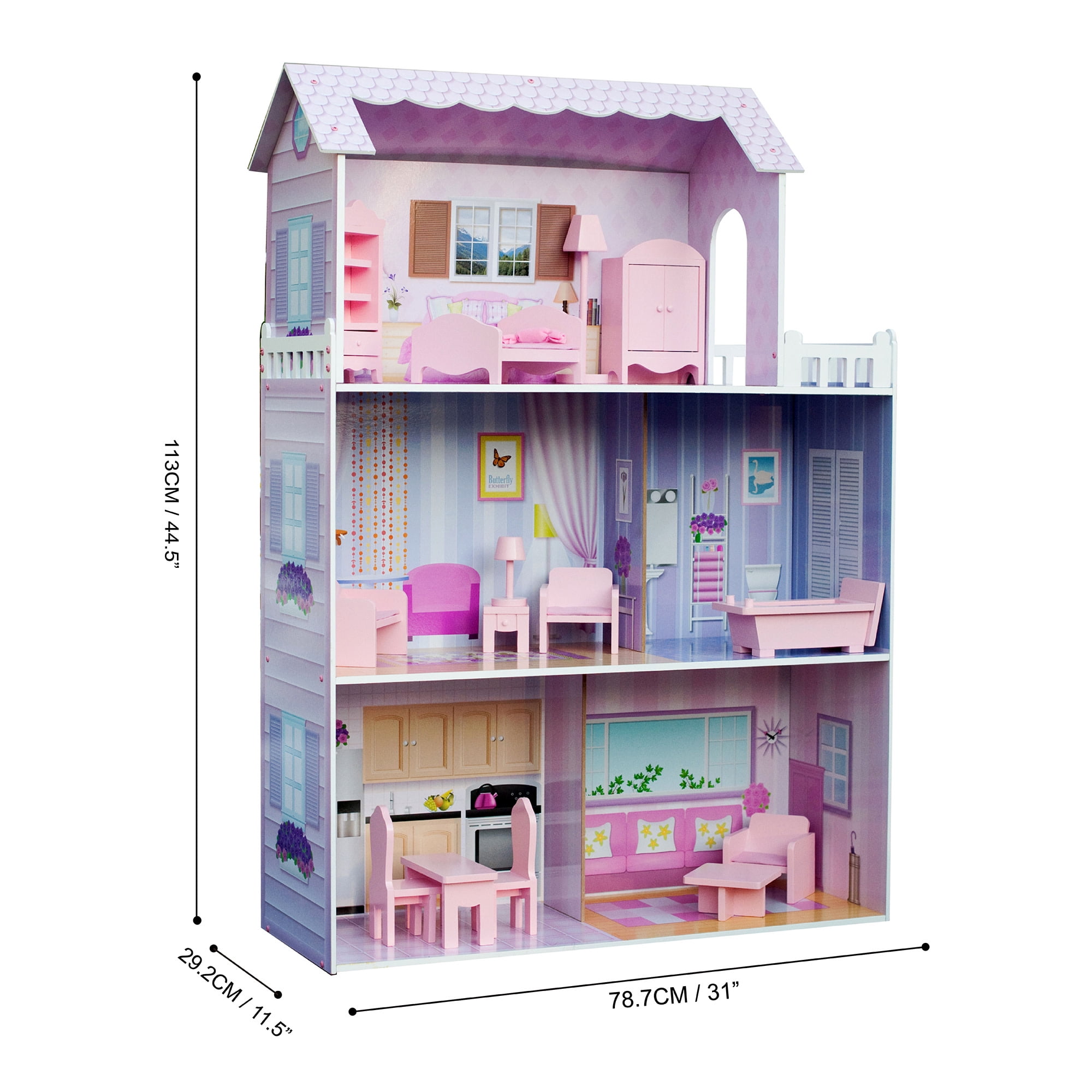 Victorian-style dollhouse with five rooms and a balcony for 12″ dolls Detailed inside and outside in a soft pink and purple palette, each room is decorated separately – different flooring, wall coverings, window treatments, etc. 14 pieces of furniture for the bedroom, living room, bathroom, and dining room; cushioned chairs and single bed with pillow Interactive pieces include a chifforobe that opens, open shelves in the curio cabinet Dimensions: 30.98″ L x 11.5″ W x 44.49″ H