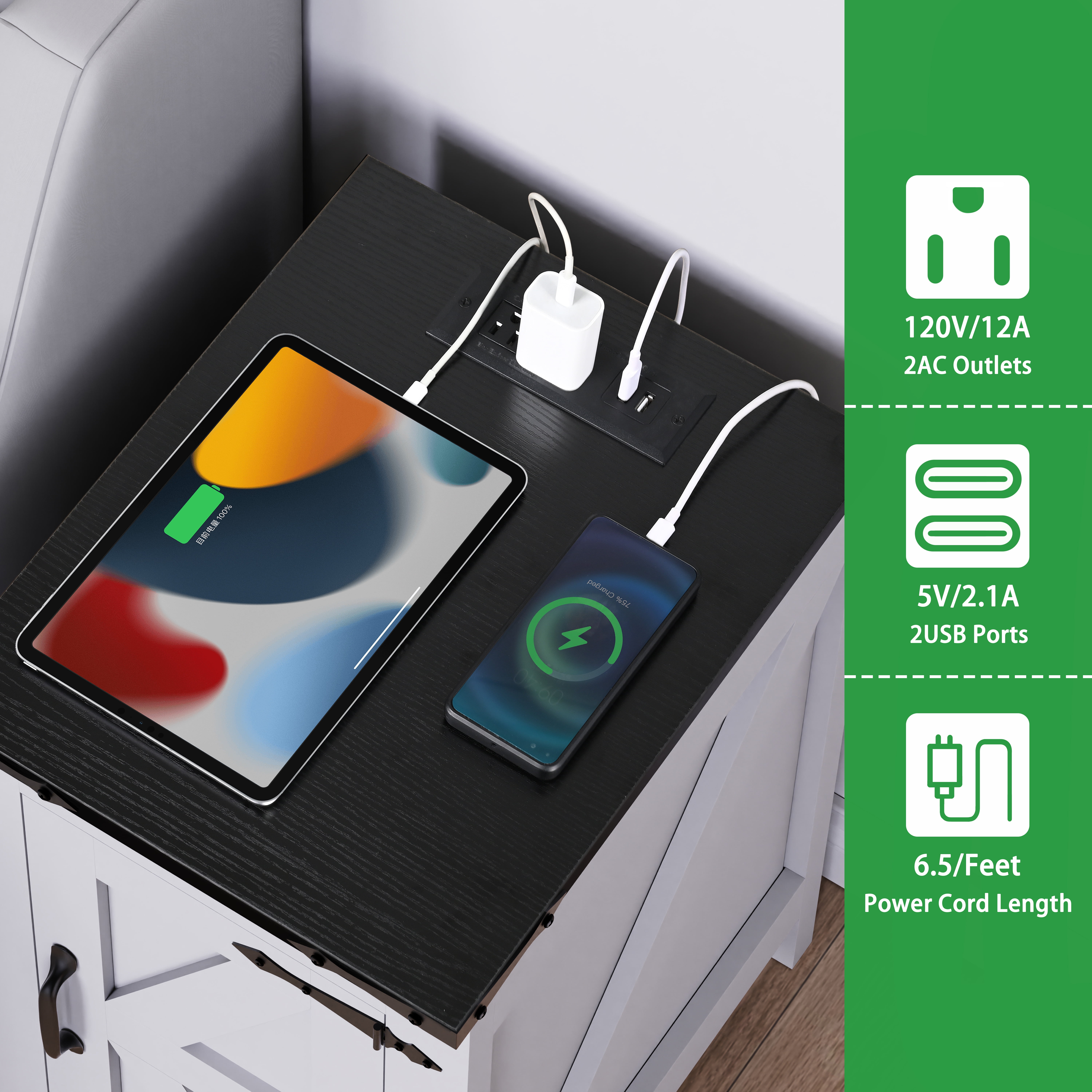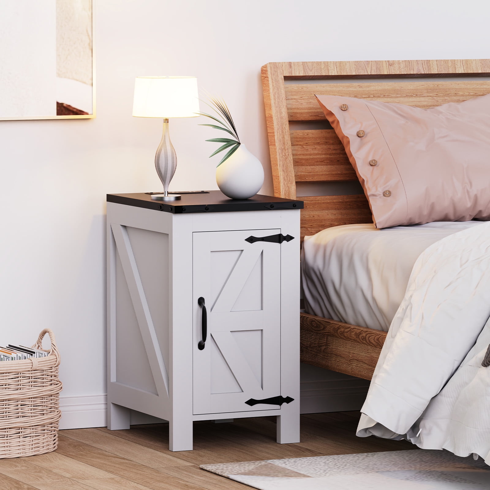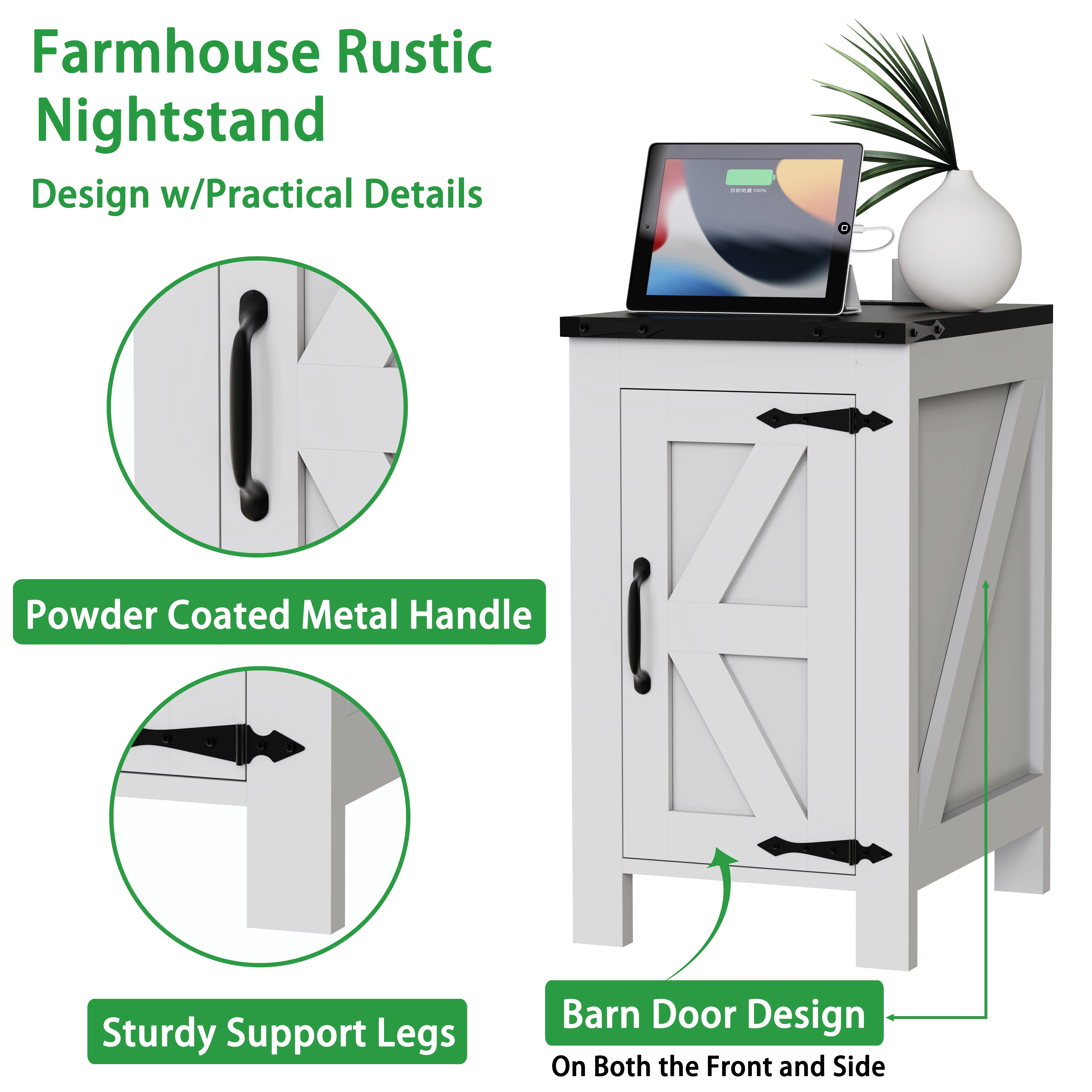Ollieroo Indoor Storage Wood Rectangle End Table, White Sofa Side Table with Storage: Features open shelves and hidden cabinets for ample storage space, perfect as an end table in your bedroom or a side table in your living room Farmhouse Coffee Table with a Barn Door: Unique barn-door pattern and metal corner decorations enhance the farmhouse aesthetic in your home Side Table with Charging Station: Equipped with 2 power outlets and 2 USB ports for fast charging of laptops, smartphones, and other devices Easy to Install: Overall dimensions: 14.2” W x 17.1” D x 25.1” H. Comes with clear, illustrated instructions and labeled parts for straightforward assembly Brand: Ollieroo