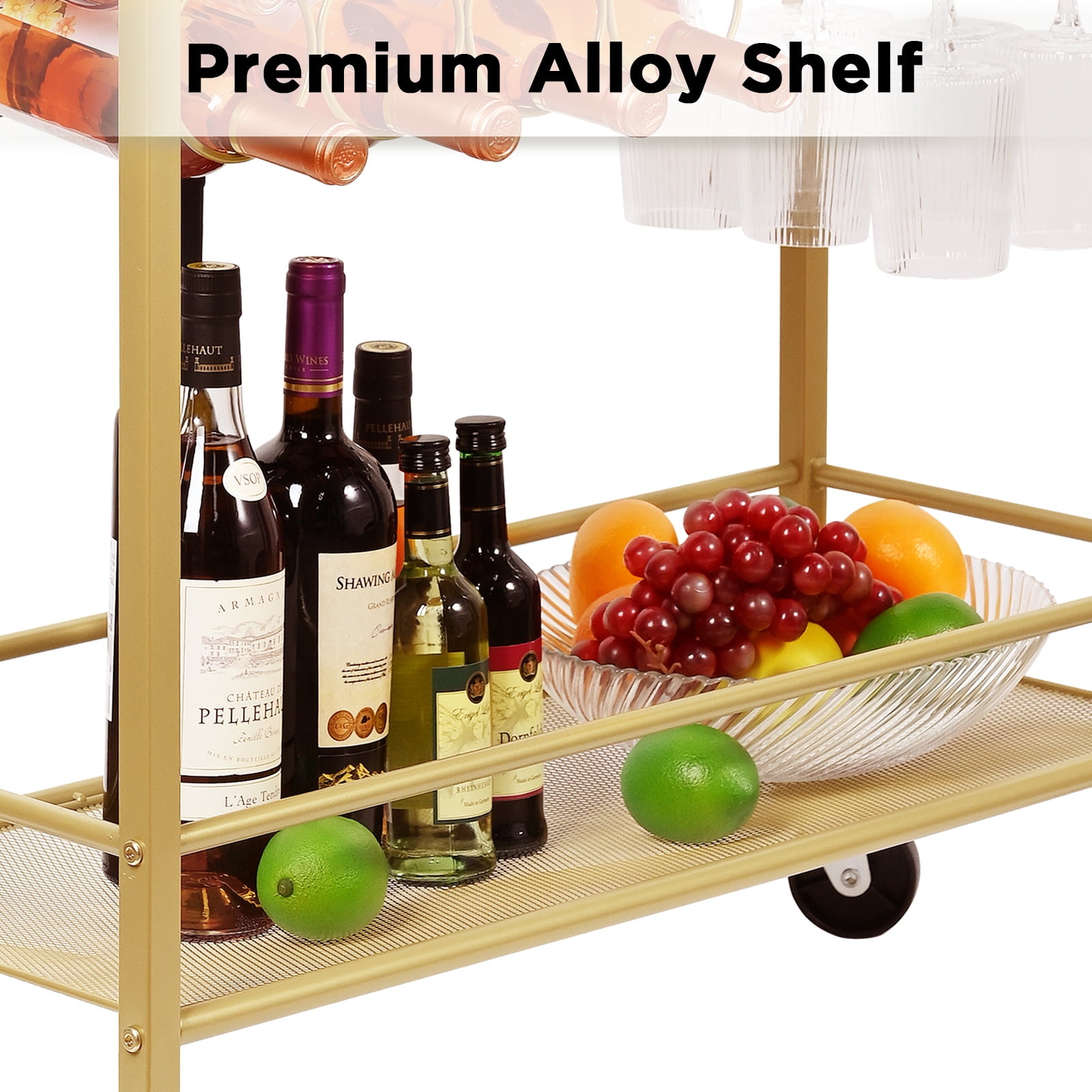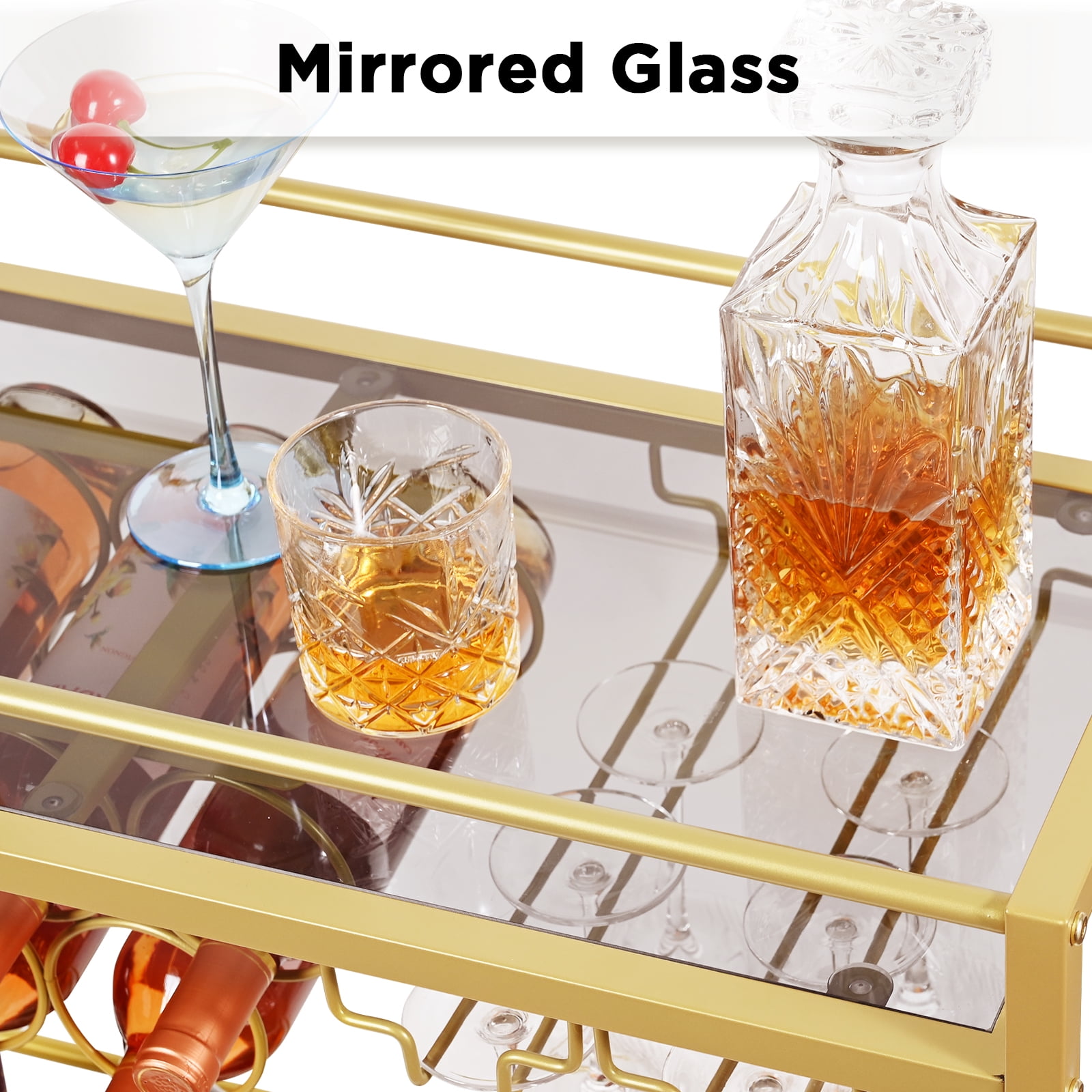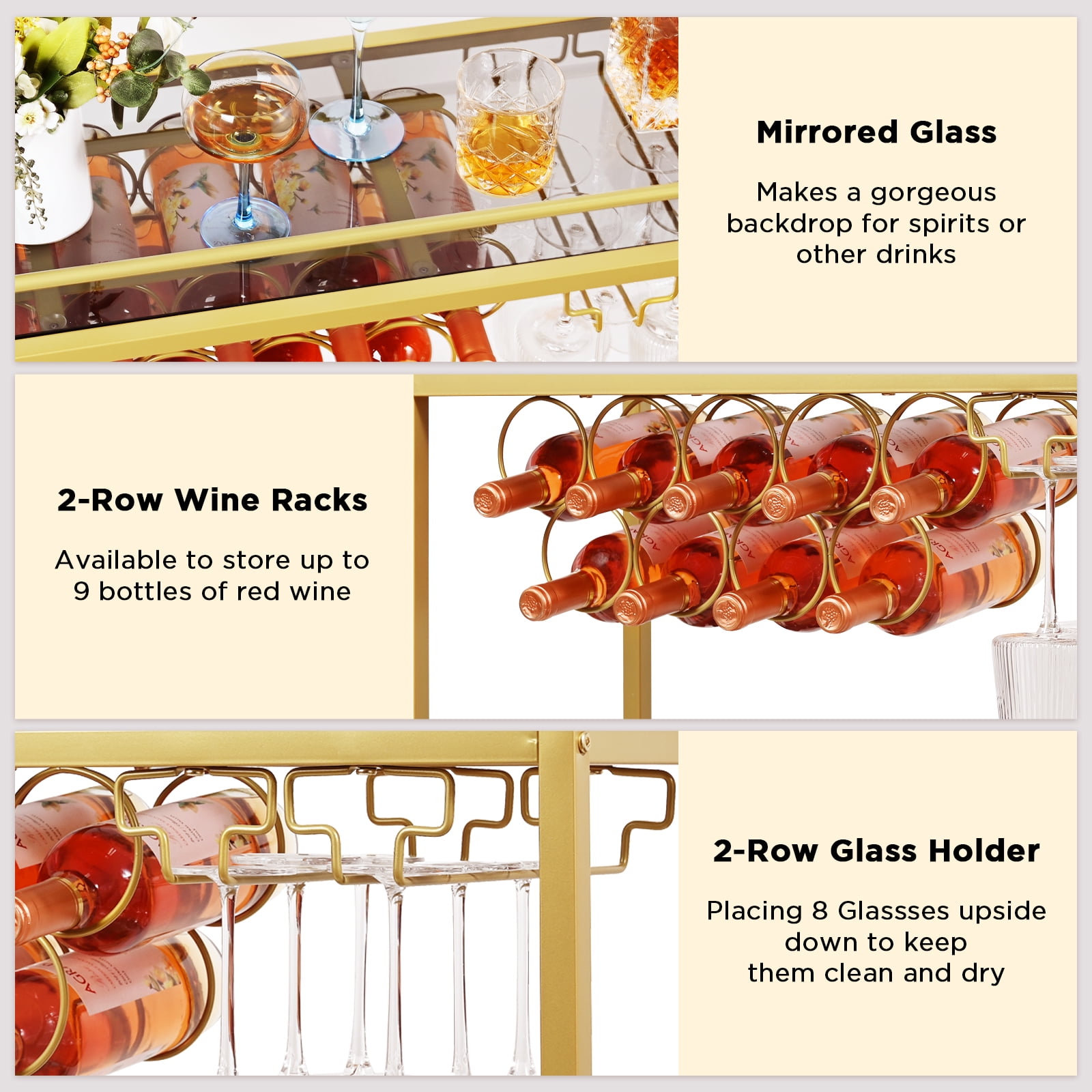 Ollieroo Rolling Kitchen Serving Carts with Wine Holder and Glass Holder Sturdy Material: Constructed with a thickened gold frame, top mirrored shelves, and a bottom metal shelf for durability and elegance Bar Rack with Wine Holder and Glass Holder: Dimensions: 314″ L x 13″ W x 36″ H Features 2-row wine racks for 9 bottles and 2-row glass holders for 8 glasses Kitchen Serving Cart: Equipped with wheels for easy movement; 2 wheels have braking functions for stability when stationary Easy to Assemble: Comes with clear, step-by-step illustrated instructions; all screws and parts are labeled for convenience With its chic appearance, this serving cart not only serves a practical purpose but also elevates your home decor, ensuring a delightful atmosphere for every meal