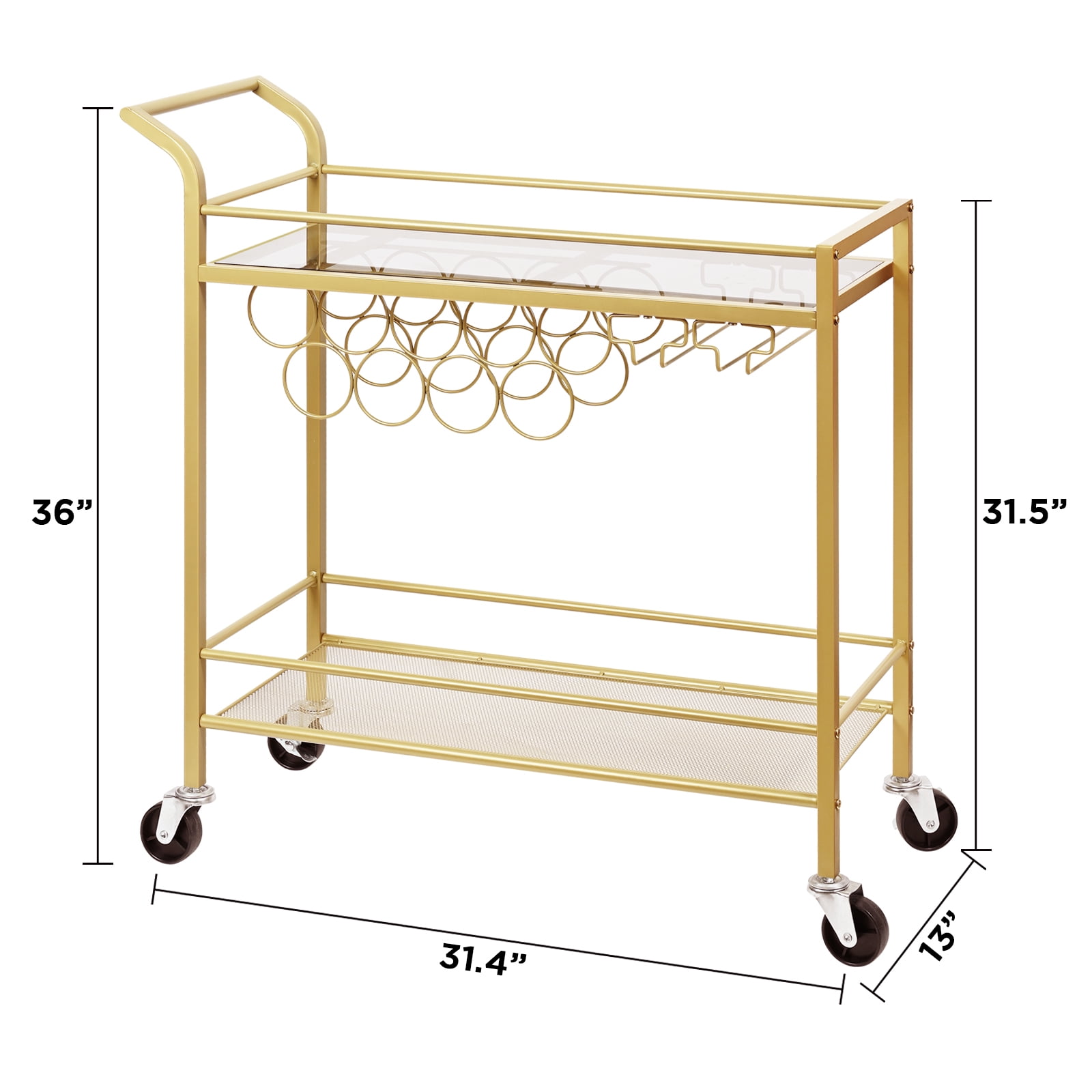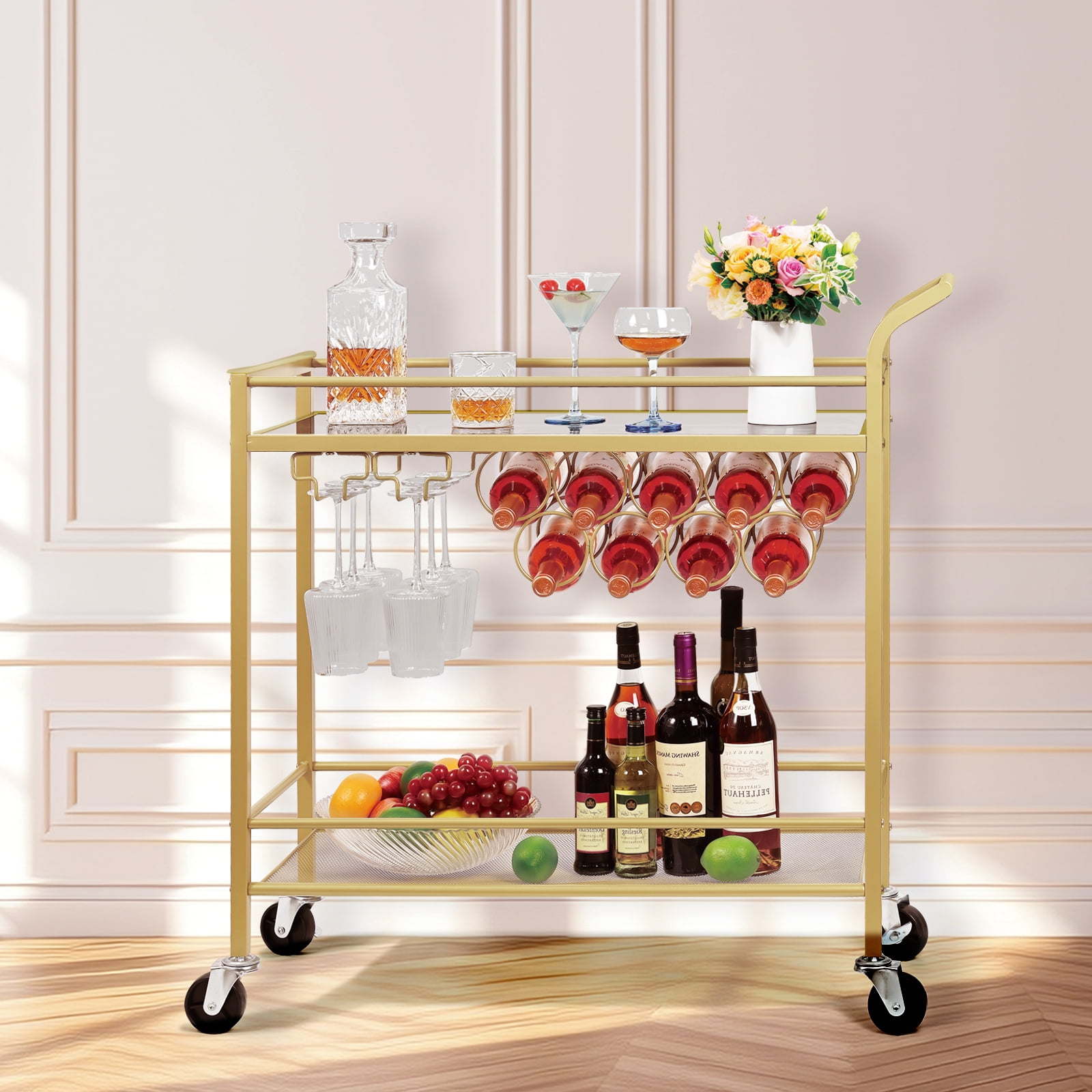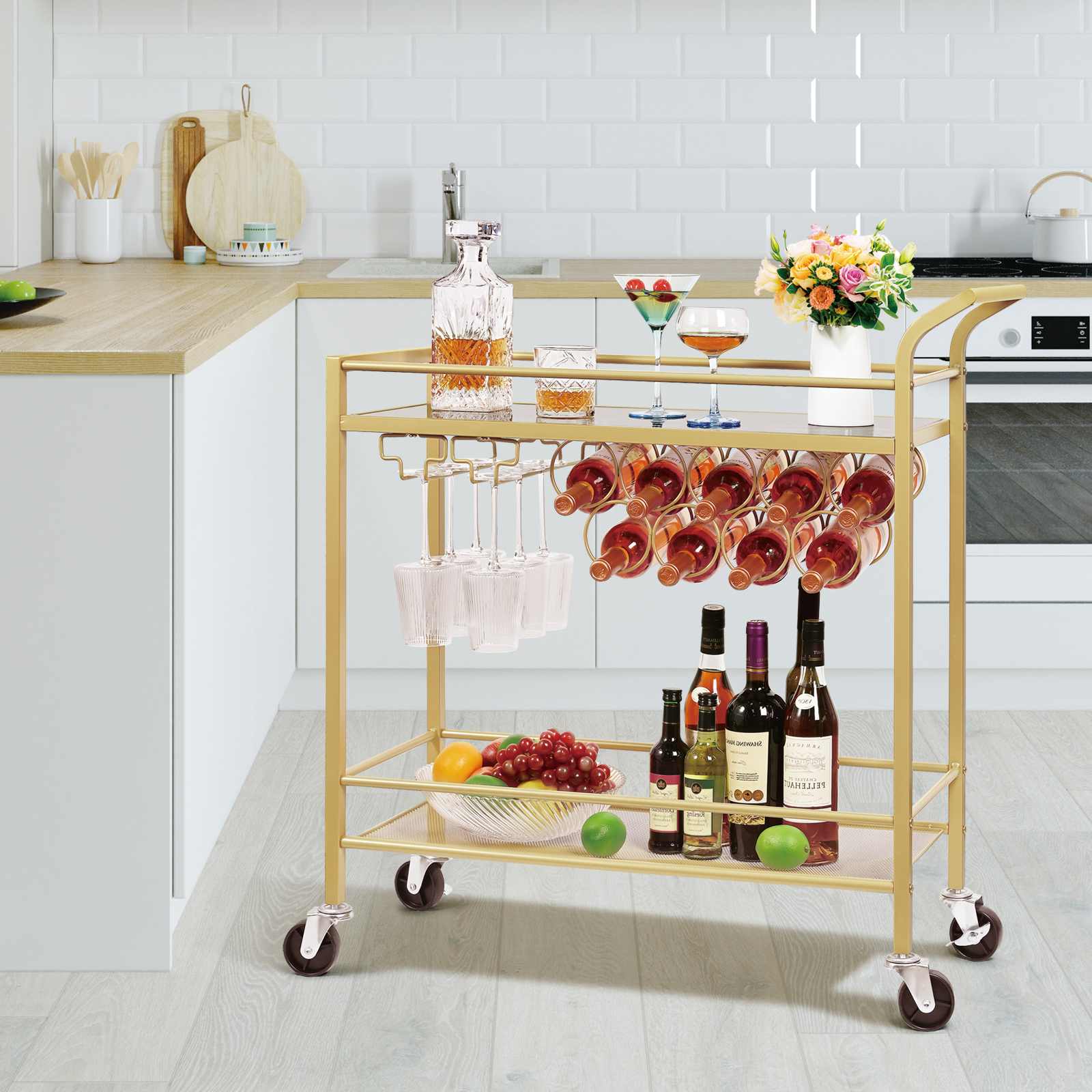 Ollieroo Rolling Kitchen Serving Carts with Wine Holder and Glass Holder Sturdy Material: Constructed with a thickened gold frame, top mirrored shelves, and a bottom metal shelf for durability and elegance Bar Rack with Wine Holder and Glass Holder: Dimensions: 314″ L x 13″ W x 36″ H Features 2-row wine racks for 9 bottles and 2-row glass holders for 8 glasses Kitchen Serving Cart: Equipped with wheels for easy movement; 2 wheels have braking functions for stability when stationary Easy to Assemble: Comes with clear, step-by-step illustrated instructions; all screws and parts are labeled for convenience With its chic appearance, this serving cart not only serves a practical purpose but also elevates your home decor, ensuring a delightful atmosphere for every meal