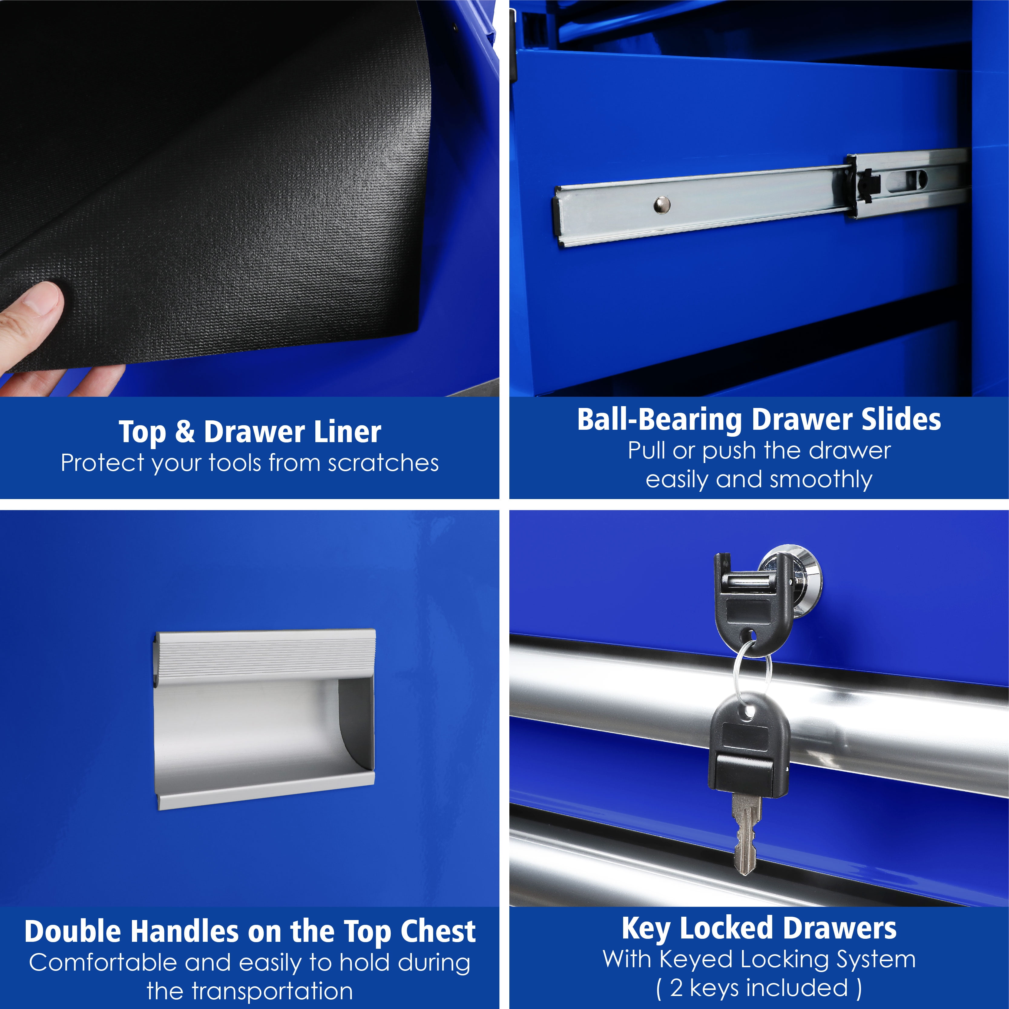 This tool chest includes 6 drawers and an upper tray that will expand your storage room, suitable for putting the different sizes of tool sets. Our 26-Inch Tool Chest applies an advanced lid system. Lid that features gas struts for improved safety when opening and closing. Make sure you are safe and well-being is our mission Drawers feature 100 lb load rated smooth ball bearing slides with hold-in detents, aluminum pulls, and matching non-slip drawer liners Internal locking bar and tubular cam lock system keeps all drawers and lid secure with the convenience of one key This portable tool box is great for home workshops and some professional environments, could be placed in the garage, workshop. The tool chest is an ideal gift for dad, husband, and machinist. Dimension: 26 in. W x 16 in. D x 20.5 in. H Top till: 26 in. W x 15.9 in. D x 3.1 in. H 2 small drawers: 10.6 in. W x 14 in. D x 2 in. H 2 medium drawers: 10.6 in. W x 14 in. D x 3.8 in. H 2 large drawers: 22.6 in. W x 14 in. D x 3.8 in. H