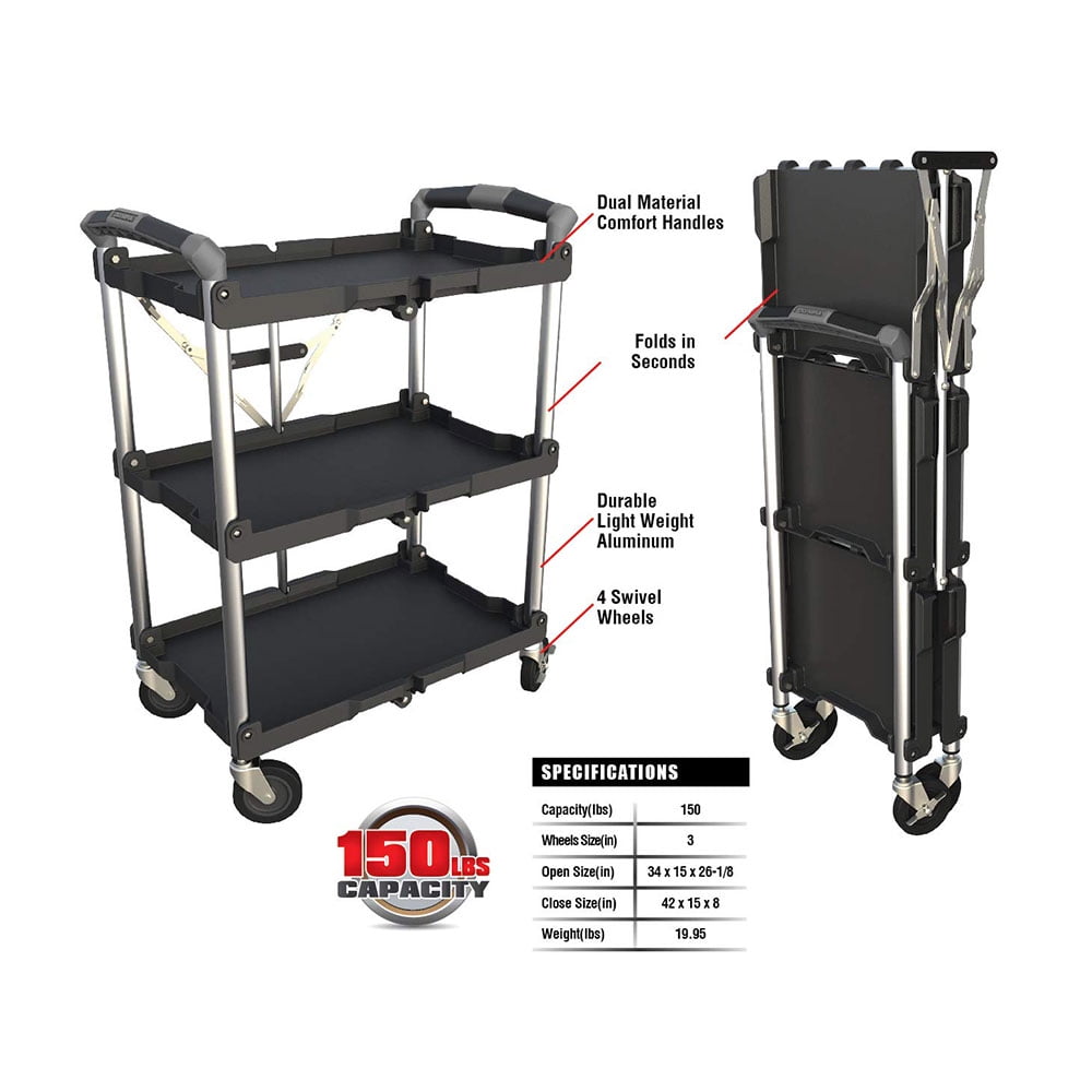 New, Olympia Tools Pack N Roll 3 Tier Collapsible Rolling Service Cart Easily transport your tools and equipment with help from this heavy-duty service cart Built with heavy-duty aluminum materials to support up to 150 pounds of total weight Designed with 3 spacious storage shelves for moving tools, equipment, supplies, and more Features secure safety locking bar, comfort-grip handles, and sleek modern design Folds compactly down to 8 inches wide for convenient storage and transportation Perfect for use on job sites, in schools, in offices, in libraries, for catering, and more Shelves: 3 Weight capacity: 150 pounds Wheel size: 3 inches Material: Aluminum Color: Black Closed dimensions (L x W x H): 15 x 8 x 42 inches Open dimensions (L x W x H): 15 x 26.13 x 34 inches Weight: 19.95 pounds