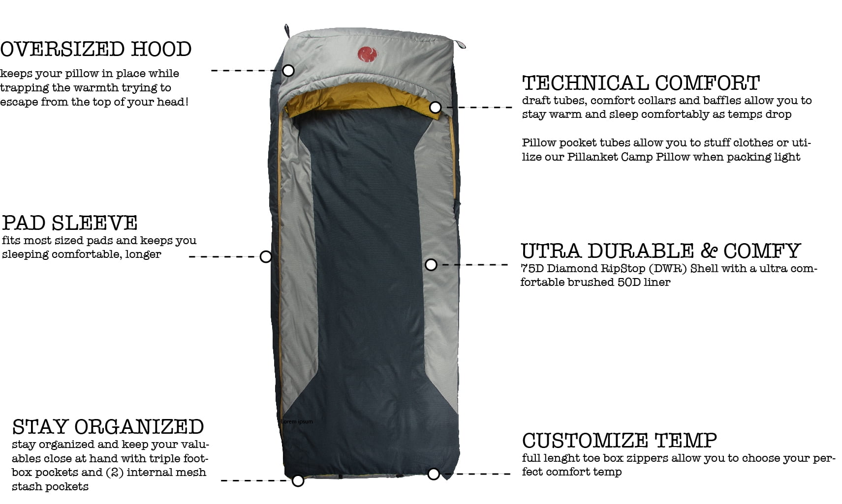 Mulit-DownInsulation to combine benefits of Duck Down and StratusLoft 3DConstruction to maximize insulation and comfort Ultra Durable and water resistant 75-denier Diamond Ripstop (DWR) Shell Hooded traps the heat radiating away through your head Pillow Pocket allows you to stuff clothes or keeps the camp pillow (sold separately) in place Draft tubes, collarsand baffles to trap the warm air in and keep cold air out Stash Pockets: (2) internal mesh and (3) zipper external keeps things organized Sleeping Pad Sleeve will keep you from rolling off your pad at night Compression sack to keep the bag smallfor ease of transport Storage sack included to let the down breathe and keep its insulating properties