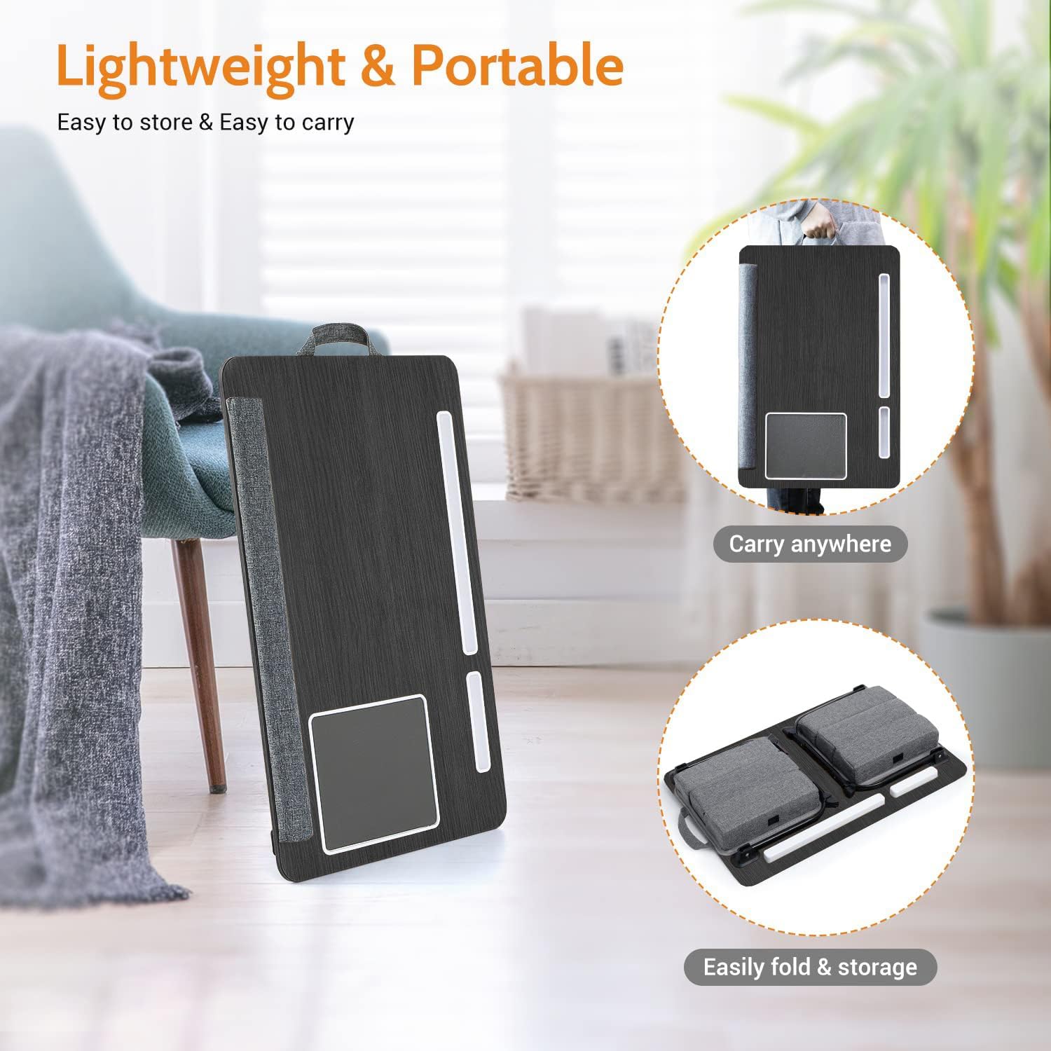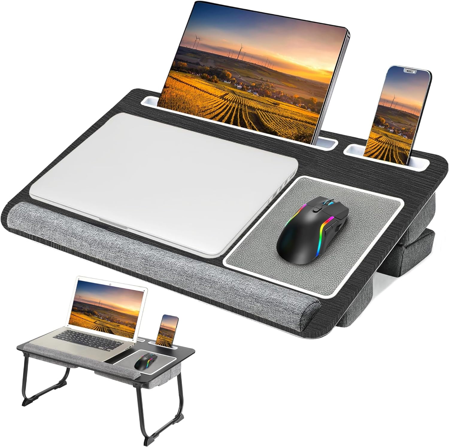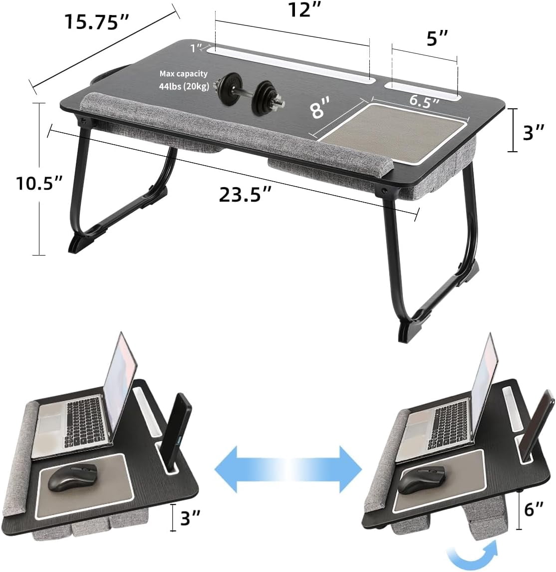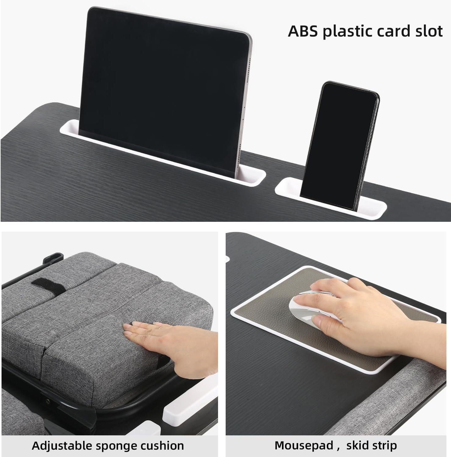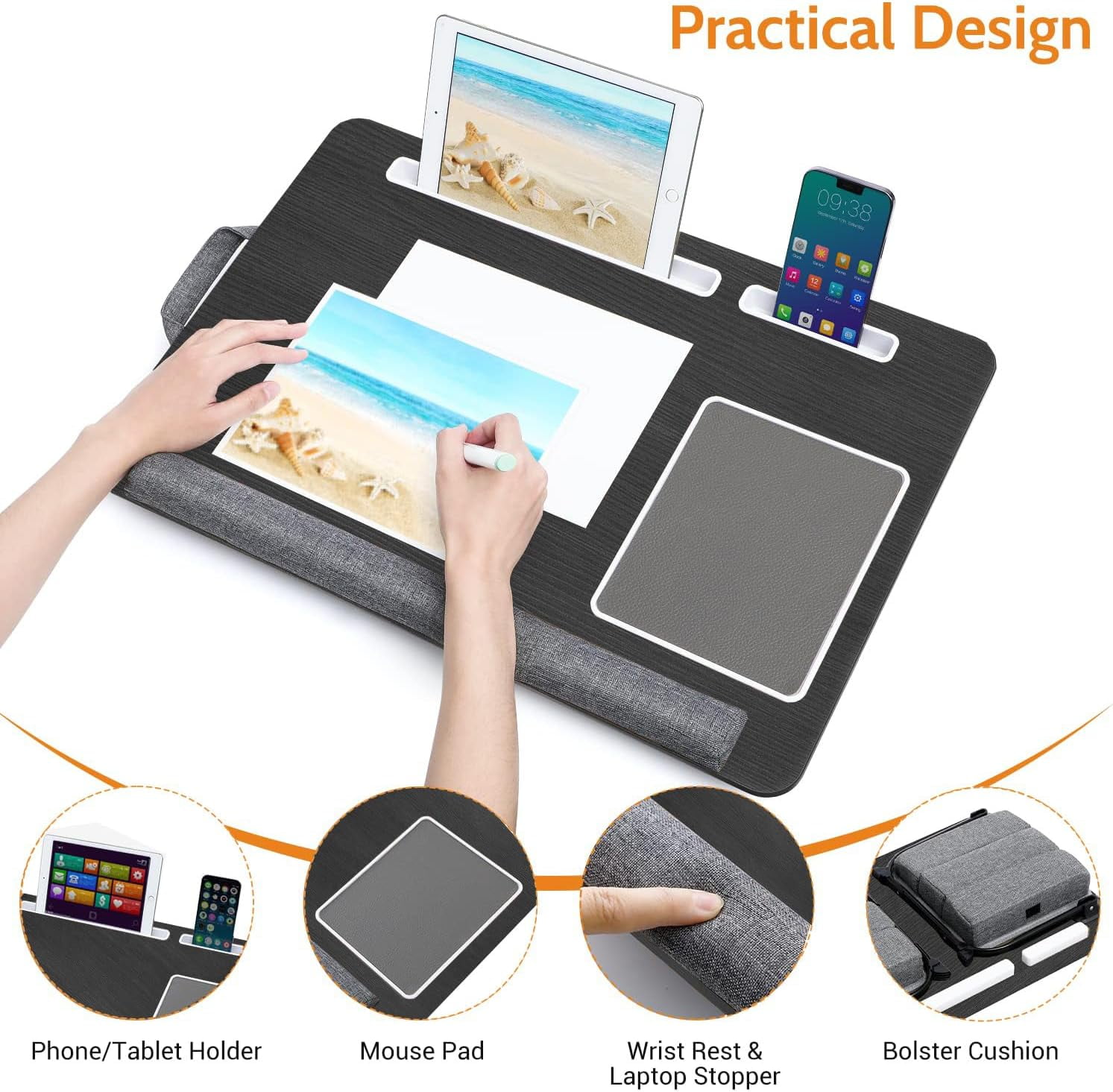 Portable Multifunctional Laptop Lap Desk The powerful laptop lap desk allows you to use it anywhere, such as sofa, bed, couch, recliner, desk, etc. The additional features of wrist pad, tablet slot, phone holder and mouse pad allow you to increase the comfort of using table in your work, and at the same time, inadvertently allow you to improve the efficiency of your work. Specifications: Color: Black Size: 15.7″D x 23.6″W x 10.3″H Features: Wrist Pad,Tablet Slot & Phone Holder,Mouse Pad Suitable Laptop Size: Fits up to 17inch Use: Working, reading, writing, drawing, watching Occasion: Sofa, bed, couch, recliner, desk Mode of use: (1) Laptop Bed Tray Table: Open the legs of the table and use it, the large space under the table allows you to stretch your legs freely. (2) Lap Desk: Adjust the angle of the pillow cushion and use it on your legs, the soft booster cushion can relieve leg discomfort and reduce leg pressure. Mouse Pad Built-in leather mouse pad measuring 7.6 x 6.1 inches for mouse navigation. Wrist Pad The wrist pad is cushioned with soft sponge material that can relieve wrist pain and prevent your laptop from slipping. Booster Cushion The booster cushion unfolds to give you the best view of the screen. Tablet Slot & Phone Holder Comes with a tablet and phone holder that helps to keep your devices within reach when you need them.