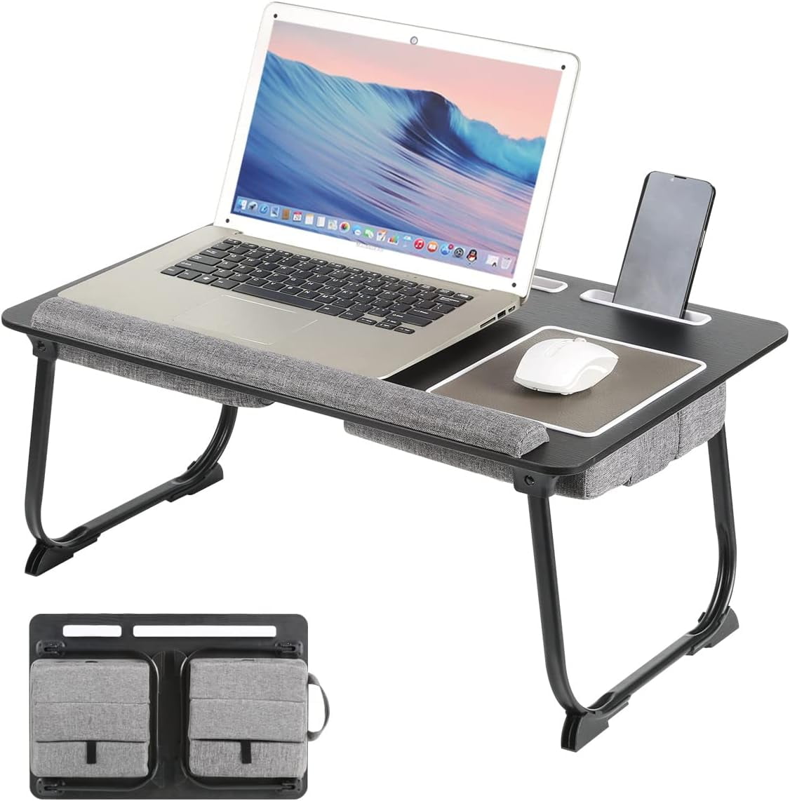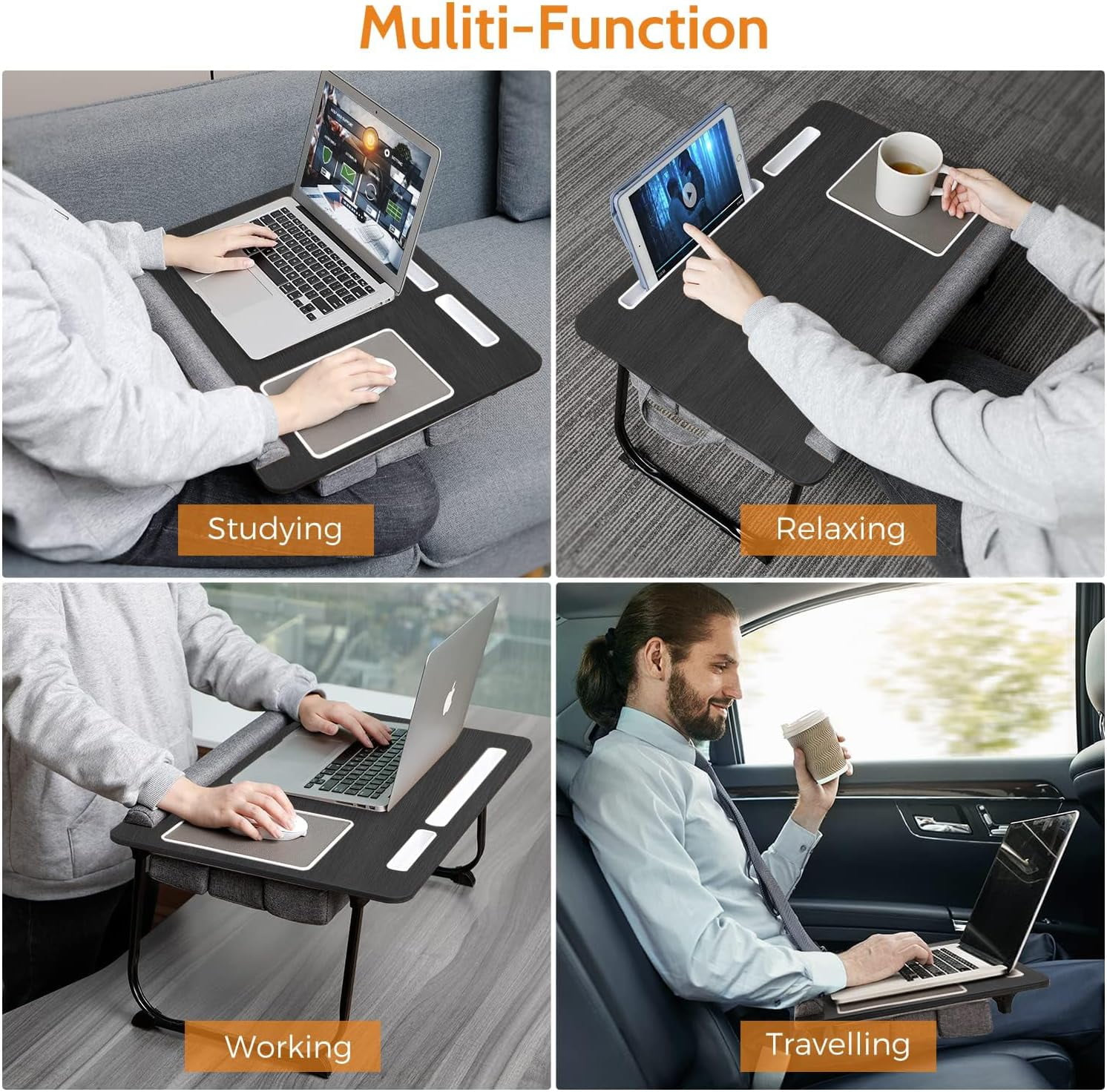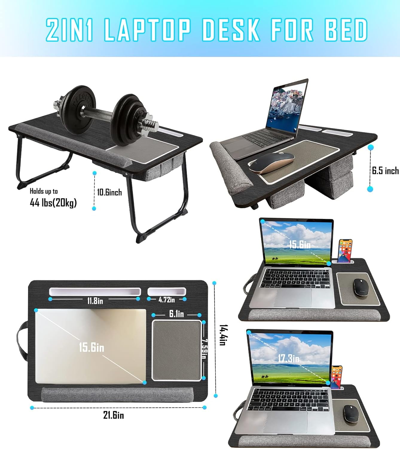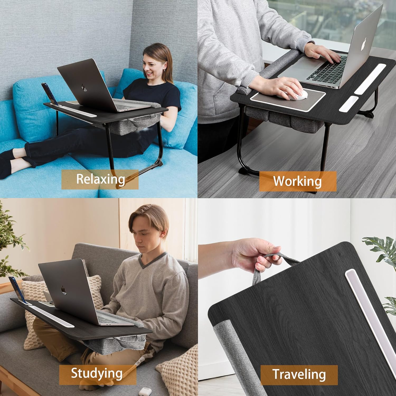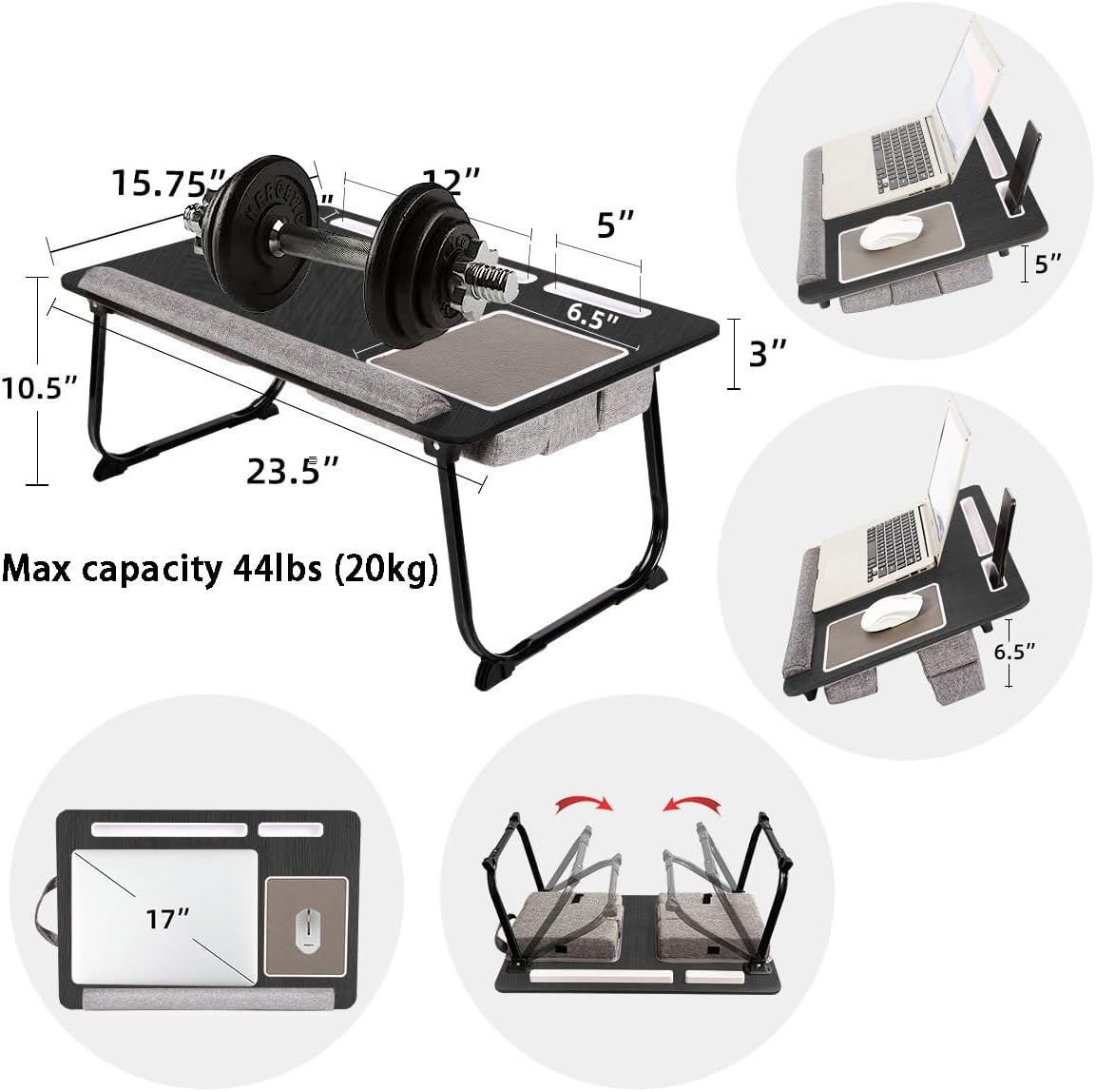 Portable Multifunctional Laptop Lap Desk The powerful laptop lap desk allows you to use it anywhere, such as sofa, bed, couch, recliner, desk, etc. The additional features of wrist pad, tablet slot, phone holder and mouse pad allow you to increase the comfort of using table in your work, and at the same time, inadvertently allow you to improve the efficiency of your work. Specifications: Color: Black Size: 15.7″D x 23.6″W x 10.3″H Features: Wrist Pad,Tablet Slot & Phone Holder,Mouse Pad Suitable Laptop Size: Fits up to 17inch Use: Working, reading, writing, drawing, watching Occasion: Sofa, bed, couch, recliner, desk Mode of use: (1) Laptop Bed Tray Table: Open the legs of the table and use it, the large space under the table allows you to stretch your legs freely. (2) Lap Desk: Adjust the angle of the pillow cushion and use it on your legs, the soft booster cushion can relieve leg discomfort and reduce leg pressure. Mouse Pad Built-in leather mouse pad measuring 7.6 x 6.1 inches for mouse navigation. Wrist Pad The wrist pad is cushioned with soft sponge material that can relieve wrist pain and prevent your laptop from slipping. Booster Cushion The booster cushion unfolds to give you the best view of the screen. Tablet Slot & Phone Holder Comes with a tablet and phone holder that helps to keep your devices within reach when you need them.
