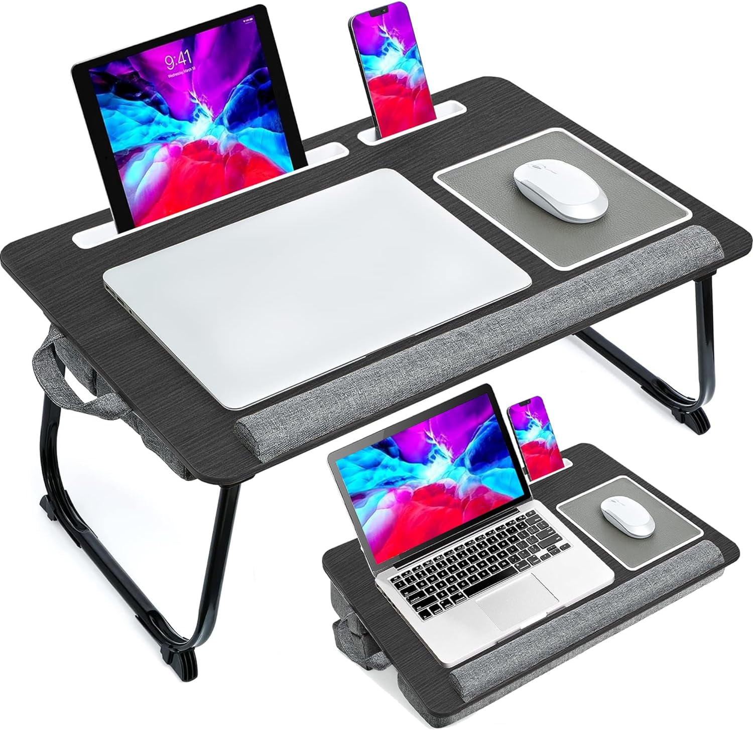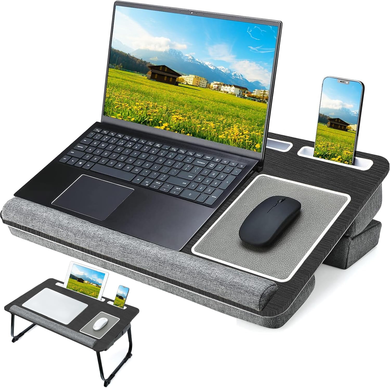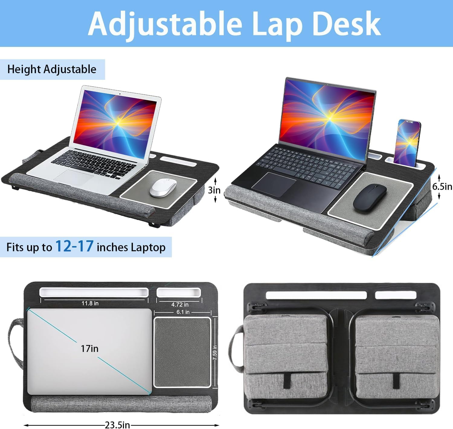 Omumuo Lap Desk with Adjustable Dual Cushion, 23.5″ x 15.75″, Black Multi-functional Design: The OMUMUO Laptop Lap Desk features a unique 2-in-1 design with adjustable height, making it suitable for various uses, including as a laptop tray table for beds Spacious Surface: Measuring 23.6 x 15.7 inches, this lap desk accommodates laptops up to 17.3 inches and includes slots for tablets and phones, enhancing your workspace Versatile Usage: Ideal for working, studying, or relaxing, this lap desk can be used on a couch, bed, or floor, providing comfort and support wherever you are Ergonomic Cushioning: Designed with a high-density sponge cushion that conforms to your legs and wrists, effectively relieving pressure during extended use Easy to Use: No installation required; simply unfold the legs for immediate use. The desk features three adjustable height settings for personalized comfort Perfect Gift: A thoughtful gift for office workers, writers, or students, this lap desk combines functionality with a modern aesthetic, suitable for various occasions
