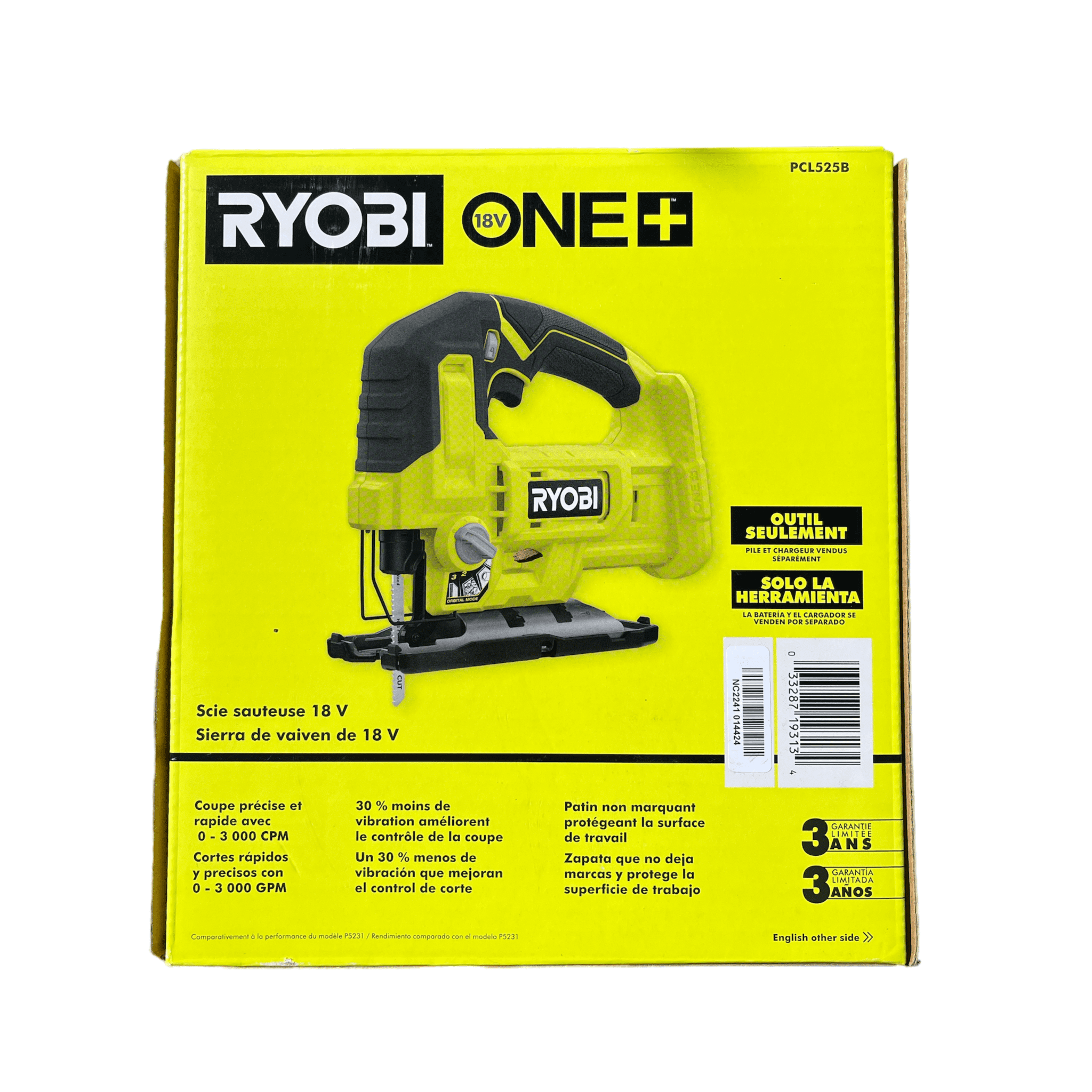 Fast, Precise Cutting 0-3,000 SPM Non-Marring Shoe Protects Work Surface Over 280 ONE+ Products – All Work With Any RYOBI ONE+ 18V Battery Brand New in Box Model#: PCL525B Expand your RYOBI 18V ONE+ System with the RYOBI 18V ONE+ Cordless Jig Saw. The variable speed trigger provides fast, precise cuts with up to 3,000 SPM. With 30% less vibration, users will have ultimate cut control and reduced fatigue. Blade changes are quick and easy with tool-free blade release. This cordless jig saw is feature packed with 4 orbital settings, on board LED worklight, and non-marring shoe. This 18V ONE+ Cordless Jig Saw accepts and comes with a T-Shank wood cutting blade. Best of all, it is part of the RYOBI ONE+ System of over 280 Cordless Products that all work on the same battery platform. This 18V ONE+ Cordless Jig Saw ncludes (1) PCL525 18V ONE+ Cordless Jig Saw, (1) Non-Marring Shoe, (1) T-Shank Wood Cutting Blade, (1) Hex Wrench and Operator’s Manual. Battery and charger sold separately. Fast, precise cutting with 0 – 3,000 SPM 30% reduced vibration enhances cut control Non-marring shoe protects work surface Quick and easy blade changes with tool-free blade release Variable speed trigger for precise speed control 4 orbital settings to match power to application On-board LED worklight Base adjusts from 0° to 45° right or left Part of the RYOBI 18V ONE+ System of Over 280 Cordless Products Includes: PCL525 18V ONE+ Cordless Jig Saw, Non-Marring Shoe, T-Shank Wood Cutting Blade, Hex Wrench, and Operator’s Manual Battery and charger sold separately