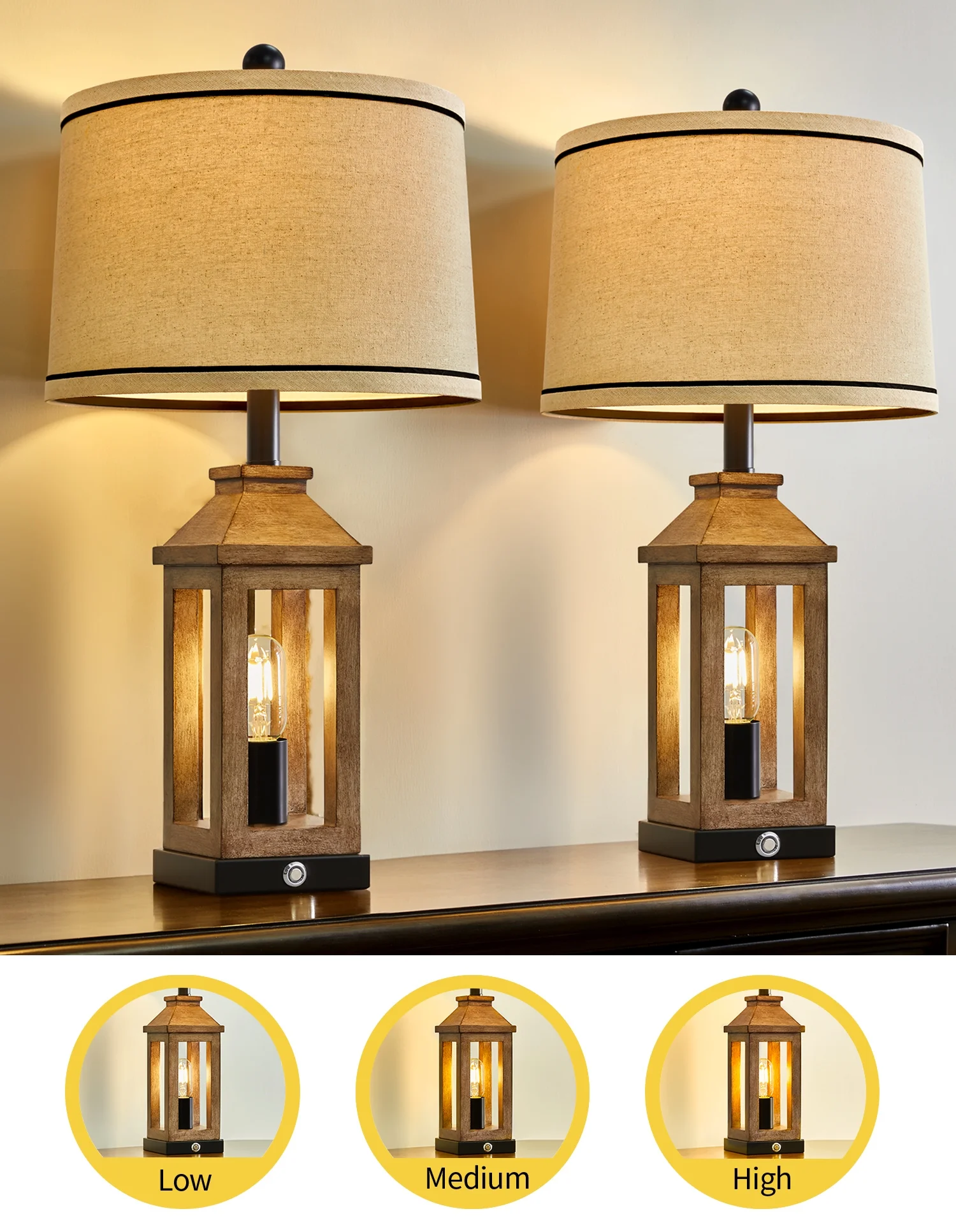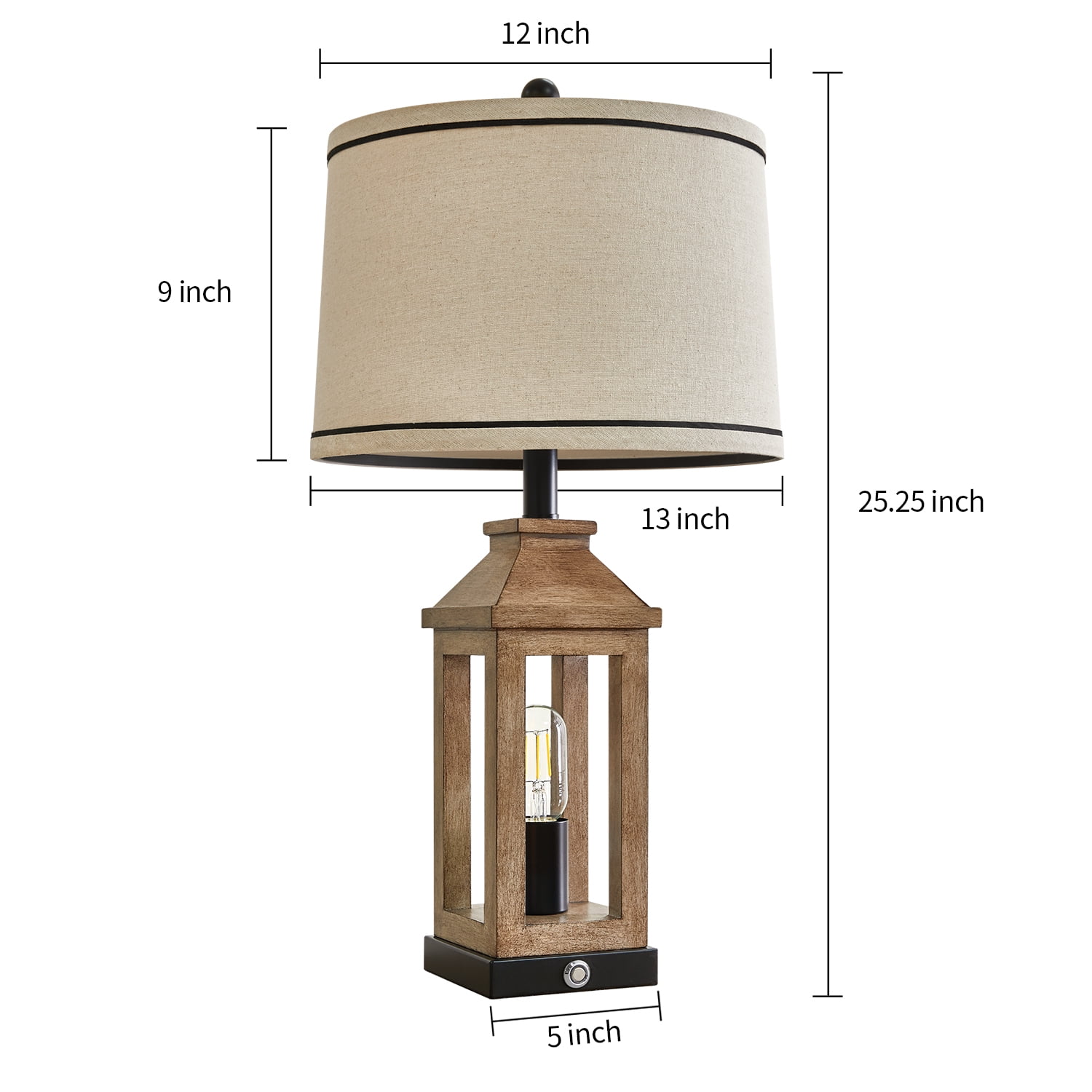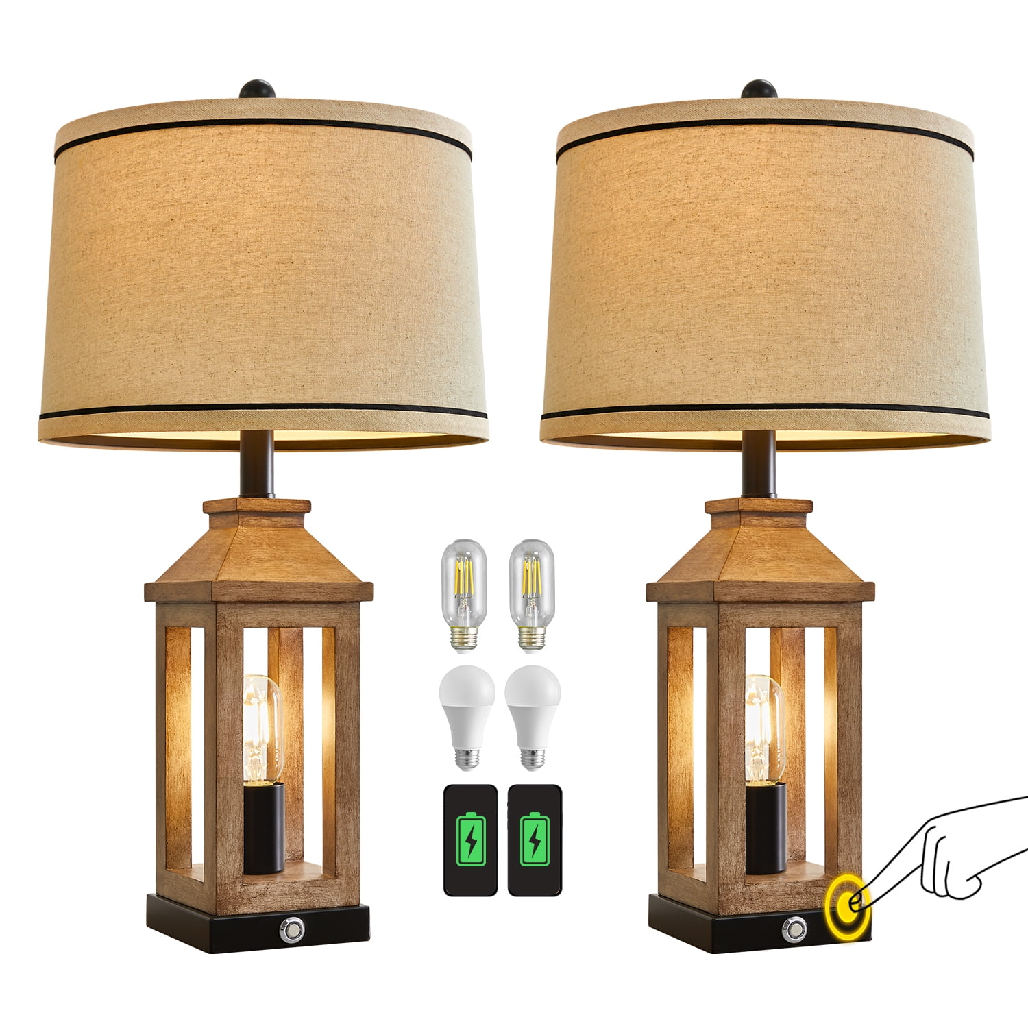Table Lamp Set of 2: Made of MDF and plastic lamp body and linen lamp shades, lamp body is designed like a pavilion in European style, MDF four poles and resin roof, hightlight the traditional, elegant and modern style, create romantic, warm, cozy atmosphere for your living room or bedroom. Nightstand Lamps Size(After Assembly): Table lamps are 23.75 inch high overall; base is 5 inch wide at bottom; lamp shade is 13 inch across the top, 13 inch across the bottom, 9 inch high overall. This Bedside lamp set of 2 are perfect for any tables or nightstand on your bedroom or living room. 3-Way Dimmable Bedside Lamps: Built-in sensitive sensors in the lamp base, our table lamp set of 2 for bedroom enables you to tap touch control switch to adjust 3 level brightness of the bulb in the lamp body and turn it on/off. Rotary switch can turn the top main light on/off. It can make you get rid of the trouble of fumbling the switch in the dark, especially when you wake up in the middle night, perfect for the nightstand, bedroom and living room. Living Room Lamps with USB Ports: There are 2 USB charging ports set in the base of each farmhouse table lamp, which is convenient for your daily use. You can easily charge your mobile phone, tablet or other electronic devices, perfect for lighting, working or reading. Charging function still work whether the lamp is on or off. Easy Assembly: This table lamp can be used for bedroom, living room, study or office lighting. The lamp shade and B/C Rings, harps, finials and lamp body are need to be assembled, you can follow the assembly instruction to assemble them or by yourself, you will find it’s fun and easy to assemble this bedside lamp. We are 100% dedicated to your complete satisfaction, so all table lamps come with 12 months warranty.