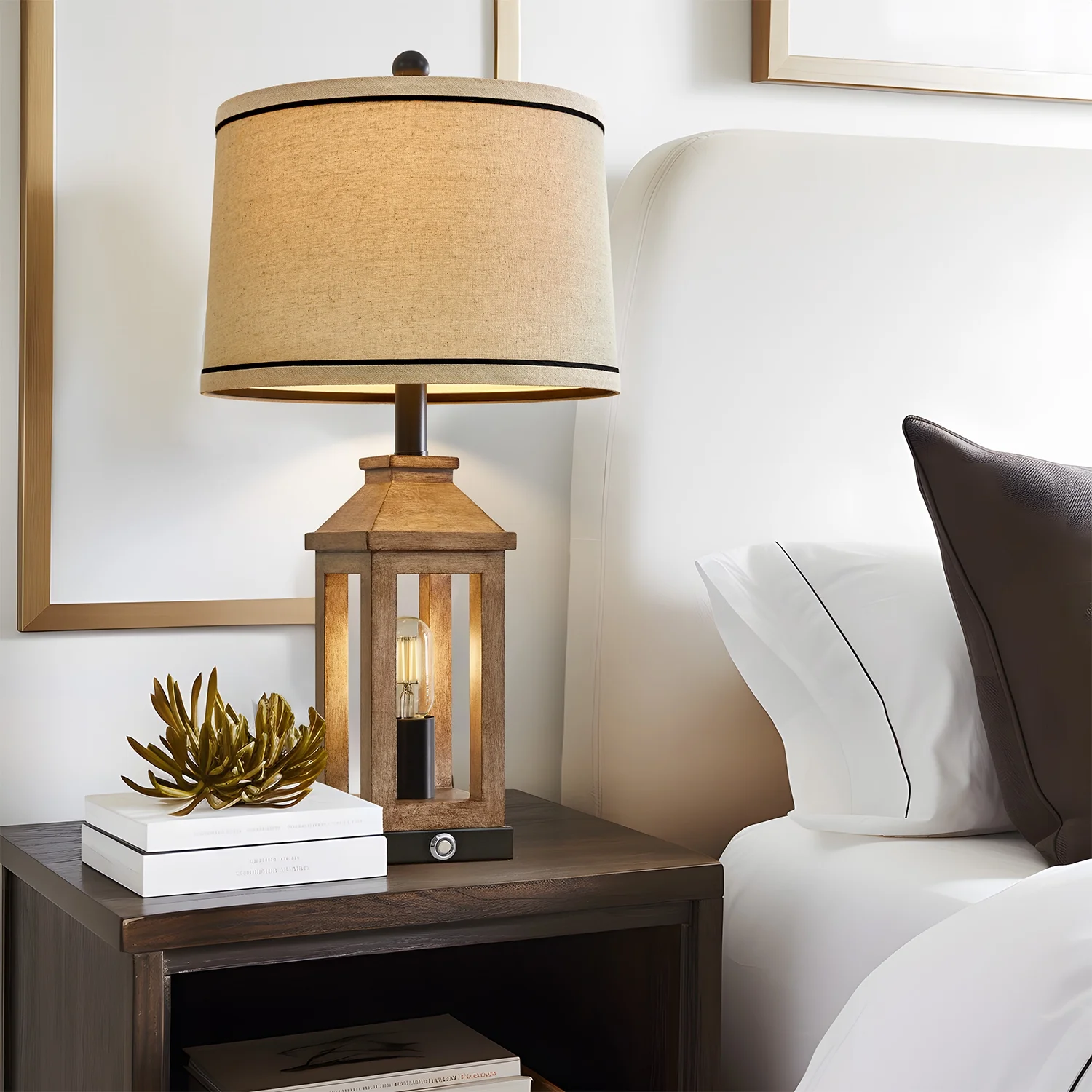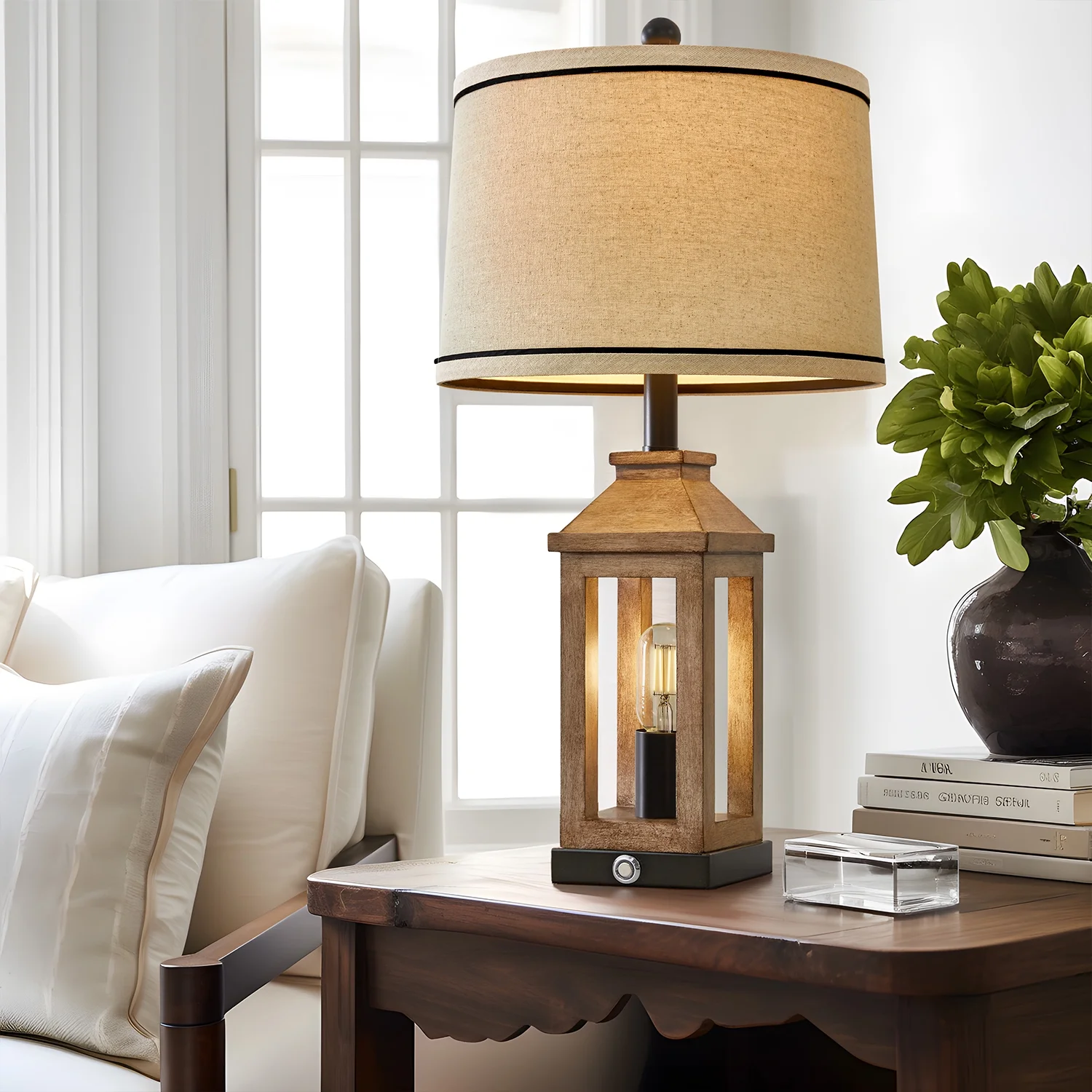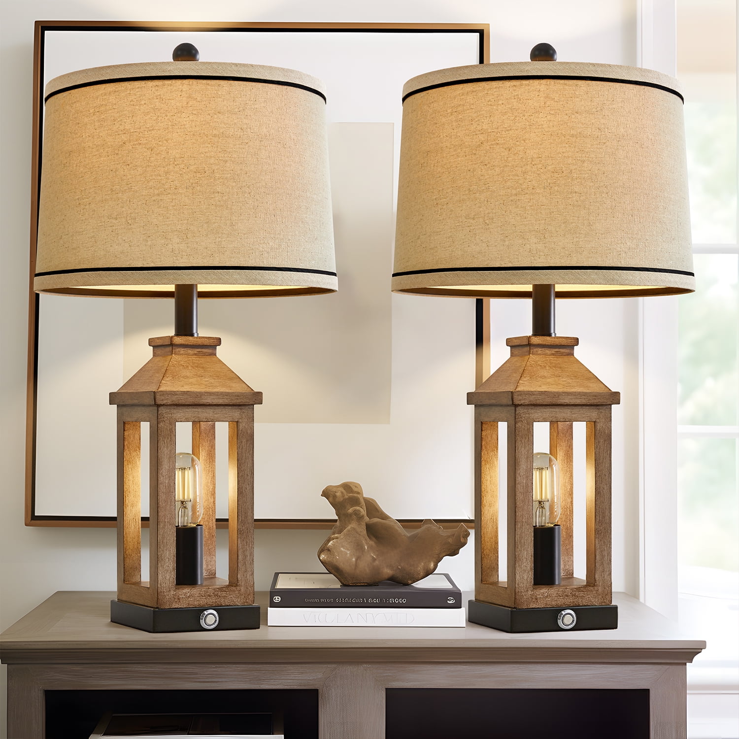 Table Lamp Set of 2: Made of MDF and plastic lamp body and linen lamp shades, lamp body is designed like a pavilion in European style, MDF four poles and resin roof, hightlight the traditional, elegant and modern style, create romantic, warm, cozy atmosphere for your living room or bedroom. Nightstand Lamps Size(After Assembly): Table lamps are 23.75 inch high overall; base is 5 inch wide at bottom; lamp shade is 13 inch across the top, 13 inch across the bottom, 9 inch high overall. This Bedside lamp set of 2 are perfect for any tables or nightstand on your bedroom or living room. 3-Way Dimmable Bedside Lamps: Built-in sensitive sensors in the lamp base, our table lamp set of 2 for bedroom enables you to tap touch control switch to adjust 3 level brightness of the bulb in the lamp body and turn it on/off. Rotary switch can turn the top main light on/off. It can make you get rid of the trouble of fumbling the switch in the dark, especially when you wake up in the middle night, perfect for the nightstand, bedroom and living room. Living Room Lamps with USB Ports: There are 2 USB charging ports set in the base of each farmhouse table lamp, which is convenient for your daily use. You can easily charge your mobile phone, tablet or other electronic devices, perfect for lighting, working or reading. Charging function still work whether the lamp is on or off. Easy Assembly: This table lamp can be used for bedroom, living room, study or office lighting. The lamp shade and B/C Rings, harps, finials and lamp body are need to be assembled, you can follow the assembly instruction to assemble them or by yourself, you will find it’s fun and easy to assemble this bedside lamp. We are 100% dedicated to your complete satisfaction, so all table lamps come with 12 months warranty.