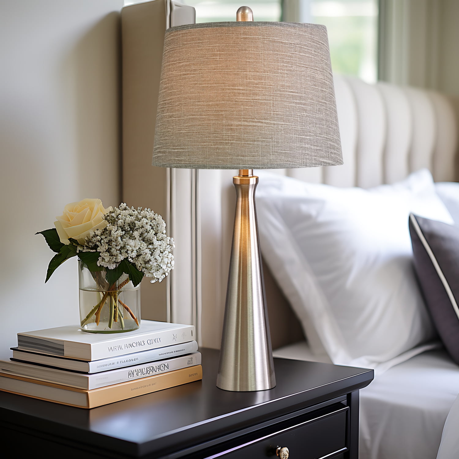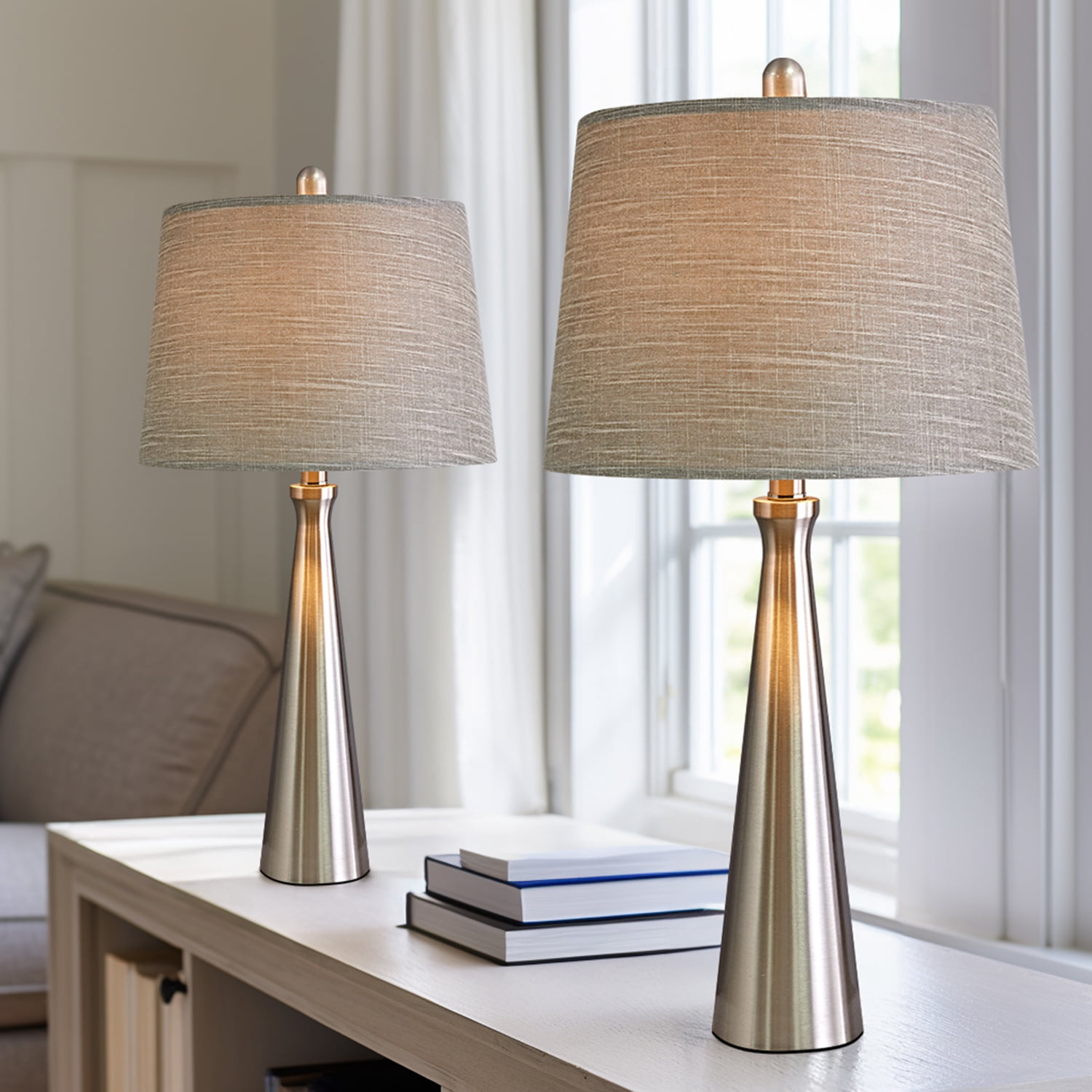 ⚡ Modern Table Lamps: Crafted with a silver metal lamp body, and paired with gray drum-shaped beige linen fabric shades,this set of 2 nightstand lamps showcases an elegant and modern style.Ideal for illuminating your bedroom or living room,they also serve as perfect decorative pieces to enhance your furniture sets. ⚡ Nightstands Table Lamps Features: USB Port : With one USB charging port (at each lamp base) Control Type: Rotary switch (at the bulb socket) Light Bulb: Each bedside lamp uses one standard E26 socket, compatible with a variety of LED, halogen or CFL light bulb.Please check whether the lamp specifications meet your requirements before purchasing.(Bulb not included) ⚡ Package: 2 x table lamp (Lamp parts: 2 pcs metal lamp body, 2 pcs lamp shades, 2 pcs B Rings, 2 pcs C Rings, 2 pcs harps, 2 pcs finials) 1 x Assembly Instruction & Manual ⚡ Easy Assembly: The lampshade,B&C rings,harp,and finial of this bedroom lamps set of 2 require assembly.You can follow the provided assembly instructions to easily and enjoyably complete the assembly process. ⚡ Warm tips: After you open the living room lamps package, please make sure you received all table lamps parts, and please check cardboard on the back of the foam case where we placed lamp parts. If you have any questions, please feel free to contact us, we will reply you as soon as possible
