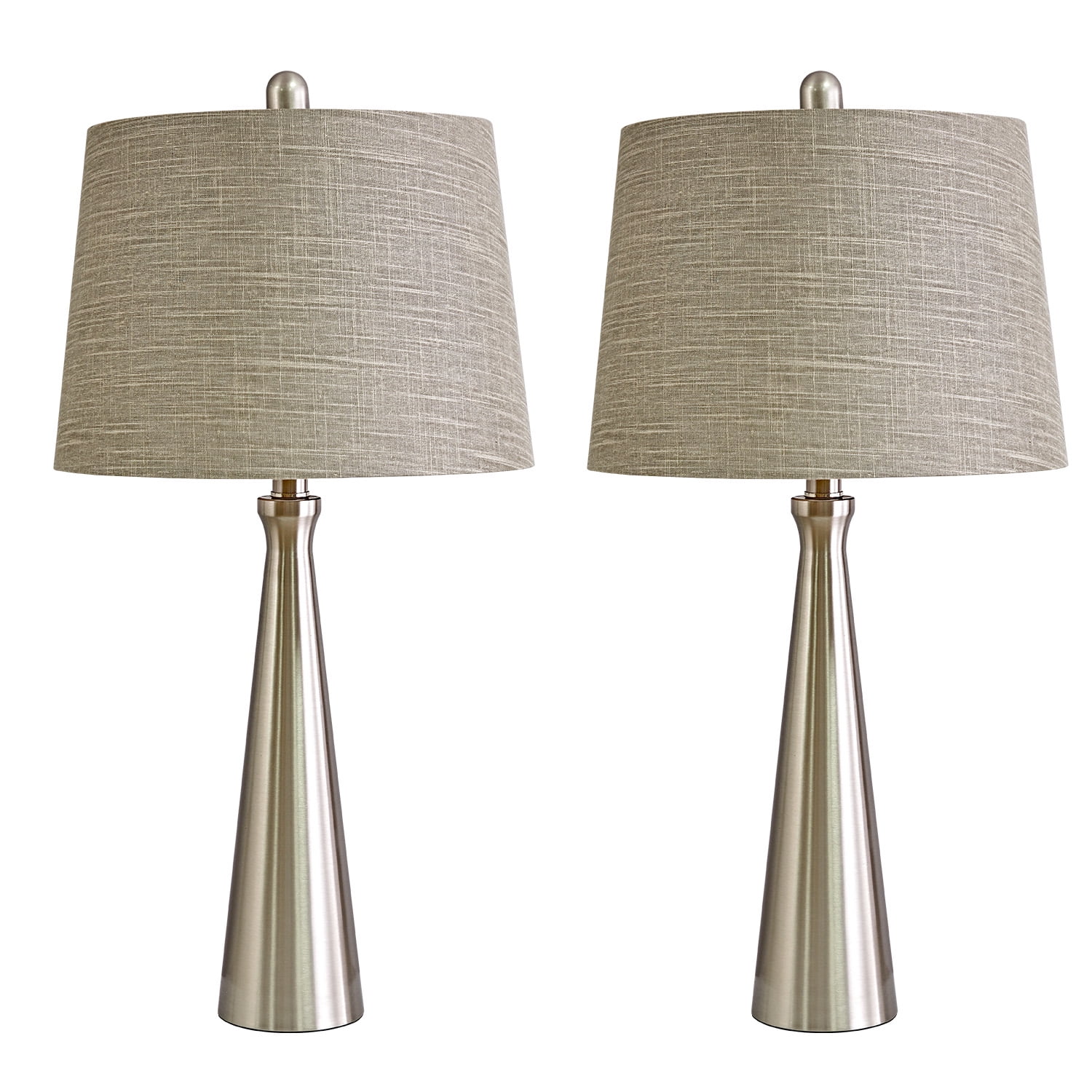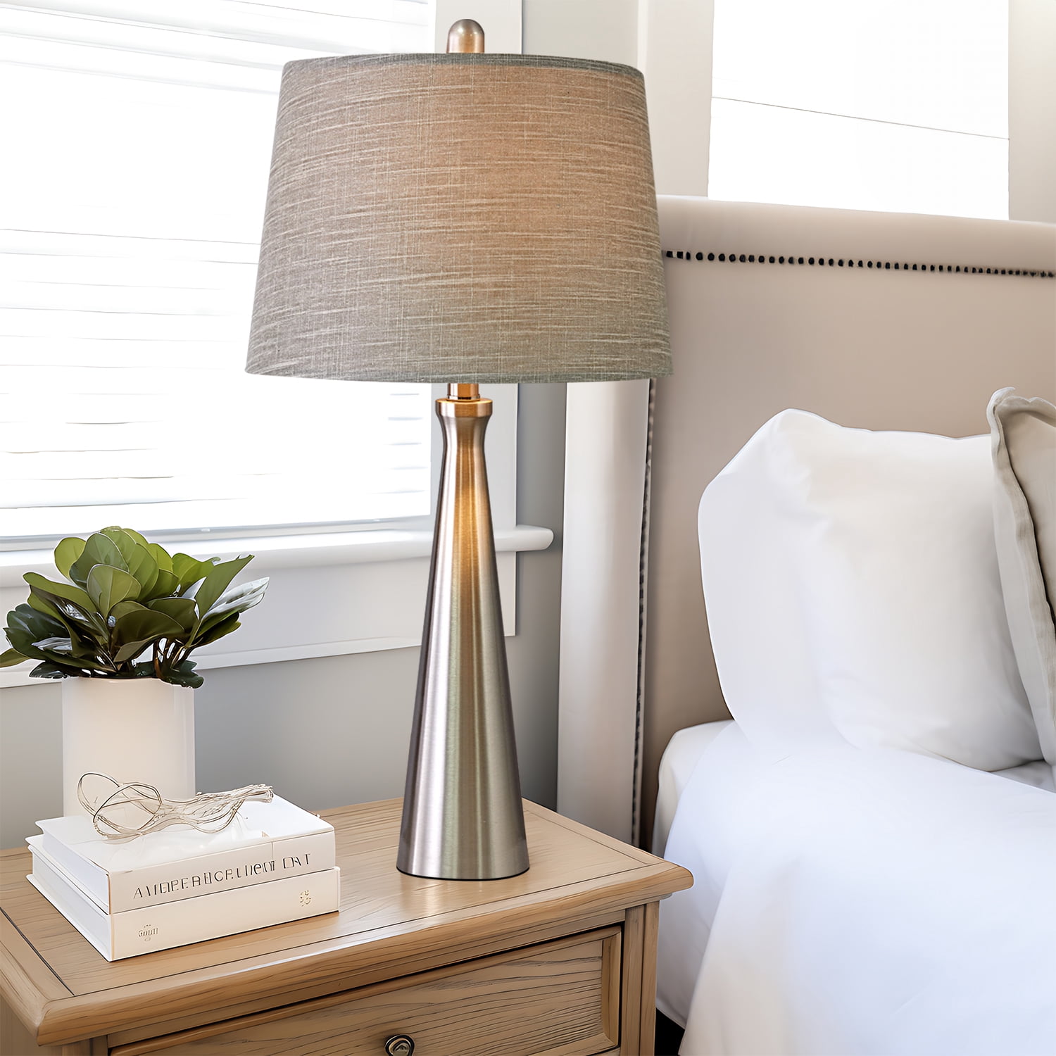 Modern Table Lamps Set of 2: Bedside table lamps are designed with silver gray metal cylindrical lamp body, highlights the simple and industrial style. There are two metal rings for each shade, along with a natural linen texture fabric that makes up the nice and sturdy drum shade. The gray linen fabric shade will make bright light softer so it can protect our eyes, also make the night stand table lamps present an elegant and charming look, setting off a warm and cozy atmosphere for your living room and bedroom.(The lampshade and B&C metal rings need to be assembled) Table Lamps Size(After Assembly): Each table lamp is 25.75 inch high overall. Round lamp base is 4 inch wide at bottom. Drum lamp shade is 11 inch across the top, 13 inch across the bottom, 9 inch high overall. Bedroom and Living room table lamps set of 2 are perfect for any tables or nightstands. Table Lamps with USB Port: With one USB A charging port set in each lamp base, it’s convenient for you to charge your mobile phone, tablet or other electronic devices, perfect for lighting, working or reading. Charging function still work whether table lamps are on or off. The cord and plug of table lamp set of 2 are UL listed, it’s nationally recognized for its standard of safety. Table lamps are perfect for living room, bedroom, dining room, office, study, etc. Bedside Lamps Assembly: Industrial style modern USB table lamps can be used for bedroom or living room lighting. The lampshade and B&C rings, lamp body, harp and finial are need to be assembled, you can follow the assembly instruction to finish it, you will find it’s fun to assemble set of two table lamps. 100% Worry-Free Warranty: All table lamps come with 2 years Warranty. We are 100% dedicated to your complete satisfaction, if you are not satisfied with the purchase for any reason, please feel free to contact us and get support. Product ParametersStyle: Modern Color: Silver Product Dimensions: 11.00 x 13.00 x 25.75 Inches Material: Metal Lamp Type: Table Lamp Room Type: Bedroom,Living Room,Office Shade Color: Silver Shade Material: Fabric Power Source: Corded Electric Switch Type: Rotary Switch