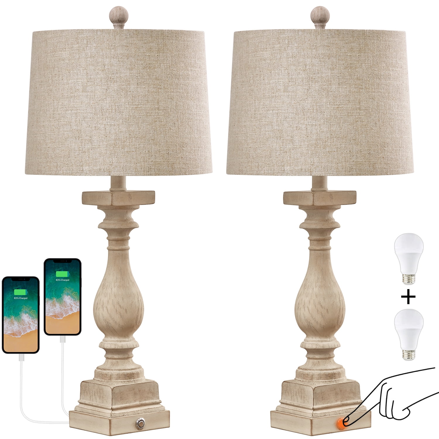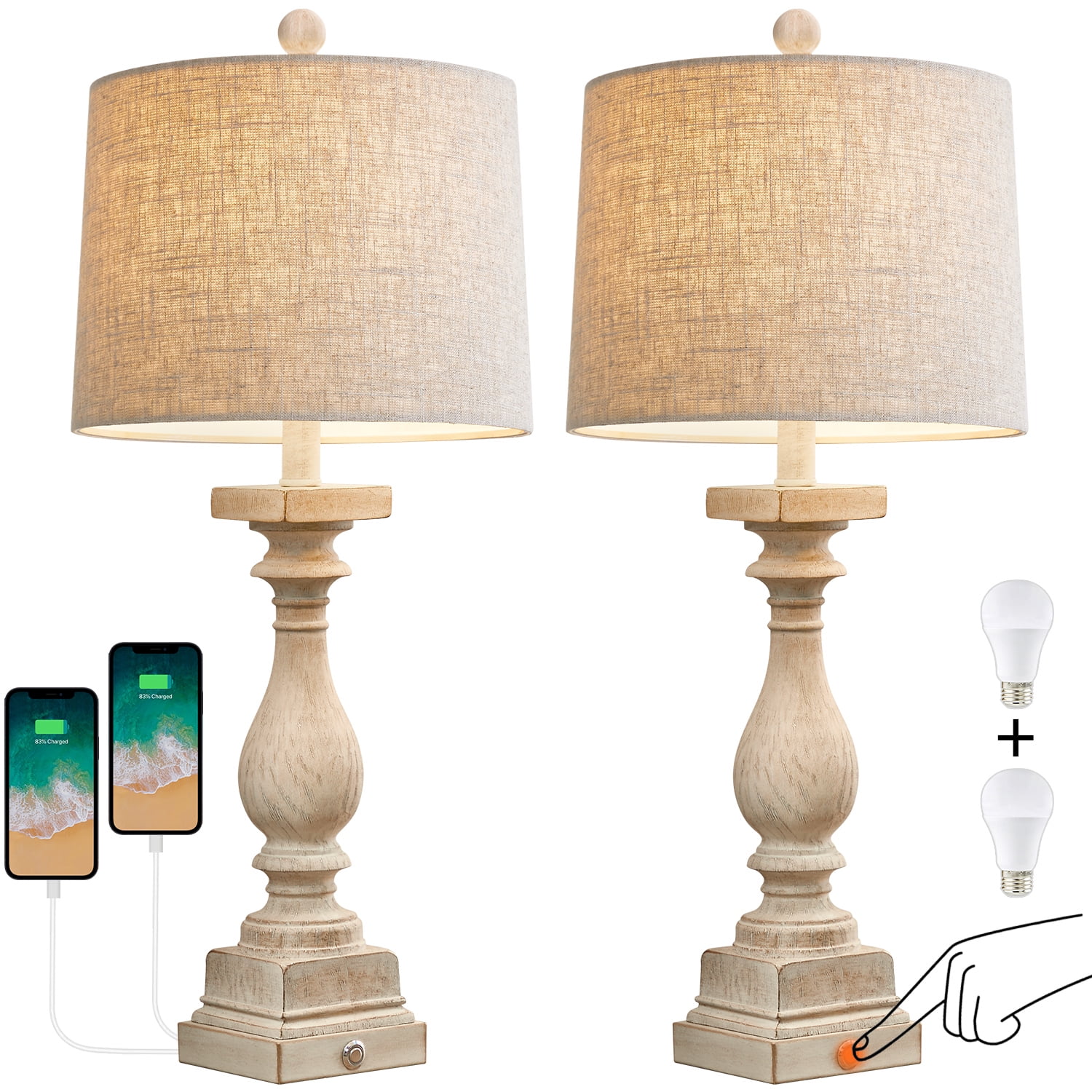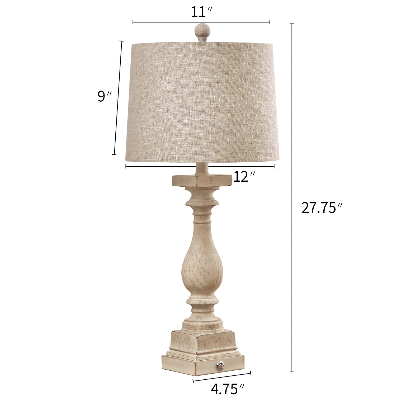 Touch Table Lamps Set of 2 : This bedside lamps are designed with washed beige resin lamp body and drum linen shade, highlights the rustic and farmhouse style. It’s unique design makes it perfect decoration in your home, add light and stylish to your room, perfect for living room, bedroom, foyer, dorm, dining room, office, study and any room you like. Farmhouse Table Lamps Size(After Assembly): table lamp is 27.75 inch high overall. Square lamp base is 4.75 inch wide at bottom. Drum lamp shade is 11 inch across the top, 12 inch across the bottom, 9 inch high overall. It’s perfect size and will look dazzling in any room. Suitable to set end table, beside corner table, office desk, nightstands, coffee table, dinning table. 3 Way Dimmable Table Lamps Set of 2 : Use the touch control design, gently press the base touch switch, can adjust the brightness of 3 levels (low, medium, high) and turn on/off. It can make you get rid of the trouble of fumbling the switch in the dark, especially when you wake up in the middle night, perfect for the bedroom and living room nightstands. Table Lamps with USB Ports : Nightstands lamps set of 2 are equipped with dual USB A charging port, ensuring fast charging for 2 devices. You can use the table lamp as a nightstand/desk charging station, charge for your phone, watch, iPad, kindle, laptop, game controller, alarm clock or other electronics no matter the lamp is on or off. Moreover, whether you are sleeping or working, you can easily charge your electronic devices, super convenient for you and your family. Customer Satisfaction & Warranty: All table lamps promised 2 years warranty. No matter what kind of problem you might meet, you are free to contact us and get our support. We will try our best to solve your issue and satisfy you. Product Parameters Style: Farmhouse Color: Antique White Product Dimensions: 11.00 x 12.00 x 27.75 Inches Material: Resin Lamp Type: Table Lamp Room Type: Bedroom,Living Room,Office Shade Color: Beige Shade Material: Fabric Power Source: Corded Electric Switch Type: Touch Switch