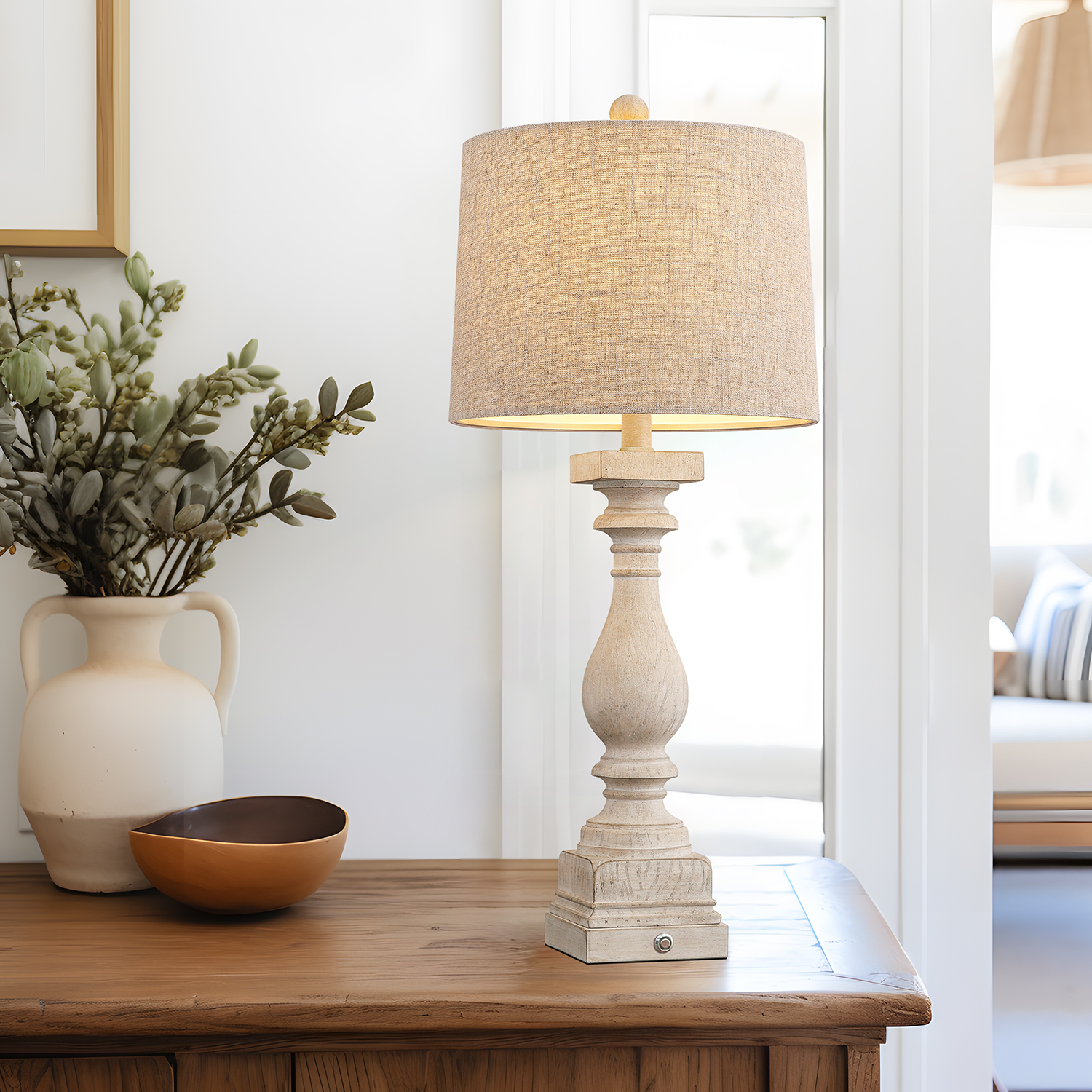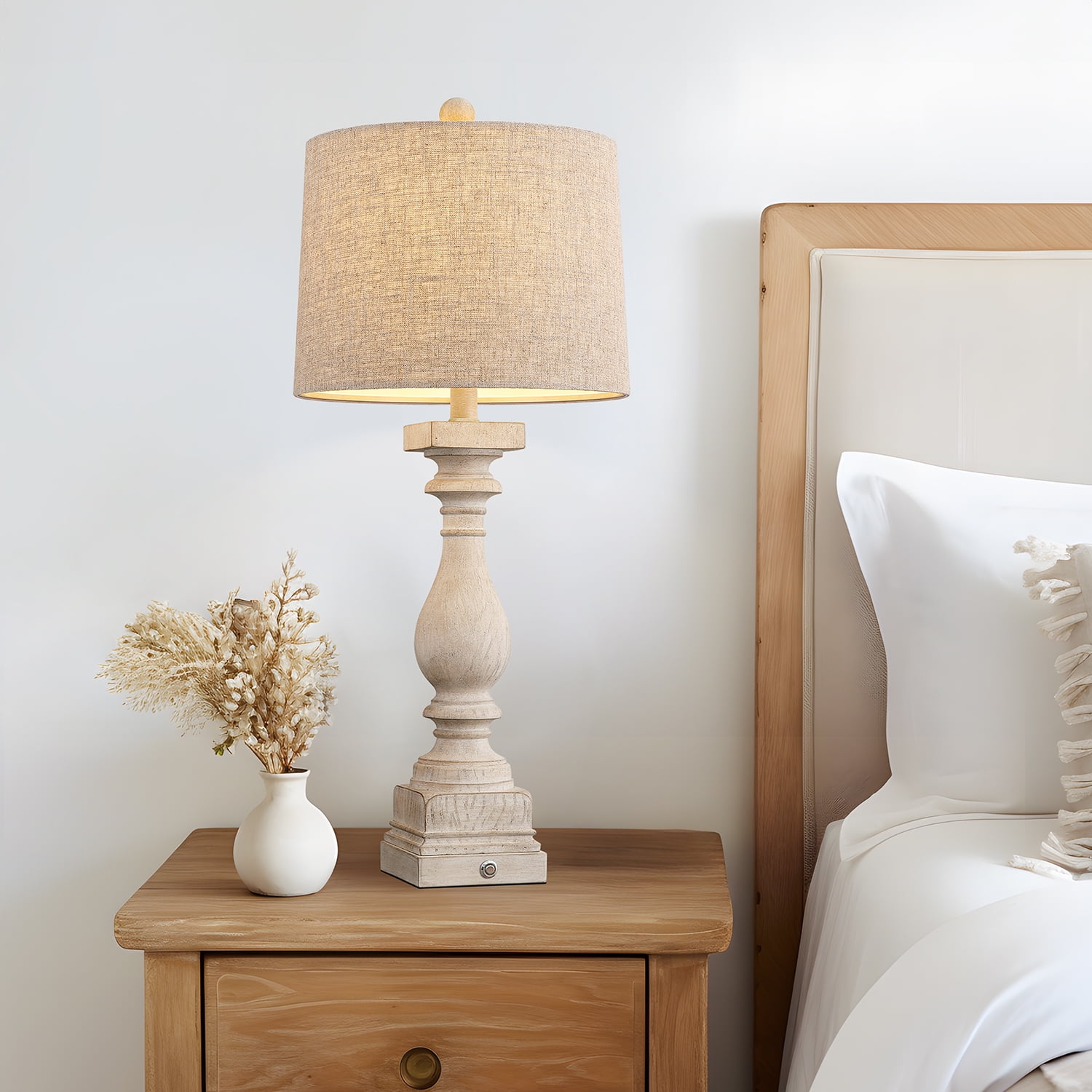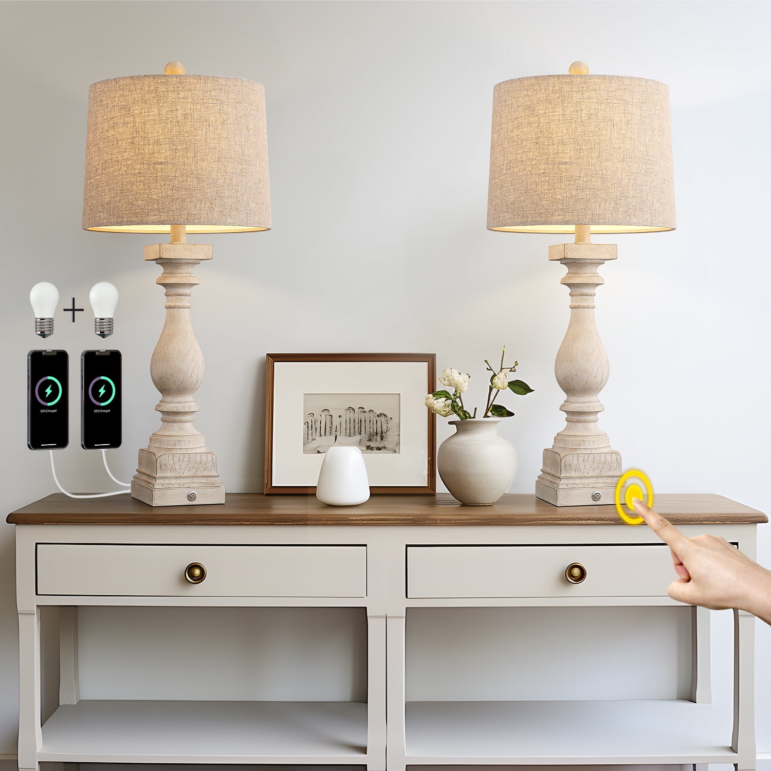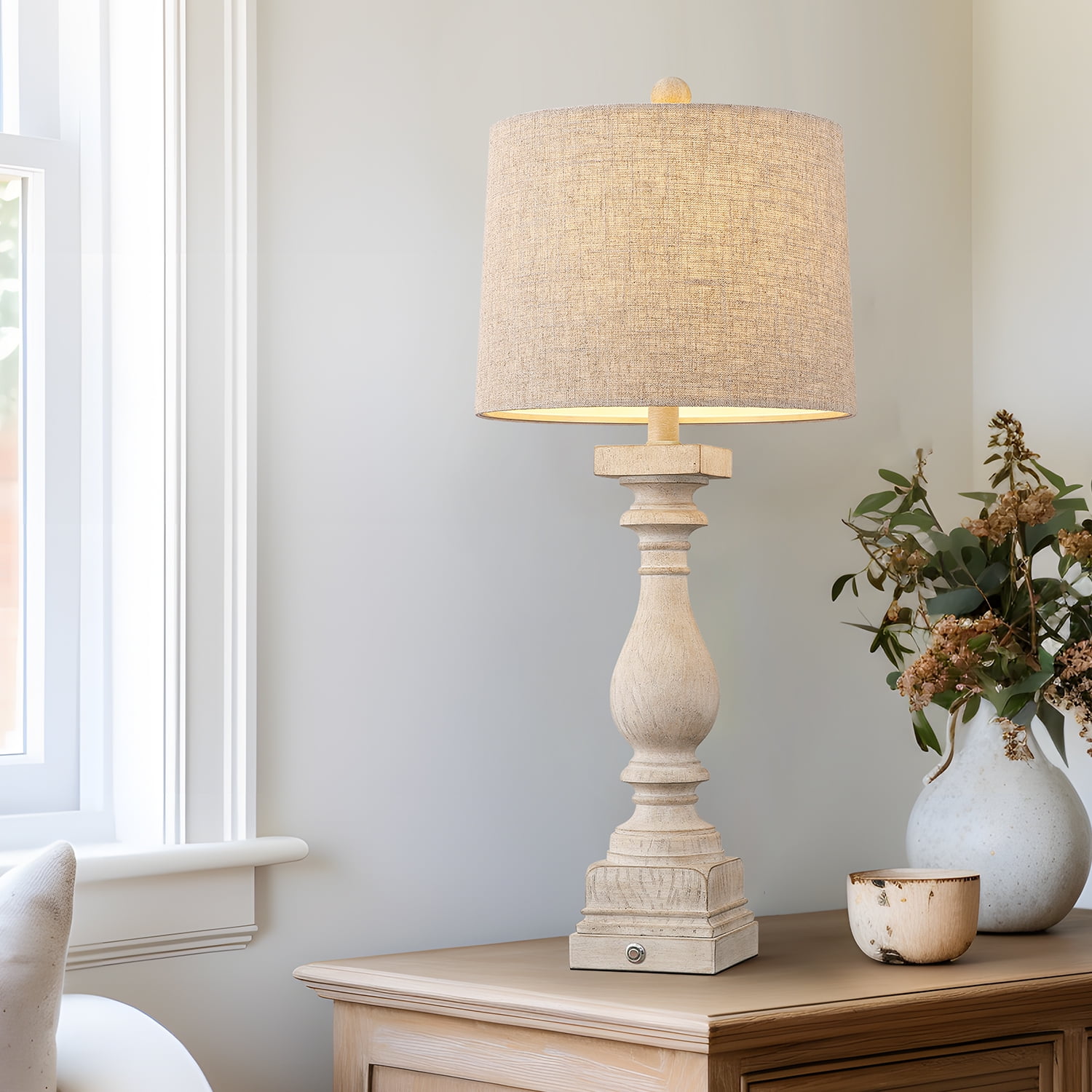 Touch Table Lamps Set of 2 : This bedside lamps are designed with washed beige resin lamp body and drum linen shade, highlights the rustic and farmhouse style. It’s unique design makes it perfect decoration in your home, add light and stylish to your room, perfect for living room, bedroom, foyer, dorm, dining room, office, study and any room you like. Farmhouse Table Lamps Size(After Assembly): table lamp is 27.75 inch high overall. Square lamp base is 4.75 inch wide at bottom. Drum lamp shade is 11 inch across the top, 12 inch across the bottom, 9 inch high overall. It’s perfect size and will look dazzling in any room. Suitable to set end table, beside corner table, office desk, nightstands, coffee table, dinning table. 3 Way Dimmable Table Lamps Set of 2 : Use the touch control design, gently press the base touch switch, can adjust the brightness of 3 levels (low, medium, high) and turn on/off. It can make you get rid of the trouble of fumbling the switch in the dark, especially when you wake up in the middle night, perfect for the bedroom and living room nightstands. Table Lamps with USB Ports : Nightstands lamps set of 2 are equipped with dual USB A charging port, ensuring fast charging for 2 devices. You can use the table lamp as a nightstand/desk charging station, charge for your phone, watch, iPad, kindle, laptop, game controller, alarm clock or other electronics no matter the lamp is on or off. Moreover, whether you are sleeping or working, you can easily charge your electronic devices, super convenient for you and your family. Customer Satisfaction & Warranty: All table lamps promised 2 years warranty. No matter what kind of problem you might meet, you are free to contact us and get our support. We will try our best to solve your issue and satisfy you. Product Parameters Style: Farmhouse Color: Antique White Product Dimensions: 11.00 x 12.00 x 27.75 Inches Material: Resin Lamp Type: Table Lamp Room Type: Bedroom,Living Room,Office Shade Color: Beige Shade Material: Fabric Power Source: Corded Electric Switch Type: Touch Switch