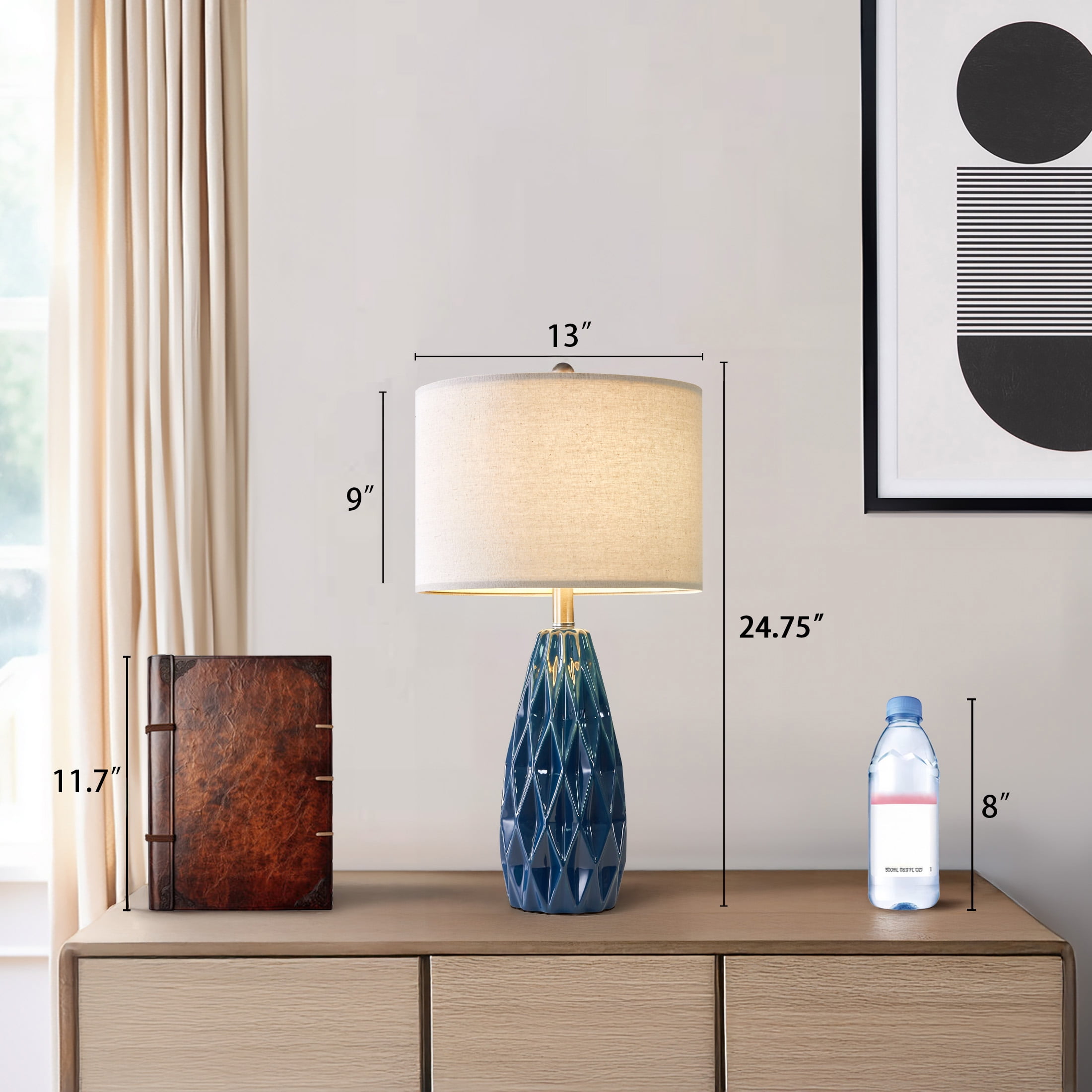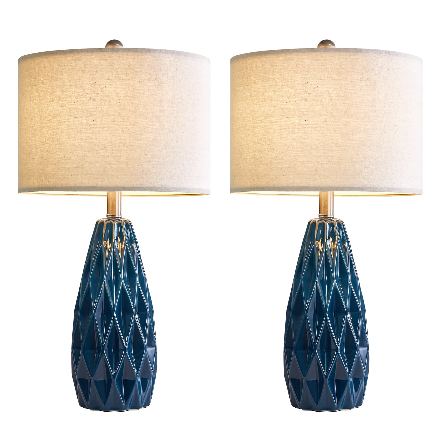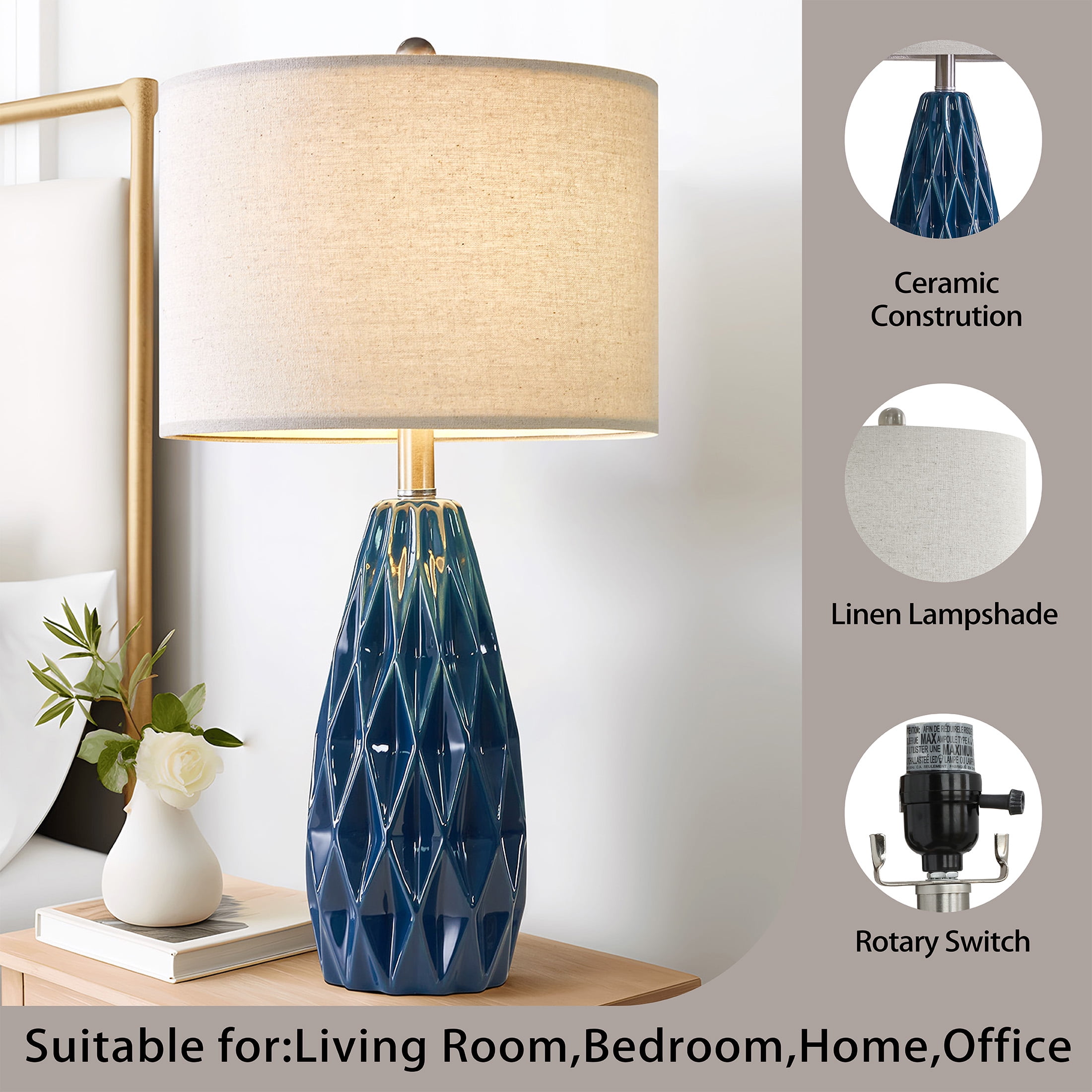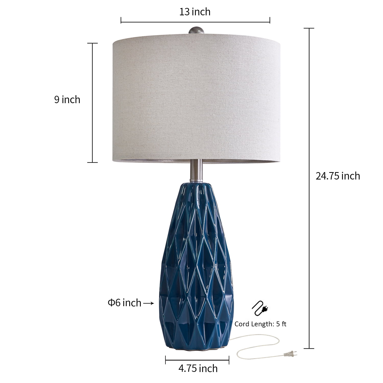 Farmhouse Table Lamp Set of 2 : Made of navy blue ceramic lamp body and beige lamp shade. Modern nightstand lamp body is designed in a blue conical shape with smooth concave regular geometric rhombus lattices, it highlights the elegant and modern, romantic and fashion style, setting off a warm and comfortable atmosphere for your living room or bedroom Table Lamps Size(After Assembly): bedside lamp is 24.75 inch high overall. Round lamp base is 4.75 inch wide at bottom. Drum lamp shade is 13 inch across the top, 13 inch across the bottom, 9 inch high overall. This elegant ceramic bedside lamp is perfect for any tables or nightstand on your bedroom or living room Table Lamps for Living Room : Farmhouse ceramic table lamp is equipped with a beige nice and sturdy drum lamp shade, when you turn on the lamp, the bright light will emanate from up and down, present a elegant and charming look, add light and stylish to your room. Elegant blue ceramic table lamp with shade is ideal for the bedroom, living room, entrance hall, or in coffee table, dining room, etc. (The lamp shade and B&C rings need to be assembled) Table Lamps for Bedroom : Rotary ON/OFF switch on the bulb socket, it’s convenient for you to turn on/off the lamp. Each table lamp use a standard E26 bulb socket, compatible with various CFL and LED bulb, or can use one 60-watt maximum incandescent bulb. The cord and plug of each table lamp is UL listed, it’s nationally recognized for its standard of safety. Ceramic nightstand table lamps are perfect decor for living room, bedroom, dining room, office, study, etc. Easy Assembly: Blue ceramic table lamp set of 2 can be used for bedroom or living room lighting. The lampshade and B&C rings, lamp body, harp and finial are need to be assembled(Bulb not included), you can follow the assembly instruction to assemble them, you will find it’s fun to assemble the table lamps. We are 100% dedicated to your complete satisfaction, so all table lamps come with 12 months warranty. Product Parameters Style: Modern Color: Blue Product Dimensions: 13.00 x 13.00 x 24.75 Inches Material: Ceramic Lamp Type: Table Lamp Room Type: Bedroom,Living Room,Office Shade Color: Beige Shade Material: Fabric Power Source: Corded Electric Switch Type: Rotary Switch
