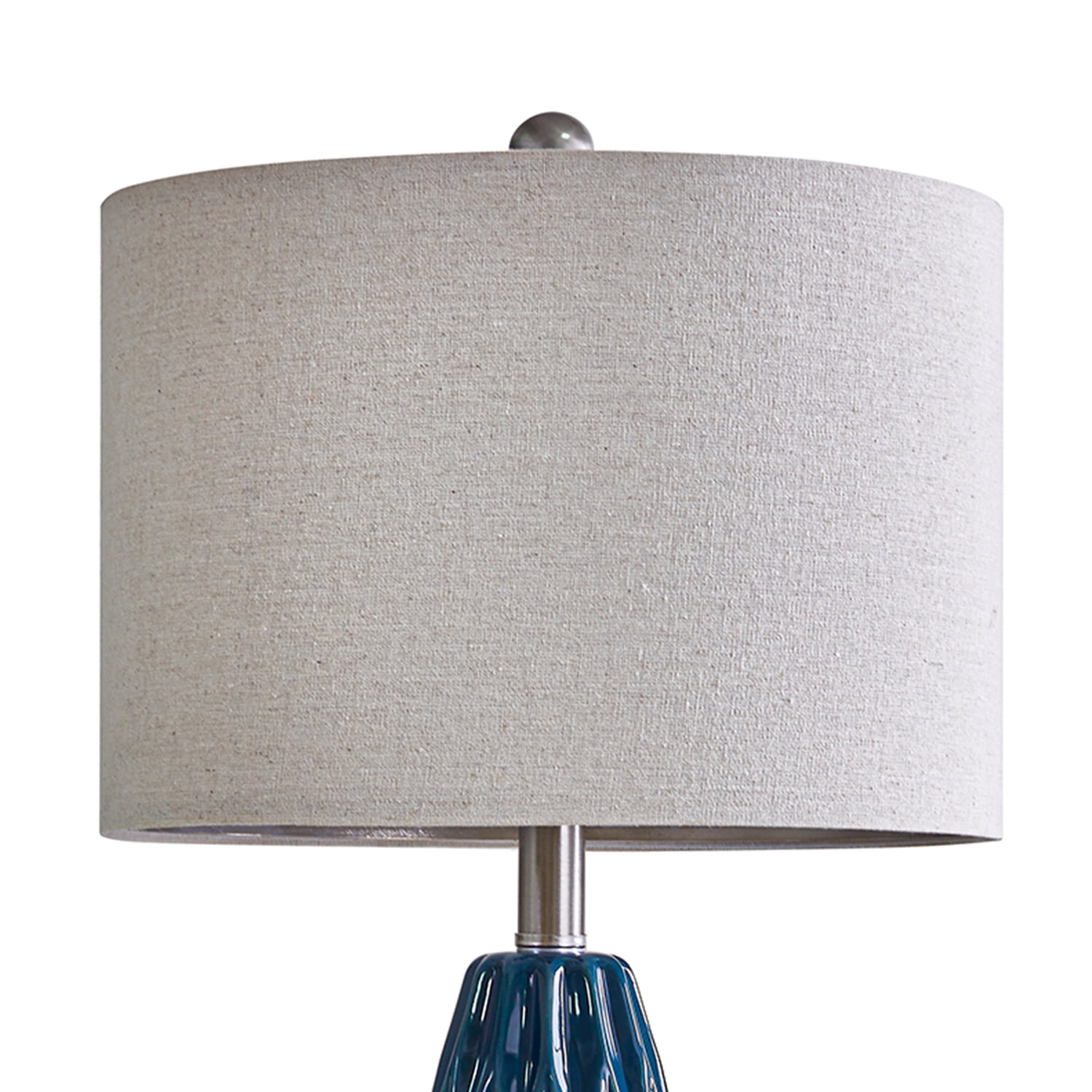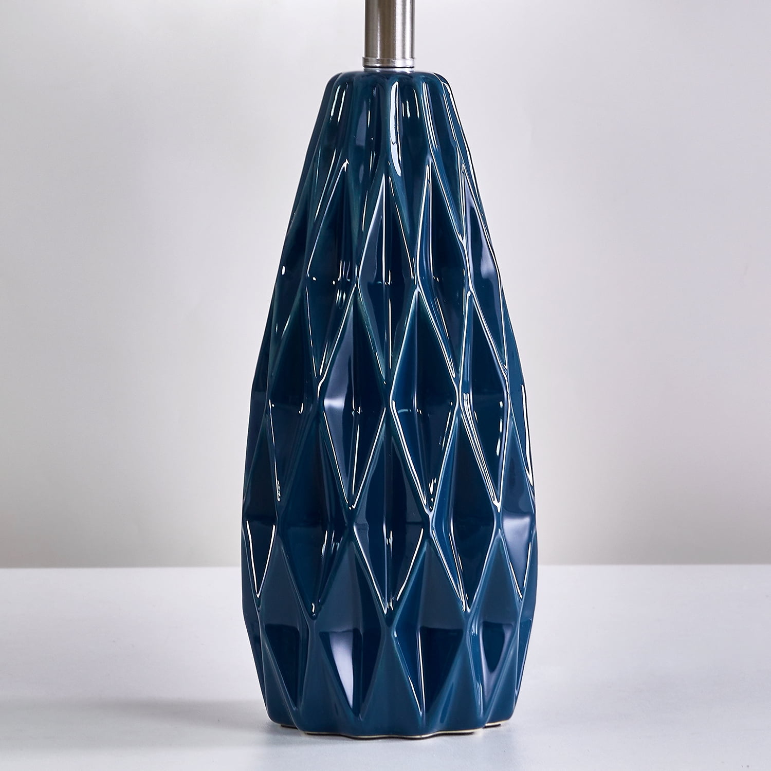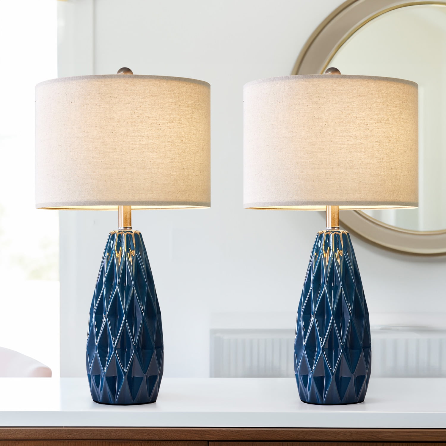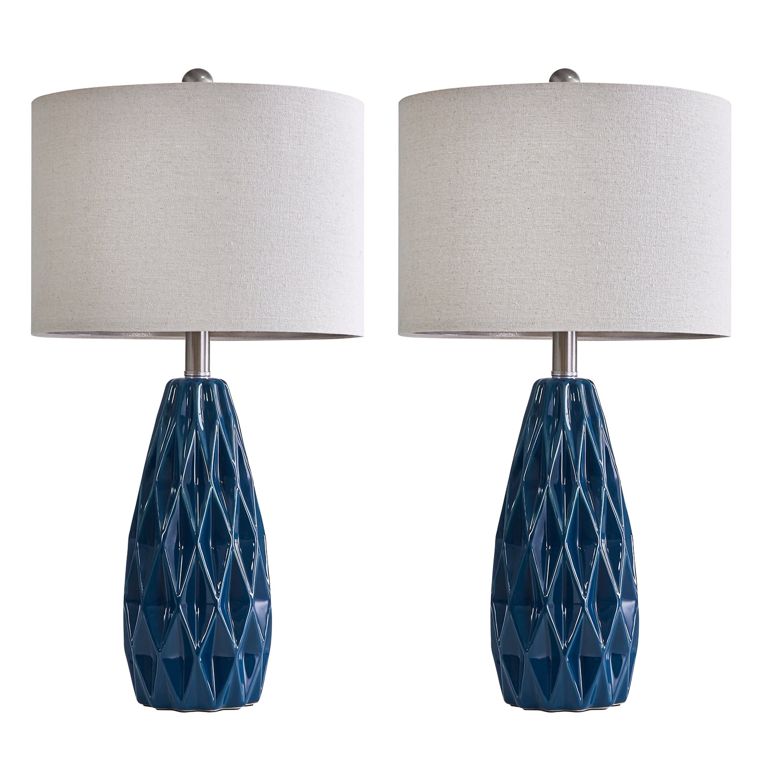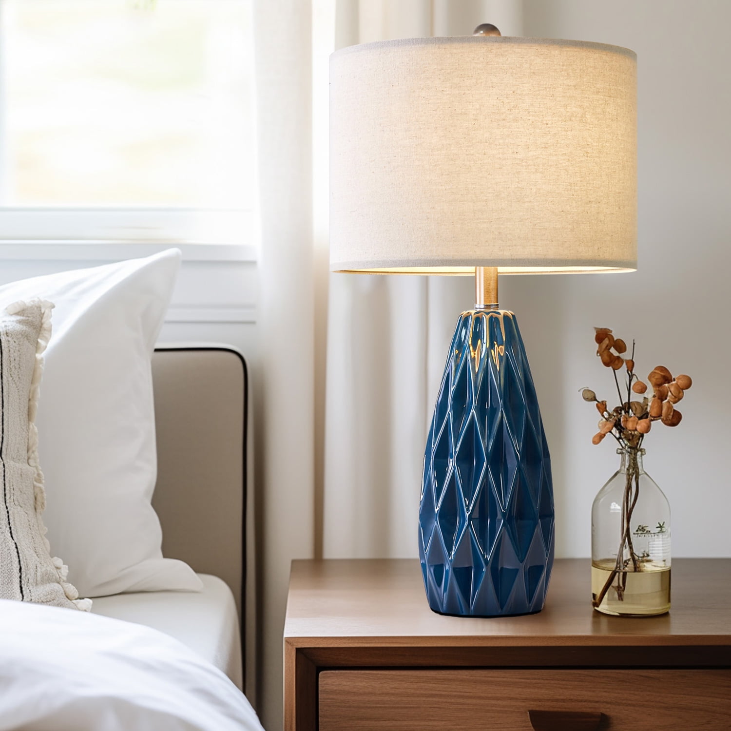 Farmhouse Table Lamp Set of 2 : Made of navy blue ceramic lamp body and beige lamp shade. Modern nightstand lamp body is designed in a blue conical shape with smooth concave regular geometric rhombus lattices, it highlights the elegant and modern, romantic and fashion style, setting off a warm and comfortable atmosphere for your living room or bedroom Table Lamps Size(After Assembly): bedside lamp is 24.75 inch high overall. Round lamp base is 4.75 inch wide at bottom. Drum lamp shade is 13 inch across the top, 13 inch across the bottom, 9 inch high overall. This elegant ceramic bedside lamp is perfect for any tables or nightstand on your bedroom or living room Table Lamps for Living Room : Farmhouse ceramic table lamp is equipped with a beige nice and sturdy drum lamp shade, when you turn on the lamp, the bright light will emanate from up and down, present a elegant and charming look, add light and stylish to your room. Elegant blue ceramic table lamp with shade is ideal for the bedroom, living room, entrance hall, or in coffee table, dining room, etc. (The lamp shade and B&C rings need to be assembled) Table Lamps for Bedroom : Rotary ON/OFF switch on the bulb socket, it’s convenient for you to turn on/off the lamp. Each table lamp use a standard E26 bulb socket, compatible with various CFL and LED bulb, or can use one 60-watt maximum incandescent bulb. The cord and plug of each table lamp is UL listed, it’s nationally recognized for its standard of safety. Ceramic nightstand table lamps are perfect decor for living room, bedroom, dining room, office, study, etc. Easy Assembly: Blue ceramic table lamp set of 2 can be used for bedroom or living room lighting. The lampshade and B&C rings, lamp body, harp and finial are need to be assembled(Bulb not included), you can follow the assembly instruction to assemble them, you will find it’s fun to assemble the table lamps. We are 100% dedicated to your complete satisfaction, so all table lamps come with 12 months warranty. Product Parameters Style: Modern Color: Blue Product Dimensions: 13.00 x 13.00 x 24.75 Inches Material: Ceramic Lamp Type: Table Lamp Room Type: Bedroom,Living Room,Office Shade Color: Beige Shade Material: Fabric Power Source: Corded Electric Switch Type: Rotary Switch