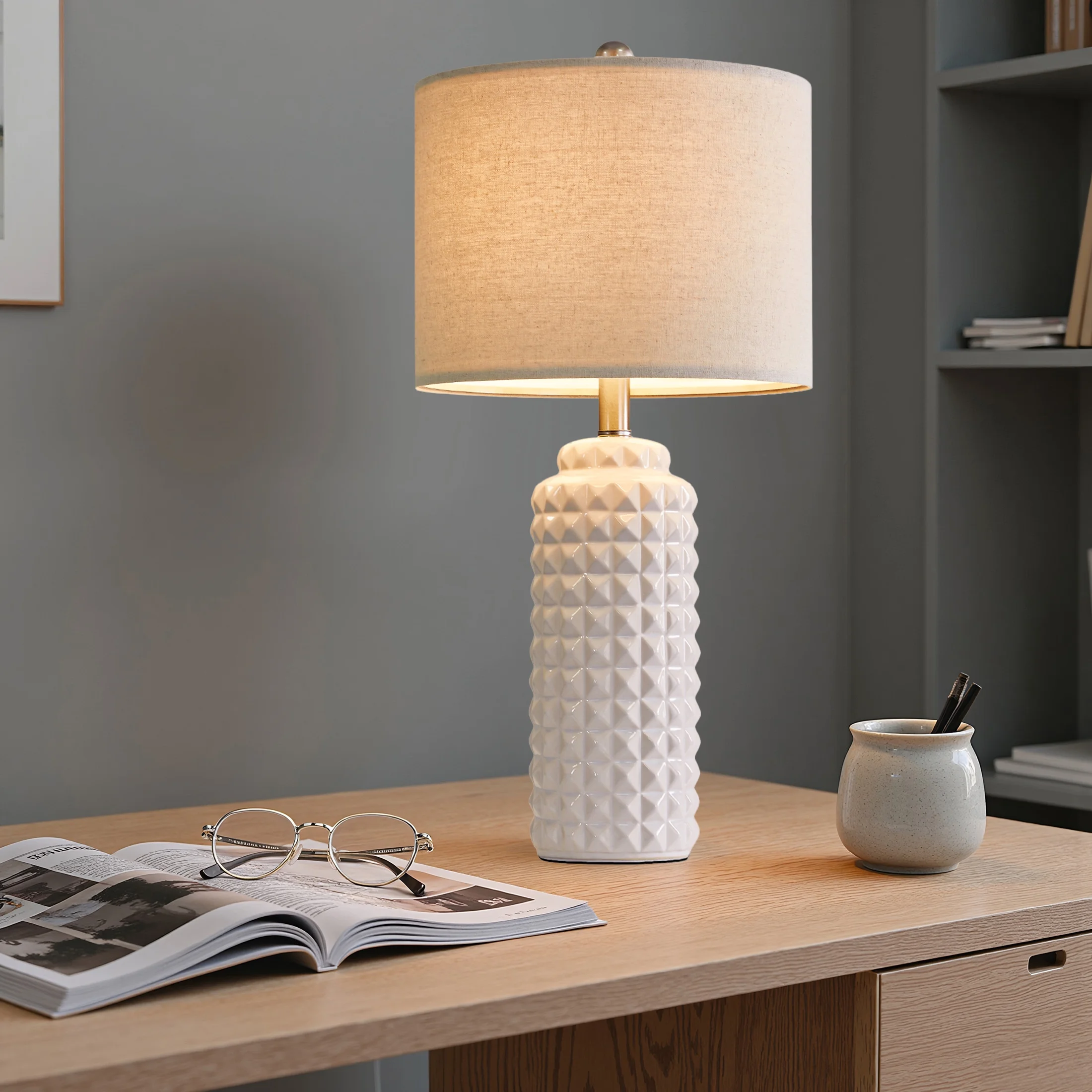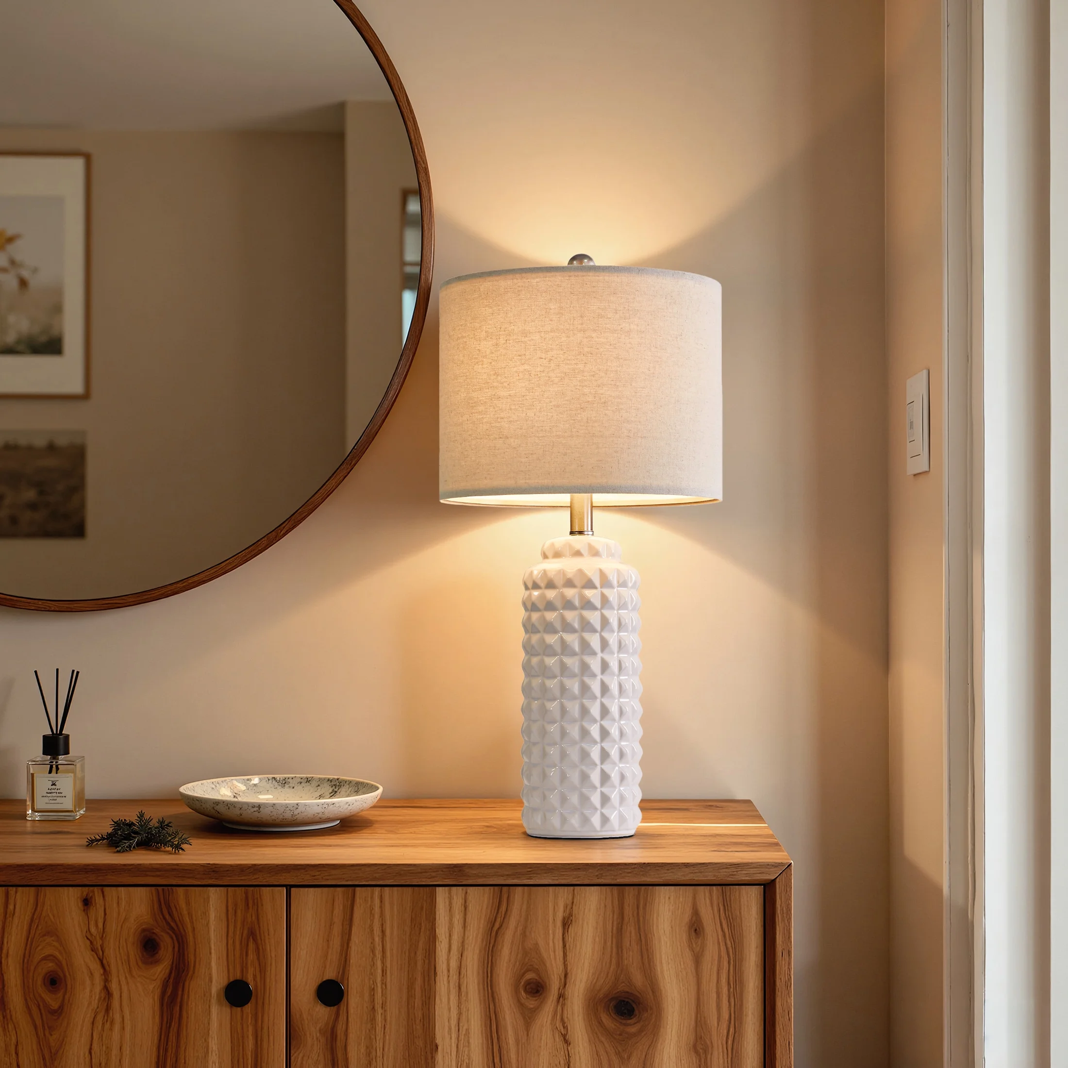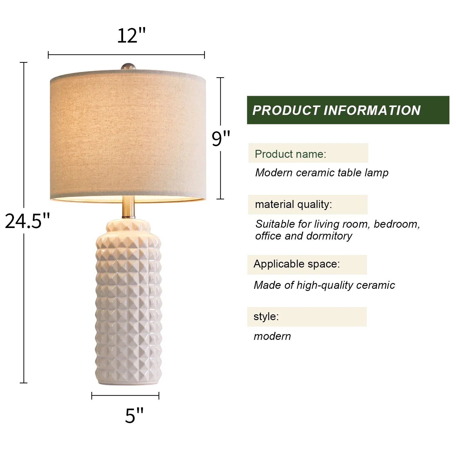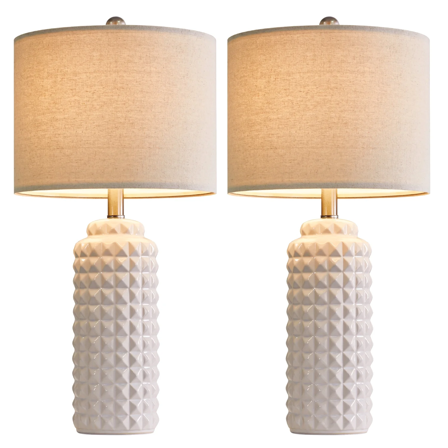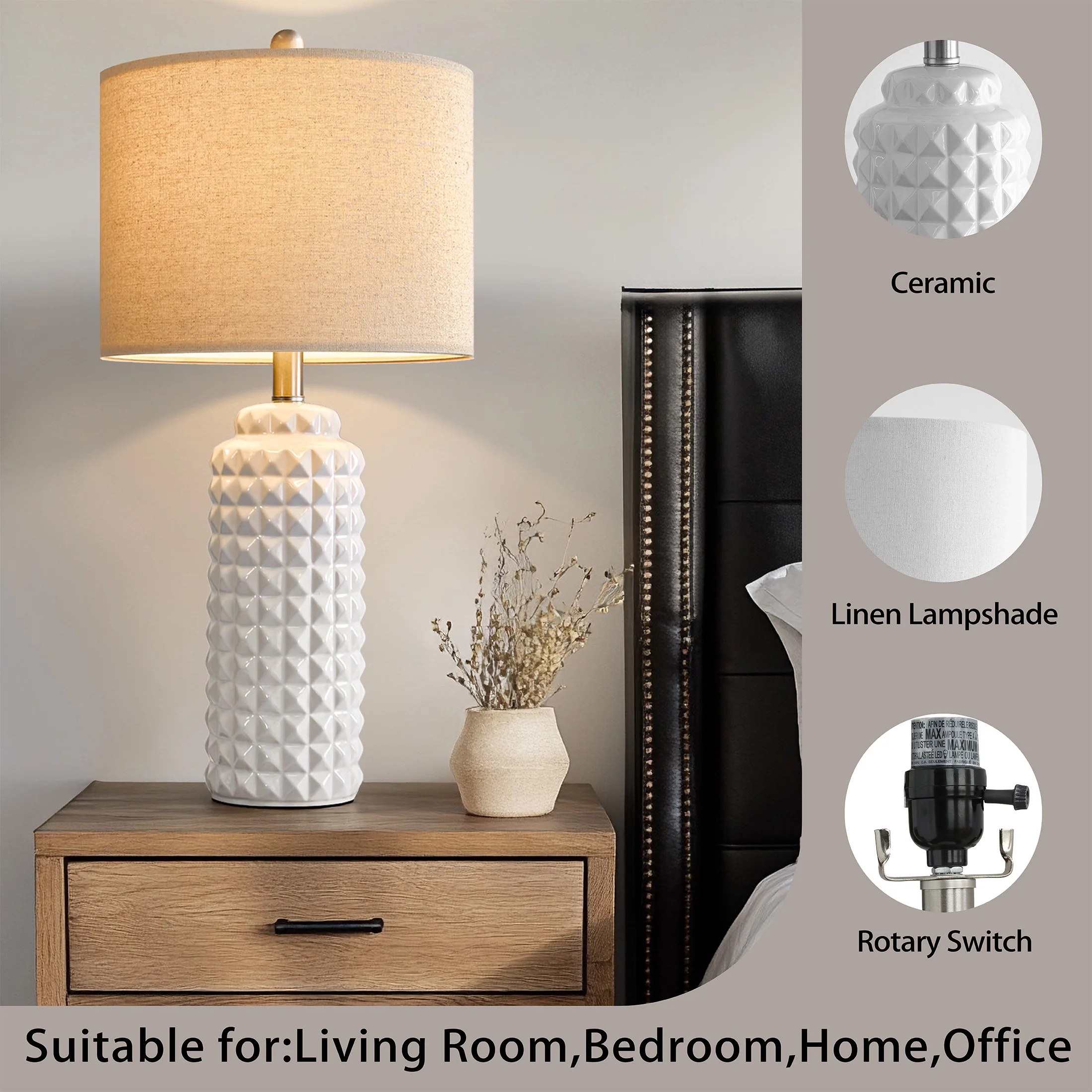 Lamps for nightstands : This nightstand lamps set of 2 are designed with high quality ceramic lamp body and drum linen shade, highlights the simple and modern style. It’s unique design makes it perfect decoration in your home, add light and stylish to your room, perfect for living room, bedroom, foyer, dorm, dining room, office, study and any room you like. Bedside Lamp Set of 2 Features : Each shade of this living room lamp has two metal rings, along with a natural linen texture fabric that makes up the nice and sturdy drum shade. The beige linen fabric shade will make bright light softer so it can protect our eyes, also make glass table lamps with shade present an elegant and charming look, setting off a warm and cozy atmosphere for your living room and bedroom. Ceramic Table Lamps Size(After Assembly): table lamp is 24.5 inch high overall. Round lamp base is 4.75 inch wide at bottom. Drum lamp shade is 12 inch across the top, 12 inch across the bottom, 9 inch high overall. It’s perfect size and will look dazzling in any room. Suitable to set end table, beside corner table, office desk, nightstands, coffee table, dinning table. Convenient Bedroom Lamps : Rotary on/off switch on the bulb socket is convenient to turn on/off the lamp without having to get up and press a wall switch, it fits for any tables or nightstands on your bedroom or living room. The standard E26 bulb socket is compatible with all kinds of incandescent bulbs(up to 60W), Edison, LED and CFL. We always take product quality and safety as the first purpose, to ensure that every lamp is in line with International quality and safety standards. you can safely choose and buy. (Bulbs not included) Customer Satisfaction & Warranty: All table lamps promised 2 years warranty. No matter what kind of problem you might meet, you are free to contact us and get our support. We will try our best to solve your issue and satisfy you. Product ParametersStyle: ModernColor: WhiteProduct Dimensions: 12 x 12 x 24.5 InchesMaterial: CeramicLamp Type: Table LampRoom Type: Bedroom,Living Room,OfficeShade Color: BeigeShade Material: FabricPower Source: Corded ElectricSwitch Type: Rotary Switch
