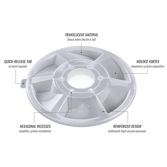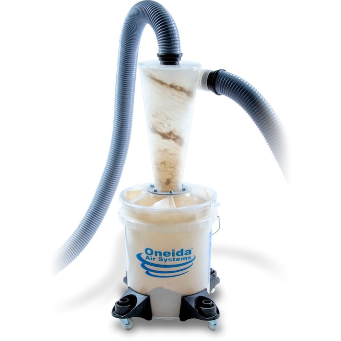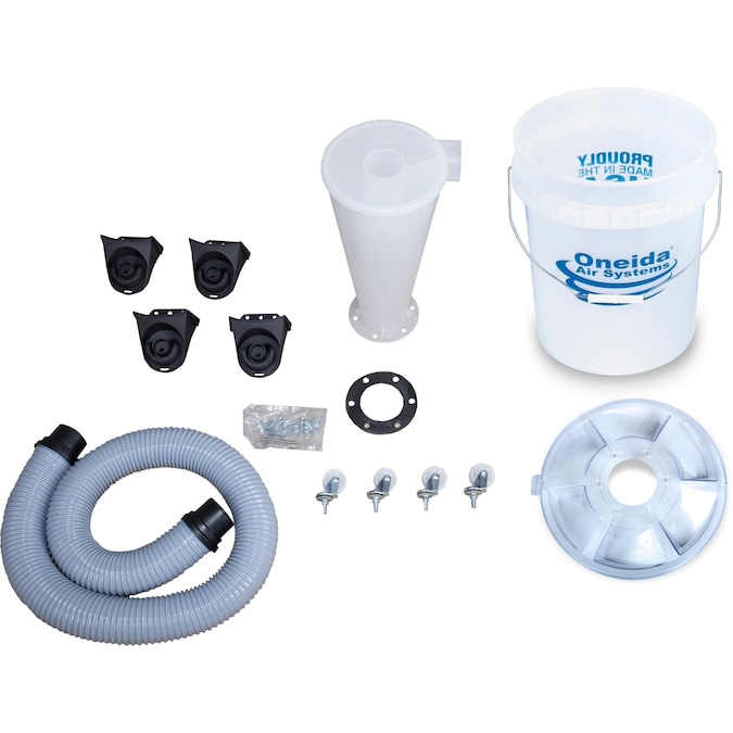 - Comes with the Dust Deputy 2.5 Cyclone, Clear 5-Gallon Bucket with Quick-Release Lid, 4x Casters and Mounts, 2.5″ x 4.5′ Cuffed Hose, Foam Gasket and Hardware.