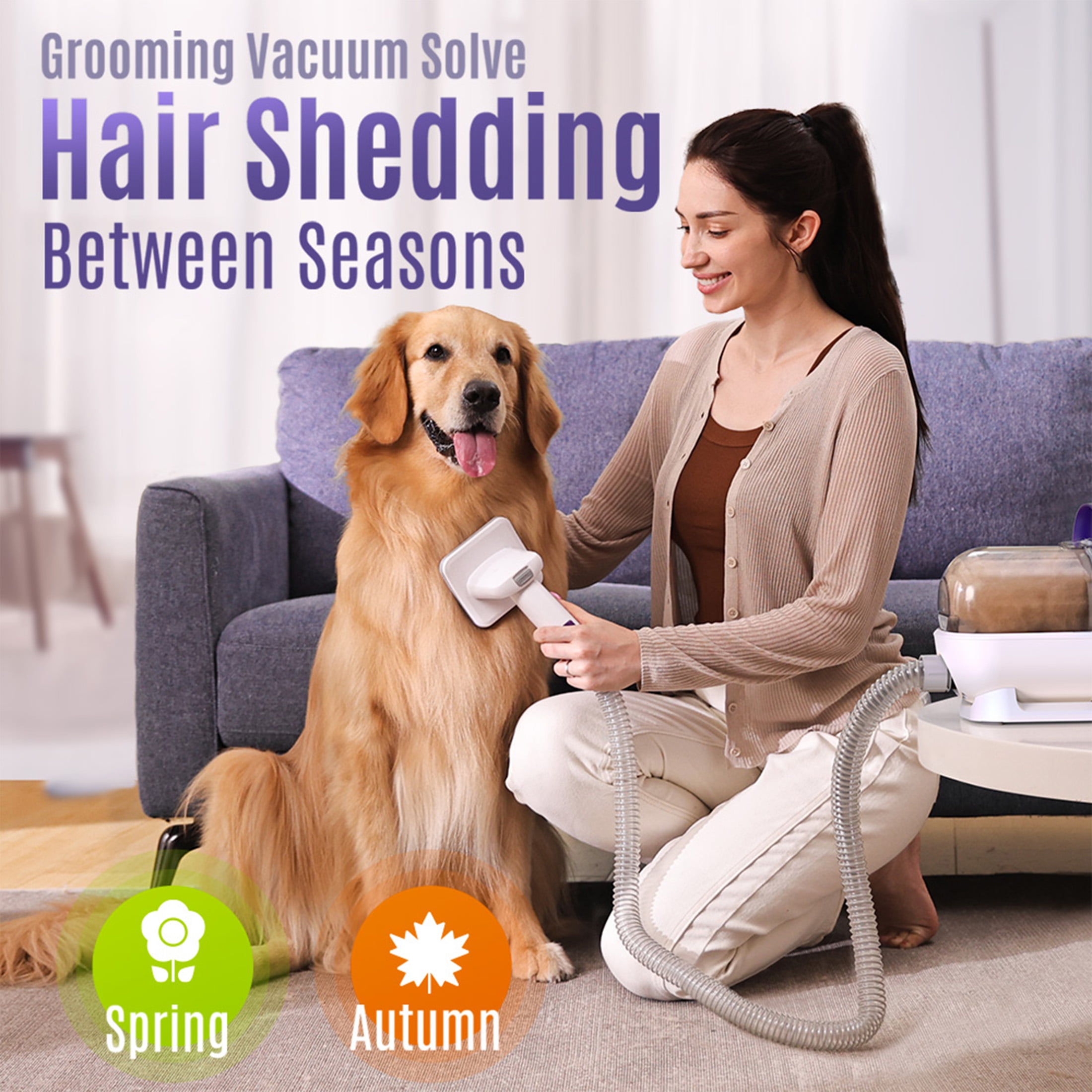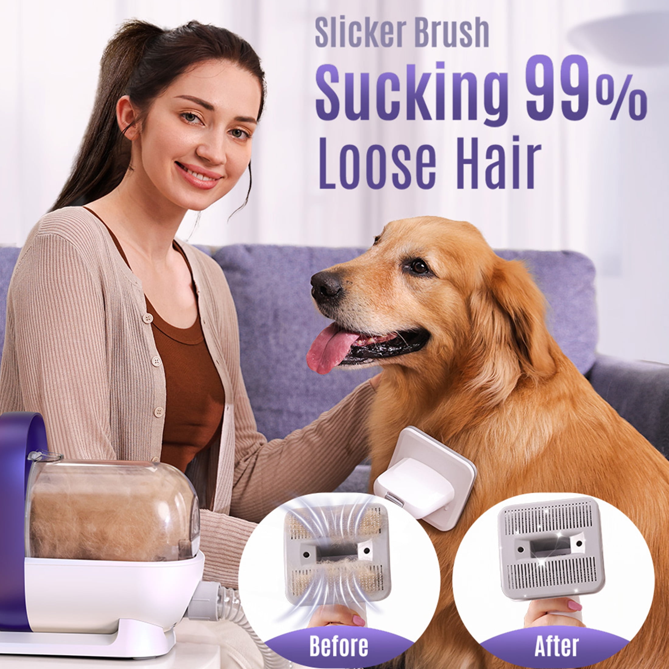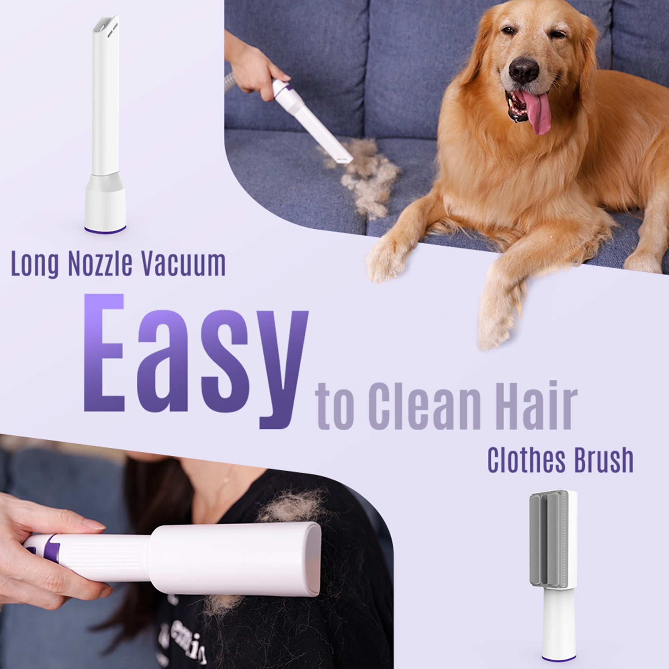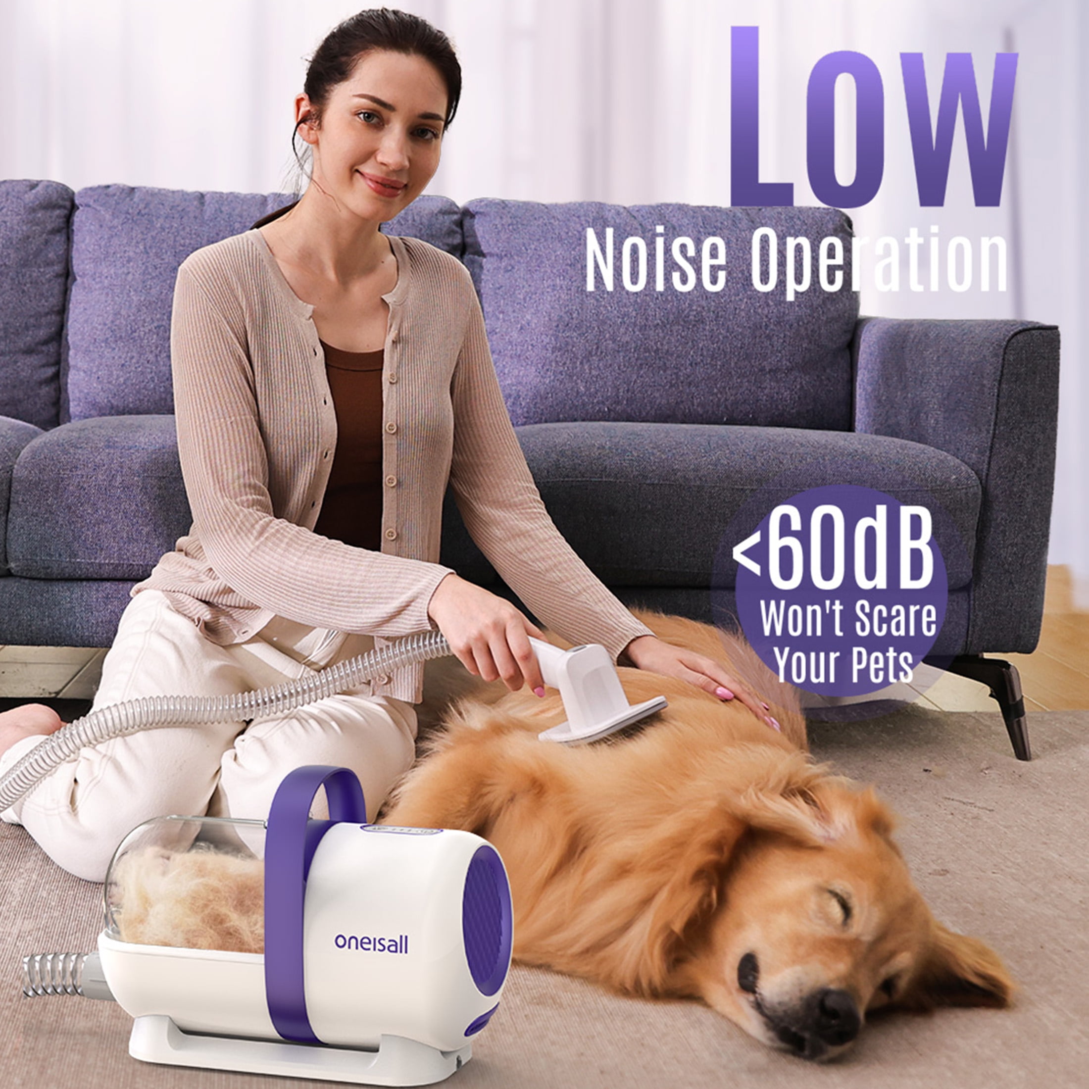 [5 In 1 Dog Grooming Kit] – Including a vacuum cleaner, a slicker brush, a deshedding brush, a long nozzle vacuum, and a clothes brush. [Vacuum Design] – Powerful vacuum design, that can collect 99% of hairs into the 1.5L dust cup, keeping your home clean. [Low Noise Design] – With low noise design, the noise is lower than 60 dbs, making pets feel relaxed and no longer afraid of haircuts. [1.5L Dust Cup] – With a detachable 1.5L dust cup, which is easy to empty and can reduce the frequency of cleaning the dust cup. [Storage Bag] – Equipped with a professional storage bag, store the grooming accessories away after each use and save your space. [Save Time & Budget] – With everything you need to host a salon day for your pet, saving you the budget and time trips to the dog groomer.