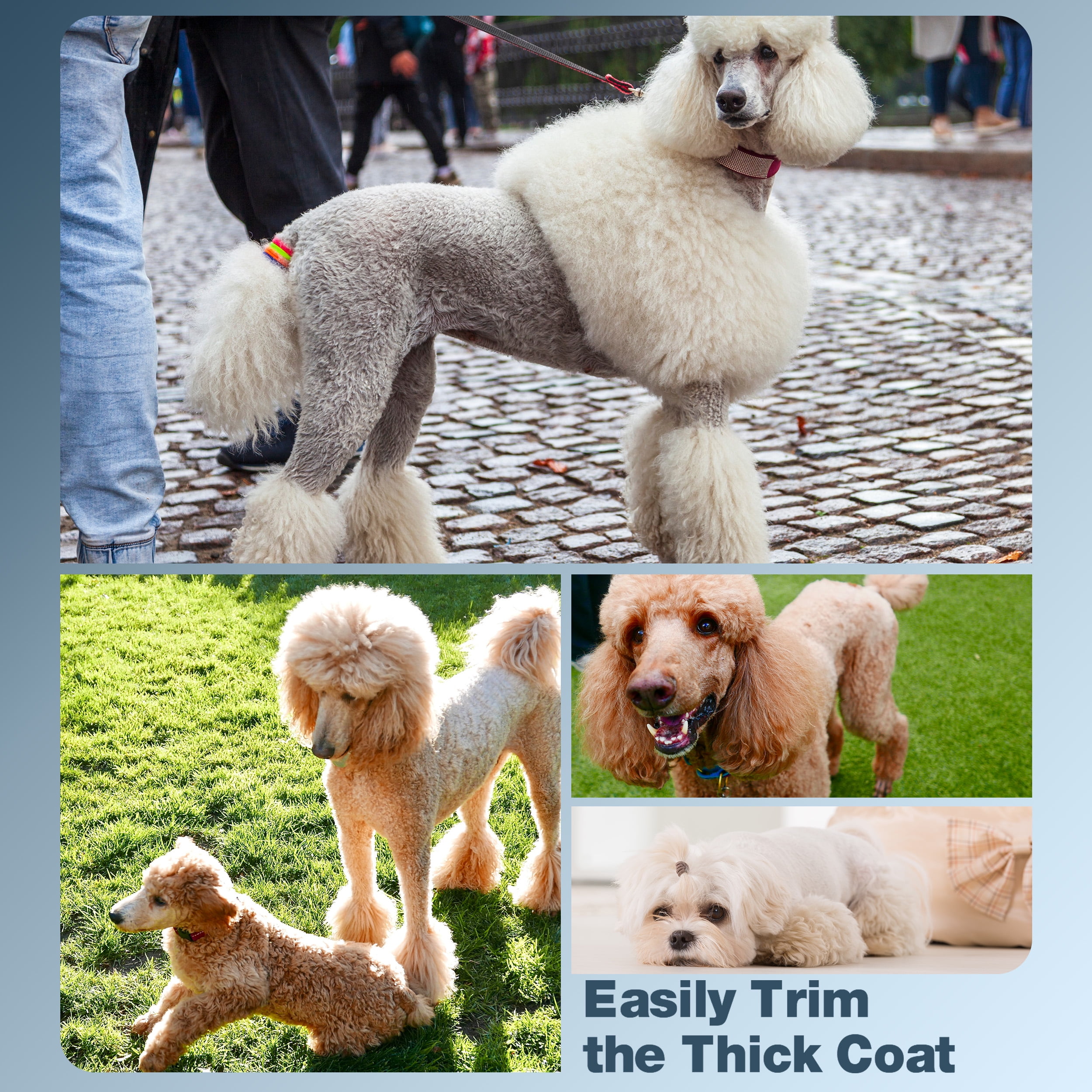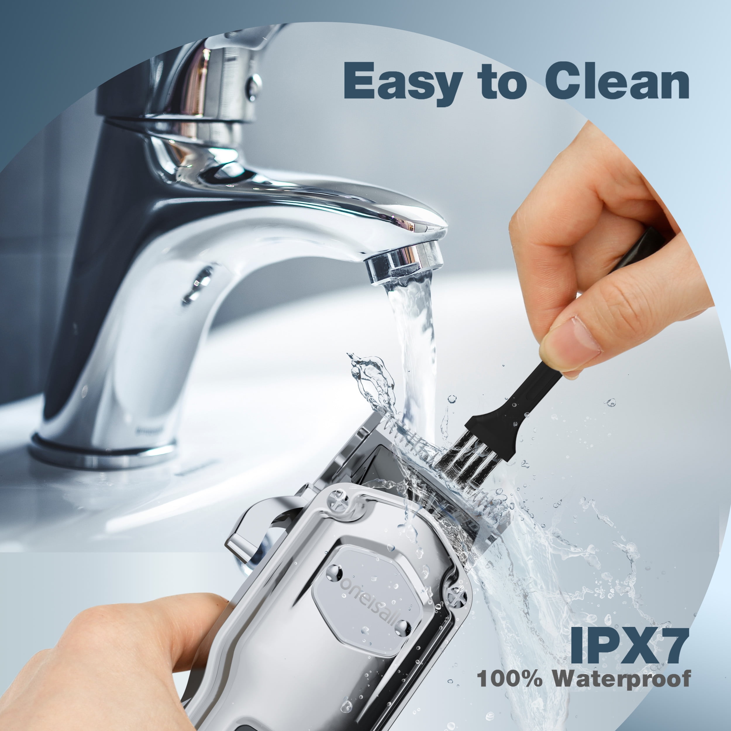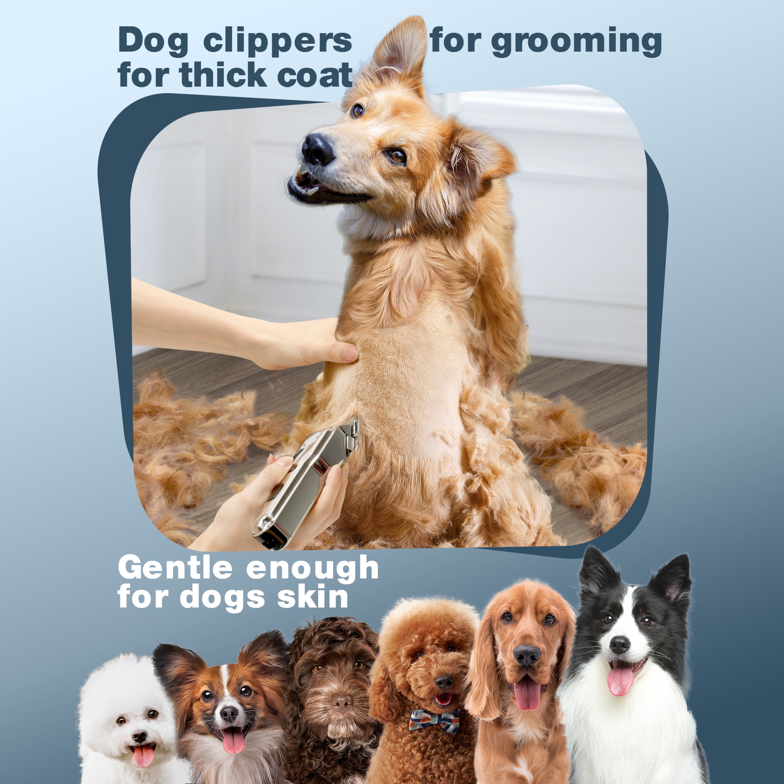 [Easy to Trim] – Oneisall dog clippers for grooming with stainless steel metal blades are specially designed for grooming thick coats. [Ultra Quiet] – The noise of the Oneisall dog grooming clippers is lower than 55db when running, making you trim pet hair with high efficiency. [Long Lasting Battery] – Oneisall dog clippers with a 2000mAh high-capacity battery, fully charged for 2 hours, can be used continuously for 240 minutes. [Cordless Design] – Oneisall dog grooming clippers with a cordless design, are also used when charging and with a travel protect lock. [IPX7 Waterproof Design] – Oneisall dog grooming kit can get washed under the water tab directly or remove the blade and wash.