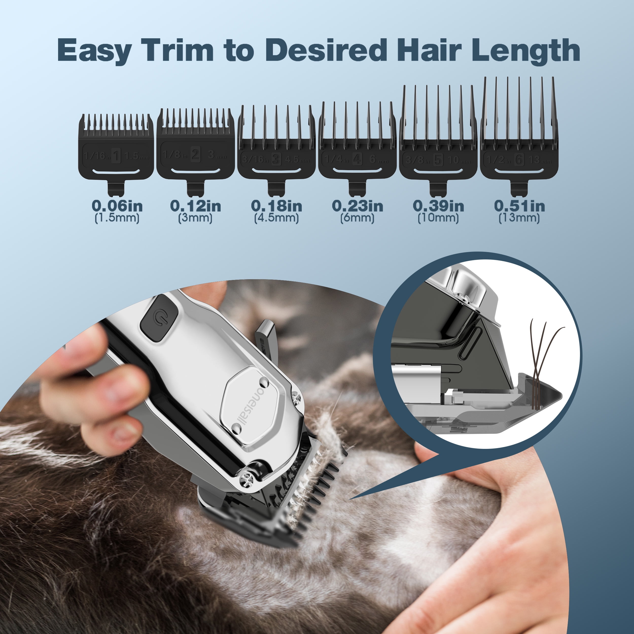 Dog Clippers for Grooming Description: [Safe Sharp Blade & Easy to Trim] – Oneisall dog clippers for grooming with stainless steel metal blades are specially designed for grooming thick coats. 6800 RPM powerful motors by reduce pulling hair, which can truly realize rapid shaving. [Low noise & Low Vibration Design] – The noise of the Oneisall dog grooming clippers is lower than 55db when running, to help the pet feel at ease, and make your pet no longer resist shearing, making you trim pet hair with high efficiency. [Long Lasting Battery & Quick Charge] – Oneisall dog clippers for grooming with a 2000mAh high-capacity battery, fully charged for 2 hours, can be used continuously for 240 minutes. Oneisall dog clippers can also be used by connecting a charging cable while out of power. [Cordless Design & Travel Lock] – Oneisall dog grooming clippers with a cordless design, are also used when charging. With the cordless clipper, you can no longer be bothered by replacing batteries. In addition, Oneisall dog clippers with a travel lock make you to better protect your dog shears when you are out. [IPX7 Waterproof Design] – Oneisall dog grooming kit with IPX7 grade waterproof design, which can get washed under the water tab directly or remove the blade and wash, and clean pet clippers more thoroughly. [What You Get] – Oneisall dog grooming kit includes a cat clipper, 6 guide guards(1mm/3mm/4.5mm/6mm/9mm/12mm), a cleaning brush, a steel comb, a scissor, a blade protector, an oil bottle, and a USB charger. Dog Clippers for Grooming Specification: Brand: Oneisall Model: RFC-676 Material: ABS, Stainless Steel Color: Silver Power Source: USB Rechargeable Waterproof Feature: IPX7 Waterproof Packing Size: 8.8 x 6.1 x 2.4 inches Weight: 1.28 Ib Dog Clippers for Grooming Package Included: 1 x Dog Clippers 6 x Guide Combs(1mm/3mm/4.5mm/6mm/9mm/12mm) 1 x Scissor 1 x Steel Comb 1 x Blade Protector 1 x Oil Bottle(5ml) 1 x Cleaning Brush 1 x USB Charger