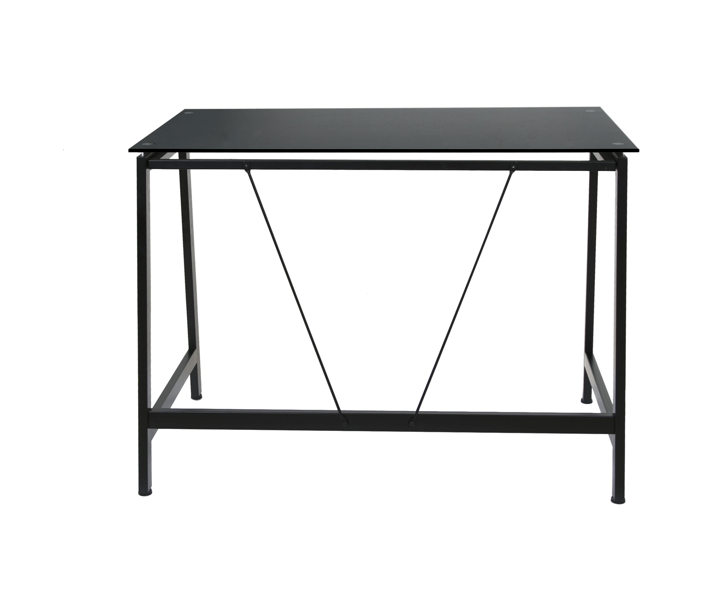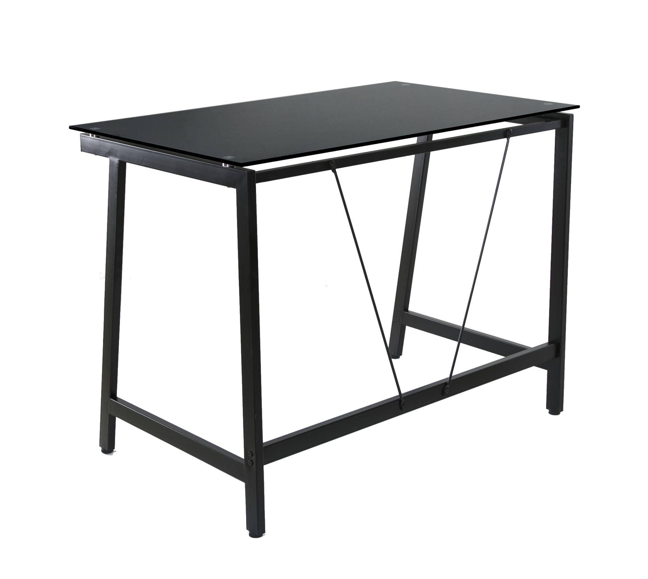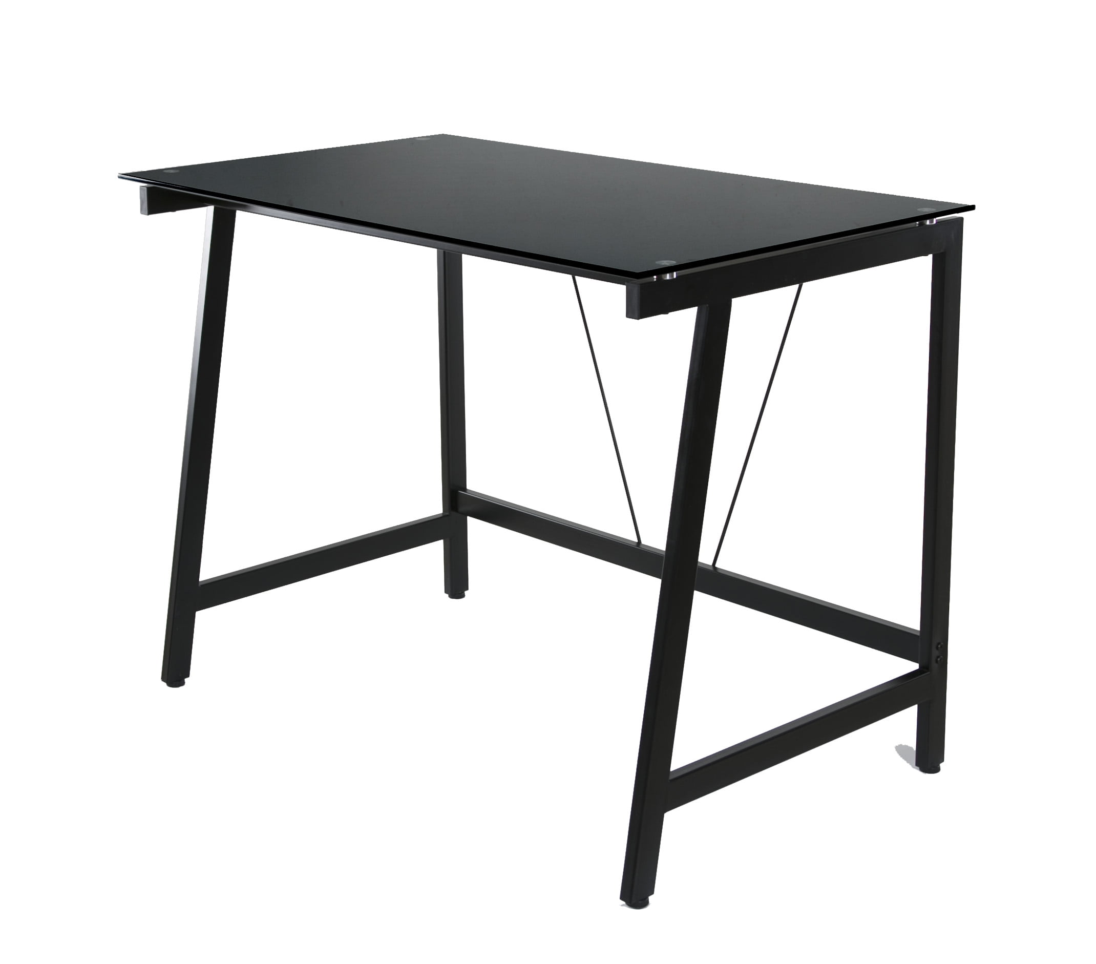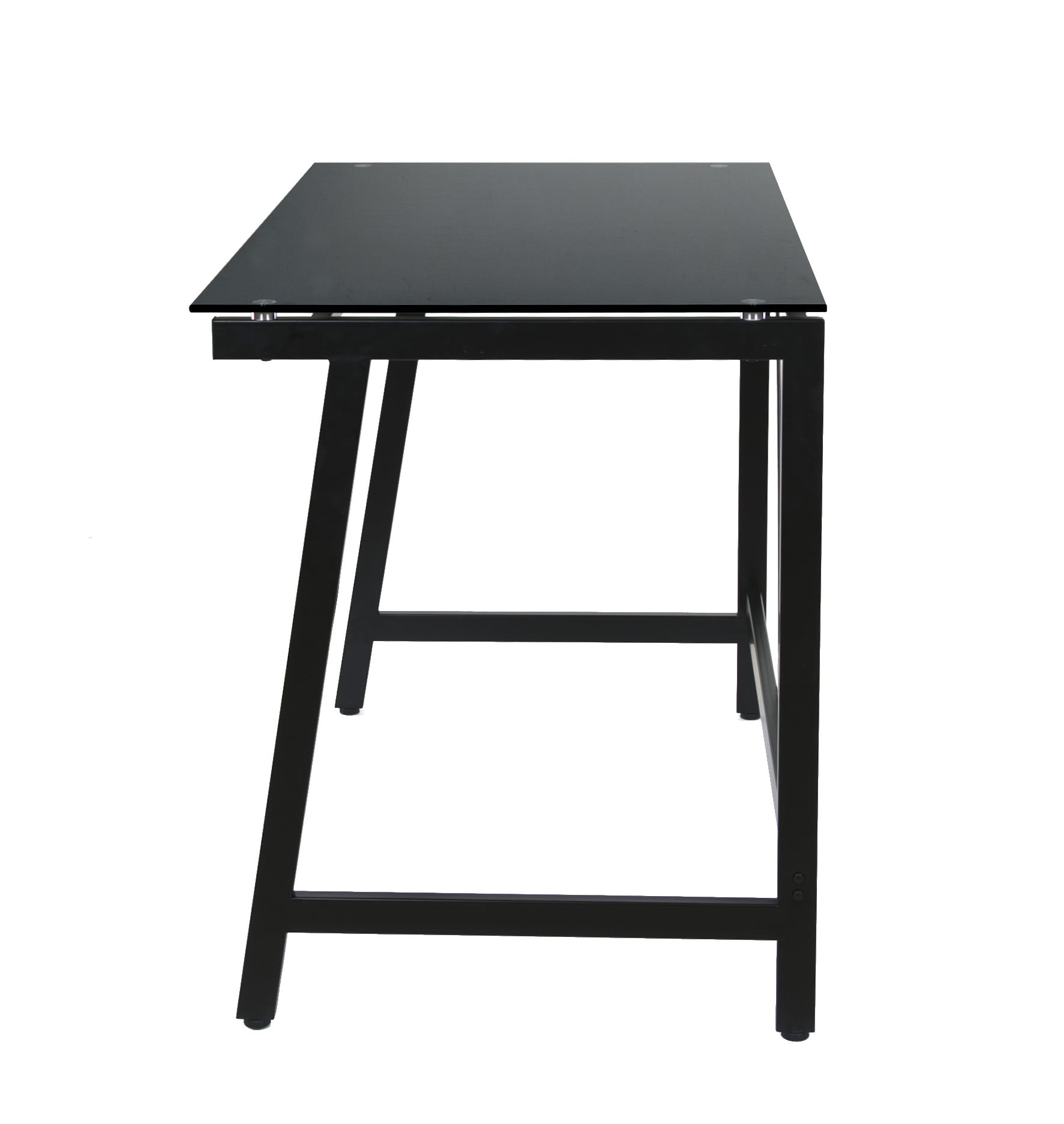 Sleek black glass on matching angled black steel frame both matches and enhances any décor Makes the best use of smaller spaces, with larger desk legroom and working efficiency Ample working surface constructed of thick tempered safety glass Expanded frame design made of highly durable steel; provides exceptional stability and long-lasting support 110 pound weight capacity (desktop); measures 40 inches wide by 24 inches deep by 30.25 inches high