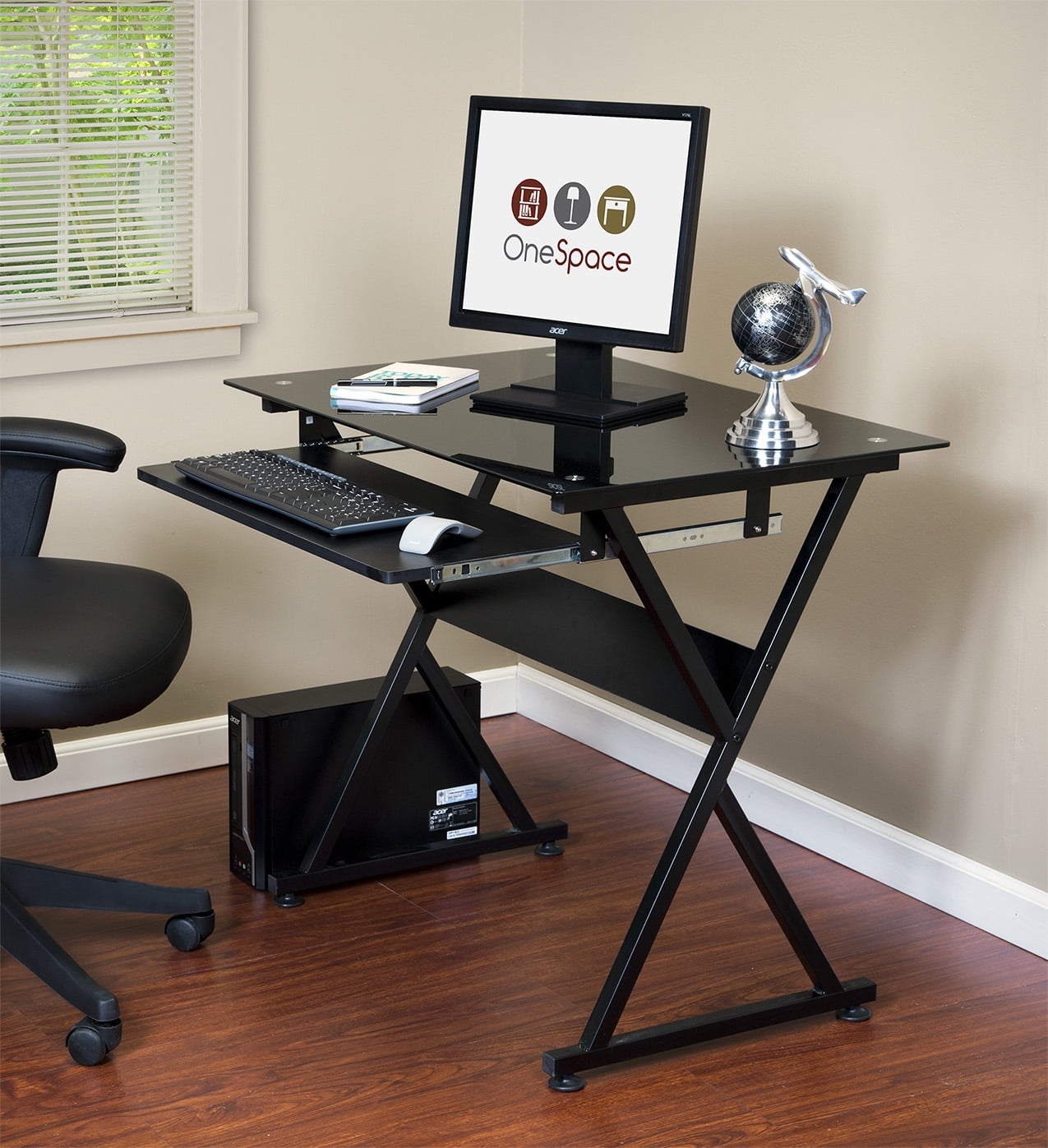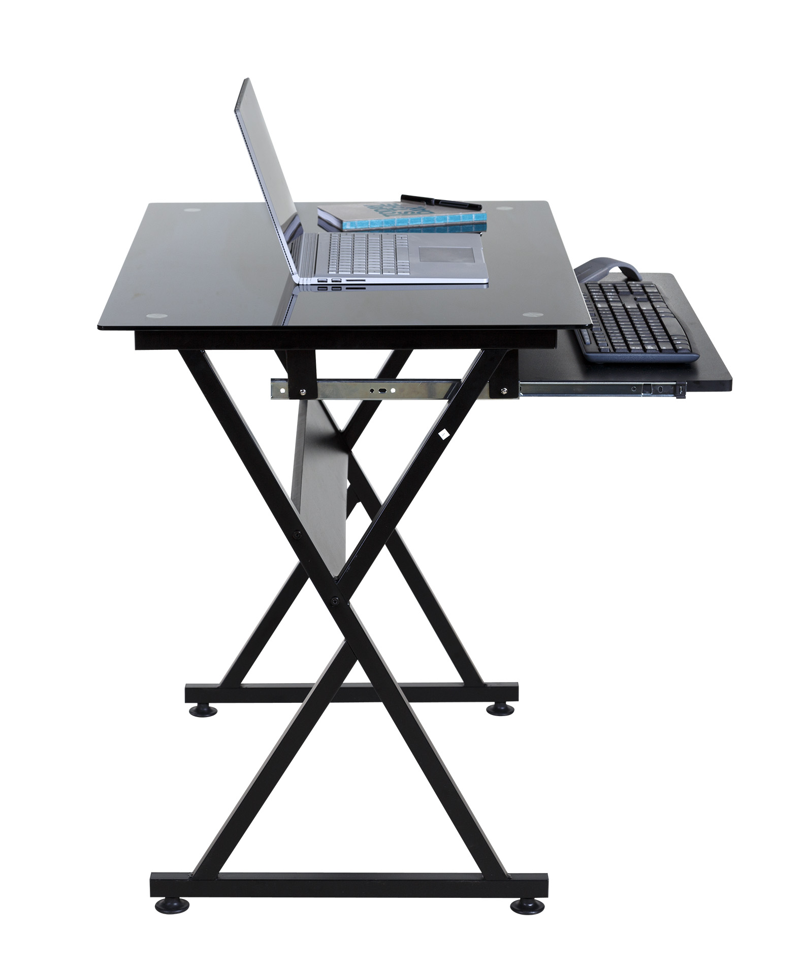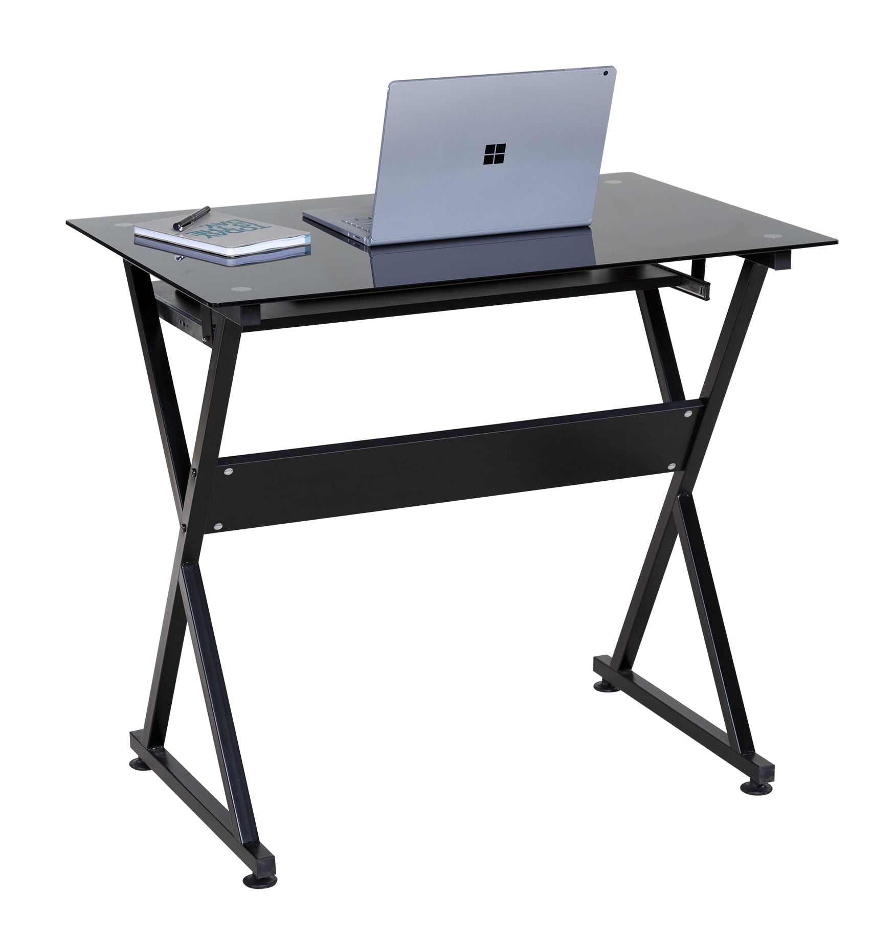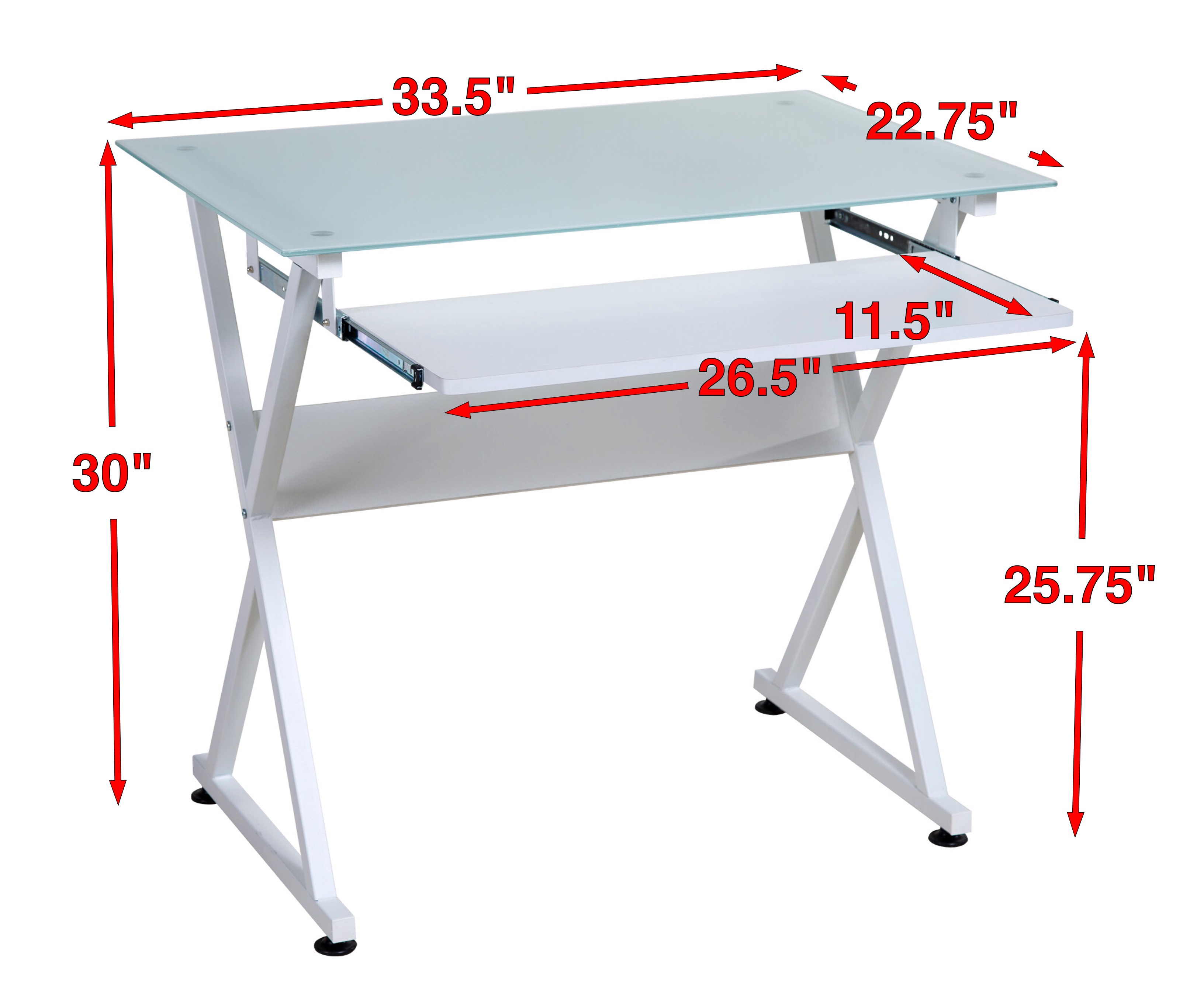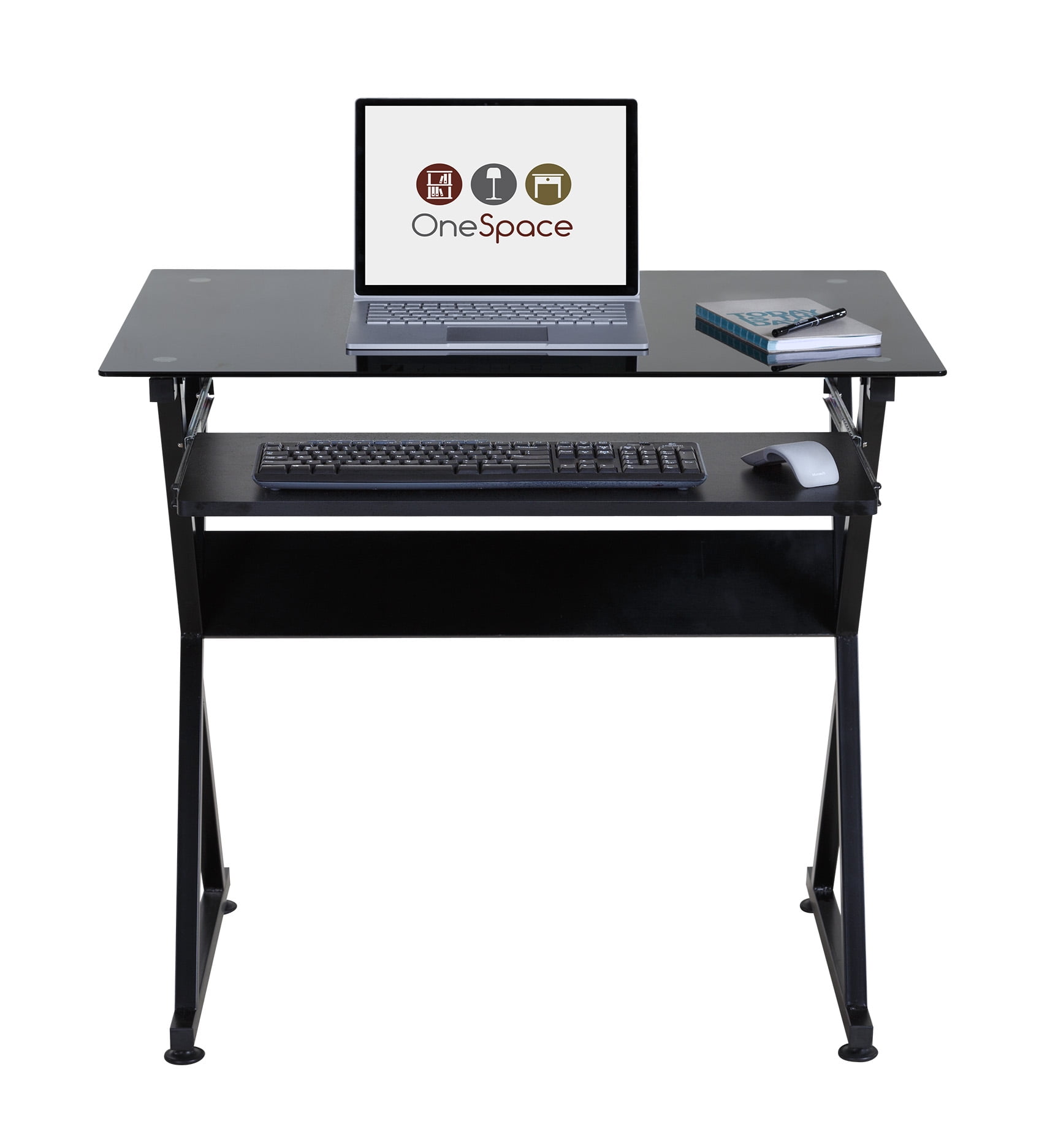 Sleek, adaptive design is attractive from all sides; matches well with any decor Sleek black tempered safety glass surface adds ultramodern appeal Heavy-duty steel frame supports up to 165 pounds; computer tray universal to all keyboards Measures 33.5 inches wide by 22.75 inches deep by 30 inches high Offered by OneSpace, part of the Comfort Products family