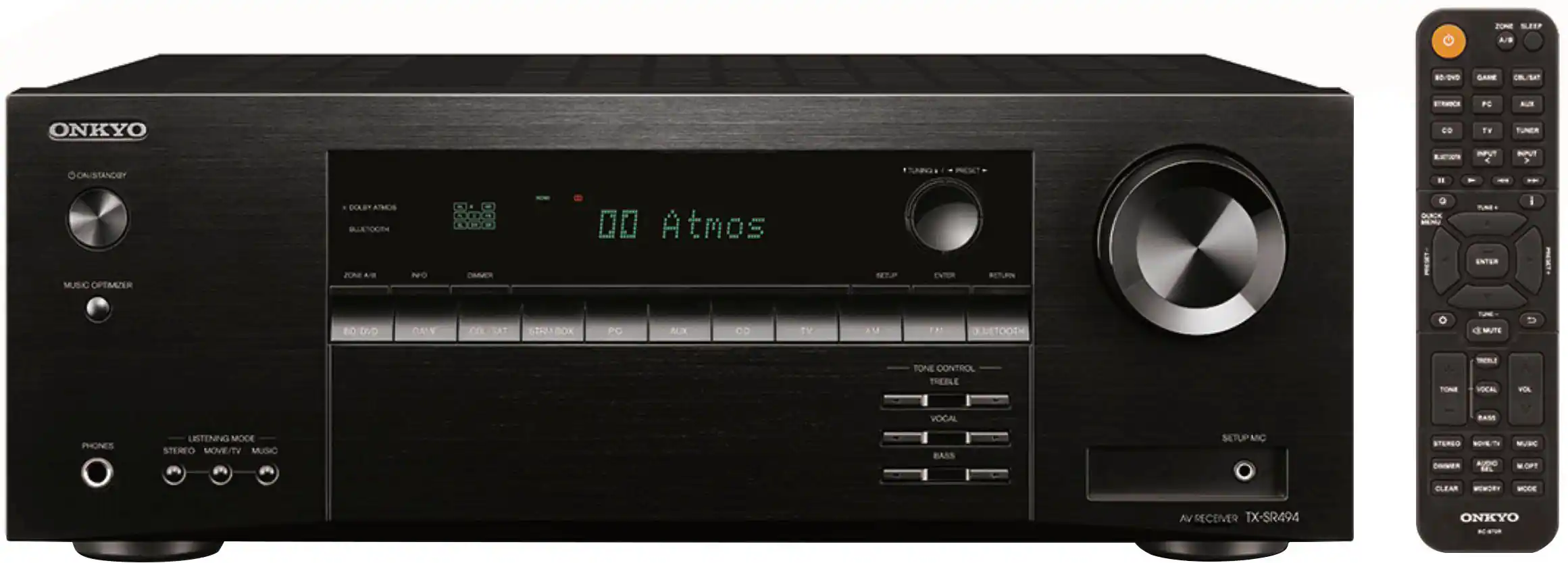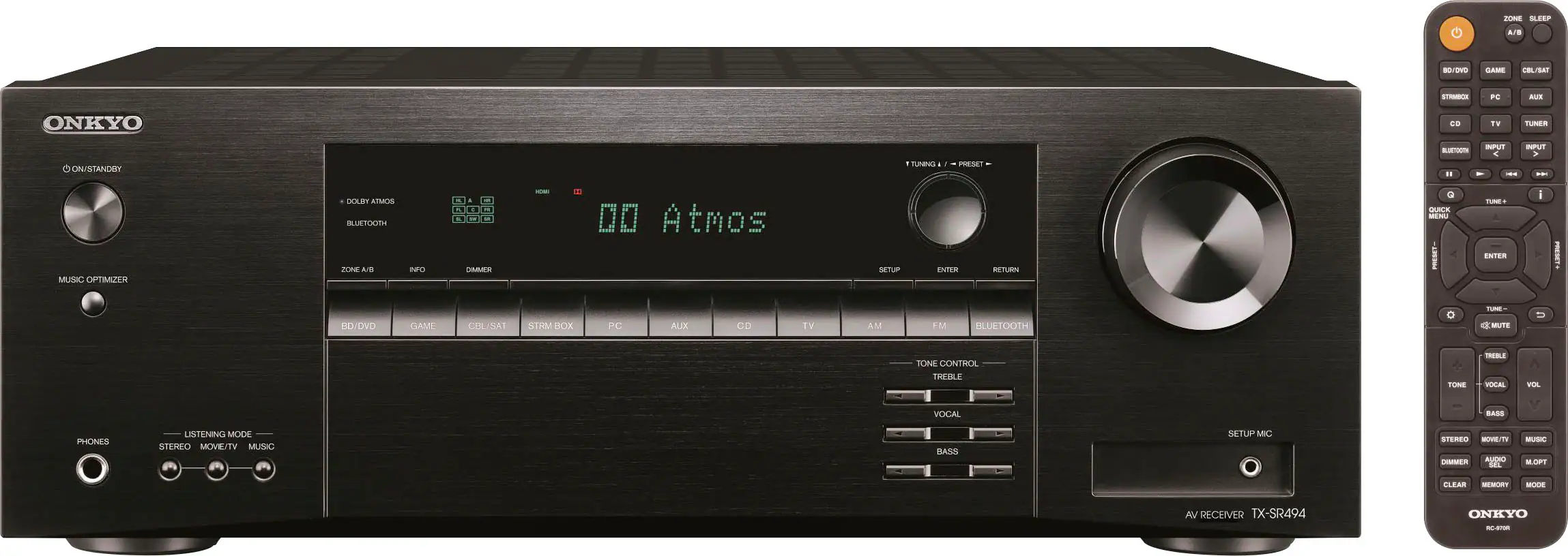 Escape the everyday with spatial surround-sound From easy Bluetooth wireless streaming to the heart-pounding thrills of Dolby Atmos and DTS:X soundtracks, the TX-SR494 deepens enjoyment of daily life with great sound and smart features. Seven channels of high-current power give you freedom to choose a speaker layout that suits. Dolby Atmos Height Virtualizer* or DTS Virtual:X place sound overhead or behind if you don’t want height or surround speakers and both Dolby Surround and DTS Neural:X are on board. Rear surrounds, bi-amped front speakers, or Powered Zone B audio are also an option. AccuEQ with subwoofer EQ and AccuReflex for 5.2.2-ch Dolby Atmos-enabled systems clarify sound in any space. As the heart of your home theater, the TX-SR494 has HDMI terminals supporting HDR and 4K/60p video, while the GUI with OSD over HDMI, Zone B pre-/line-out, and Vocal Enhancer function make this receiver a joy to use as well as hear.