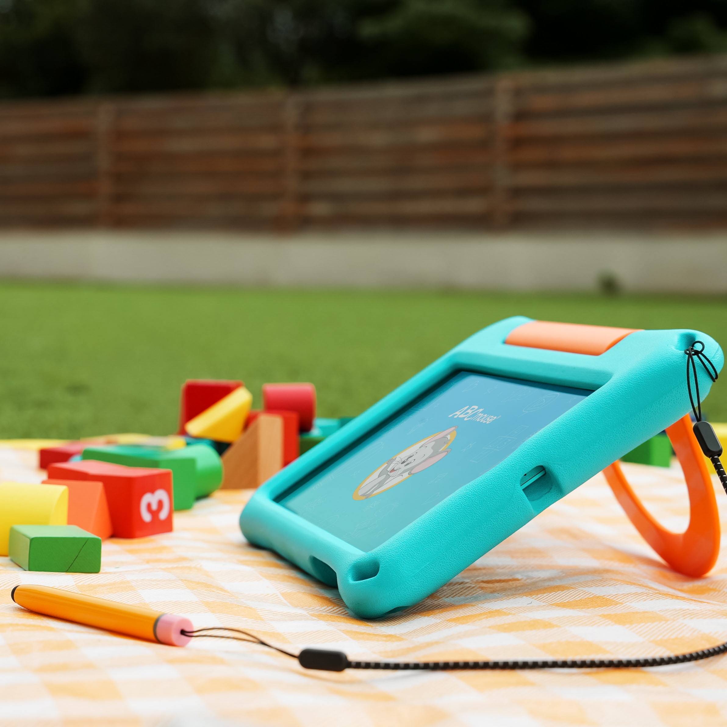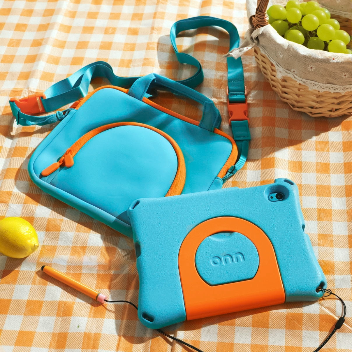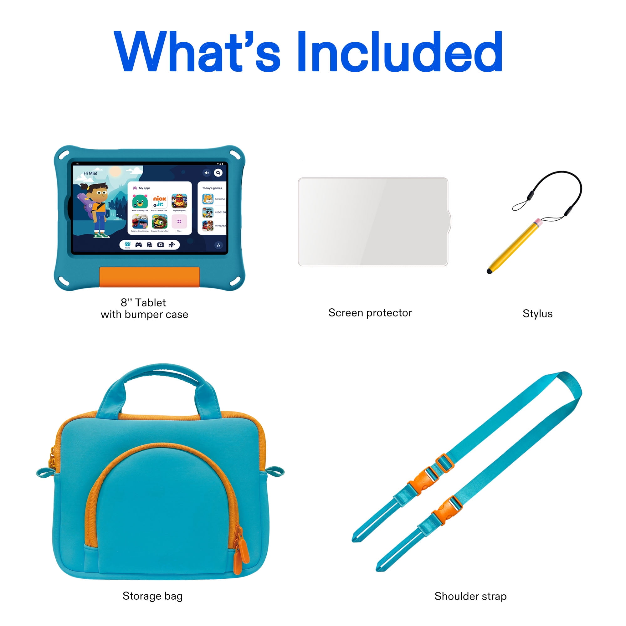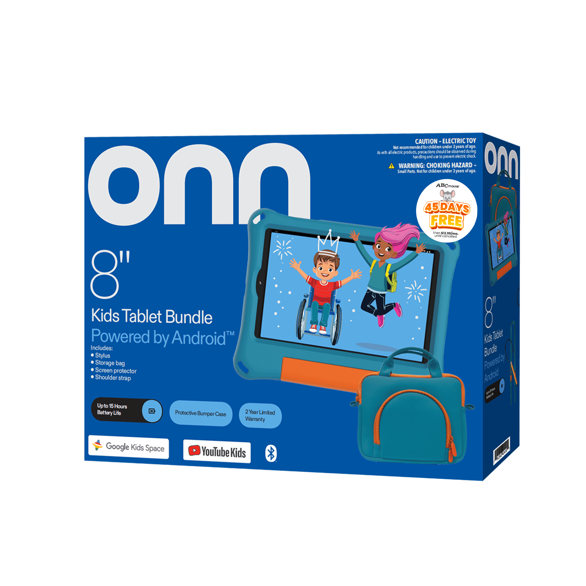 onn 8″ Kids Tablet Bundle, Aqua Kid-centric tablet pre-loaded with kid-friendly apps Android 14 8″ 1280 x 800 resolution IPS LCD touchscreen 2 GHz Octa-Core processor 3 GB RAM 32 GB storage; expandable with a memory card reader Up to 15 hours battery life 2 MP front-facing camera + 5 MP rear-facing camera Google Kids Space and YouTube Kids apps What’s in the Box? 1- 8″ tablet, 1’ AC adapter + USB-C charging cable 3’, 1- bumper case, 1- memory card ejection pin, 1- stylus, 1- storage bag, 1- screen protector, 1- shoulder strap, 1- Quick Start Guide