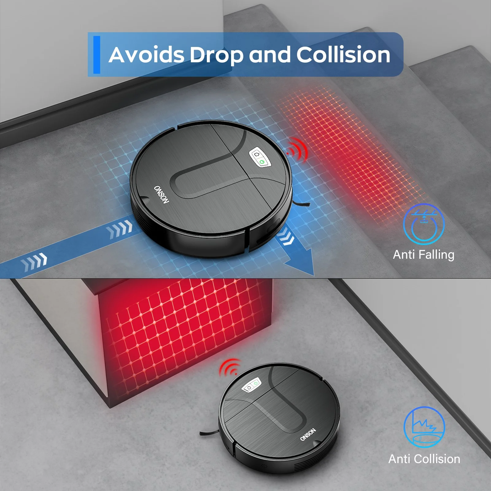 ONSON T1 Robot Vacuum Cleaner boasts a powerful 3500Pa suction, ideal for homes with pets hair, Low-Pile carpet, and hard floor. It offers WiFi connectivity, with Alexa and Google Assistant to control the robot cleaner. With Zigzag cleaning mode, 120 minutes of working time, and smart anti-collision sensors, it ensures efficient cleaning and improve life happiness. √3500Pa Powerful Suction ONSON Robot Vacuum can significantly improve cleaning results, especially for pick up the pet hair, dirt, beans, cereal etc. √WIFI Connected & Alexa and Google Assistant By connecting to WiFi, using Tuya APP control and Google Assistant you can manage your housework more easily and efficiently.(Only support 2.4Ghz WIFI, not work for 5G) √Intelligent AI Sensors Equipped with the Anti Drop and Anti Collision Sensors, it greatly improves its safety and applicability, can effectively prevent the occurrence of falling accidents, and ensure the robot cleaner operates safety and efficiently in various environments. √5 Cleaning Modes for Robot Vac Zigzag Cleaning / Auto Cleaning / Spot Cleaning / Edge Cleaning / Manual Control-The 5 cleaning modes has its applicable scenario. By using different cleaning modes?robot cleaner can achieve your ideal cleaning effect. Click Here for Side brush Replacement for T1 robot vacuum Click Here Filter Replacement for T1 robot vacuum ! √What?s our advantages? Robotic Vacuum with 3 years warranty and cleaning tips for the customer, with 24 hours after-sale service. √How about the parameters? Model: T1 robot vacuum cleaner Net Weight: 4.59 lb Battery: Rechargeable Li-ion battery pack 2550mAh Capacity of dust box and water tank: Dust box capacity 480ml Charging type: Automatic charging/Manual charging Cleaning modes: Auto/Spot/Edge/Zigzag Charging time: Approximately 270 minutes Cleaning time: Approximately 120 minutes Rated Power (W): 35W Operating Voltage (V): 14.4V 【⚠Notes before buying】: 1. This robot vacuum cleaner can not work on long tassel carpet. It can work for other colors low pile carpet, expect black carpet. 2. The robot vacuum with zig-zag cleaning modes, without mapping function. 【⚠Notes before using】: 1. Please read manual carefully before using the robot vacuum cleaners and mop for carpet and hard floor 2. The default cleaning path of the robot vacuum and mop combo is a random path. 3. please clean the filter regularly, and keep it dry after washing it, that will have better suction.