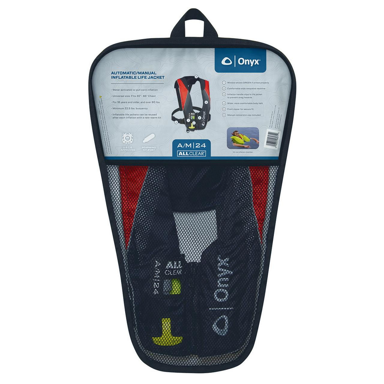 The Onyx AM-24 All-Clear inflatable life jacket has everything except the bulk. This lightweight, low profile inflatable life jacket has an ALL CLEAR viewing window that shows red or green for an at-a-glance look to make sure the inflatable life jacket is properly armed and ready to use. GREEN: Good to go. RED: Need to Rearm. This U.S. Coast Guard approved inflatable life jacket converts from Automatic and Manual to Manual Only Inflation for those times when you want the convenience of kayaking, canoeing, or fly-fishing activities and there is a good chance you may get wet or could end up in the water. If this happens, you just pull the “inflate” cord so the vest will inflate and keep you floating safely. Features a comfortable wide neckline with soft neoprene for all day comfort, a “Secure Pull” inflation handle that tucks away when not needed, and a “Webbing Lock” that rolls straps up and holds them together to keep them in place. The front zipper closure provides a secure fit, and reflective piping adds visibility. Inflatable life jackets can be reused after each inflation. Always read your Owner’s Manual for the proper way to initially arm your life jacket with the CO2 cartridge, and how to re-arm it after it has been inflated. Use Onyx Rearming Kit #1357 for this product.