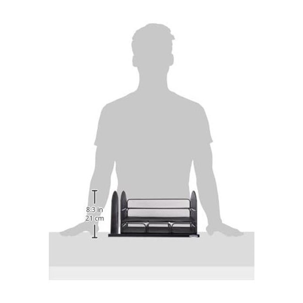 The Onyx™ Organizer is a 3 drawer, wire mesh desktop organizer that aids in office supply organization and file storage. Featuring a horizontal letter tray and vertical file section. The steel mesh design and durable, black powder coat finish provides a long-lasting, versatile workspace organizer.