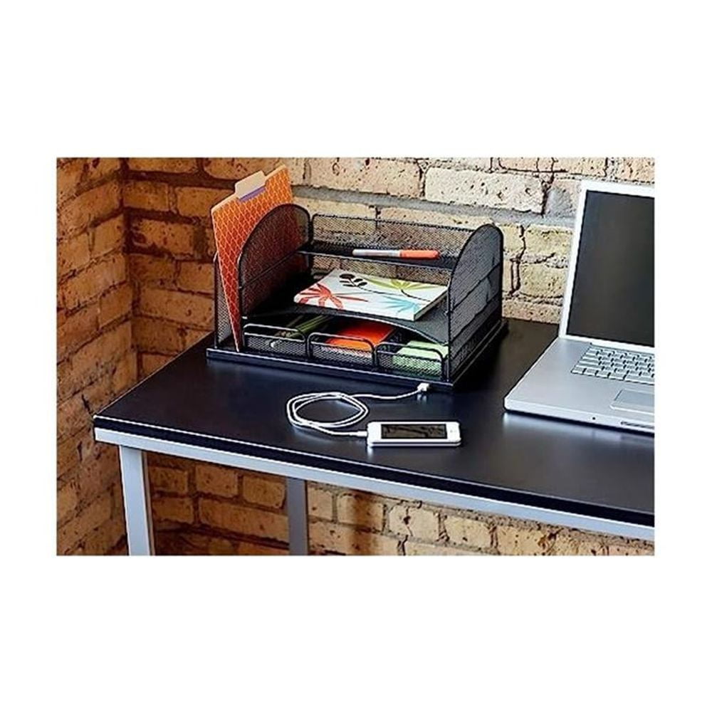 Wire mesh desktop organizers Aids in office supplies organization and file storage Steel mesh design Durable, powder coat finish Three drawers available to store office supplies One horizontal letter tray One vertical file section
