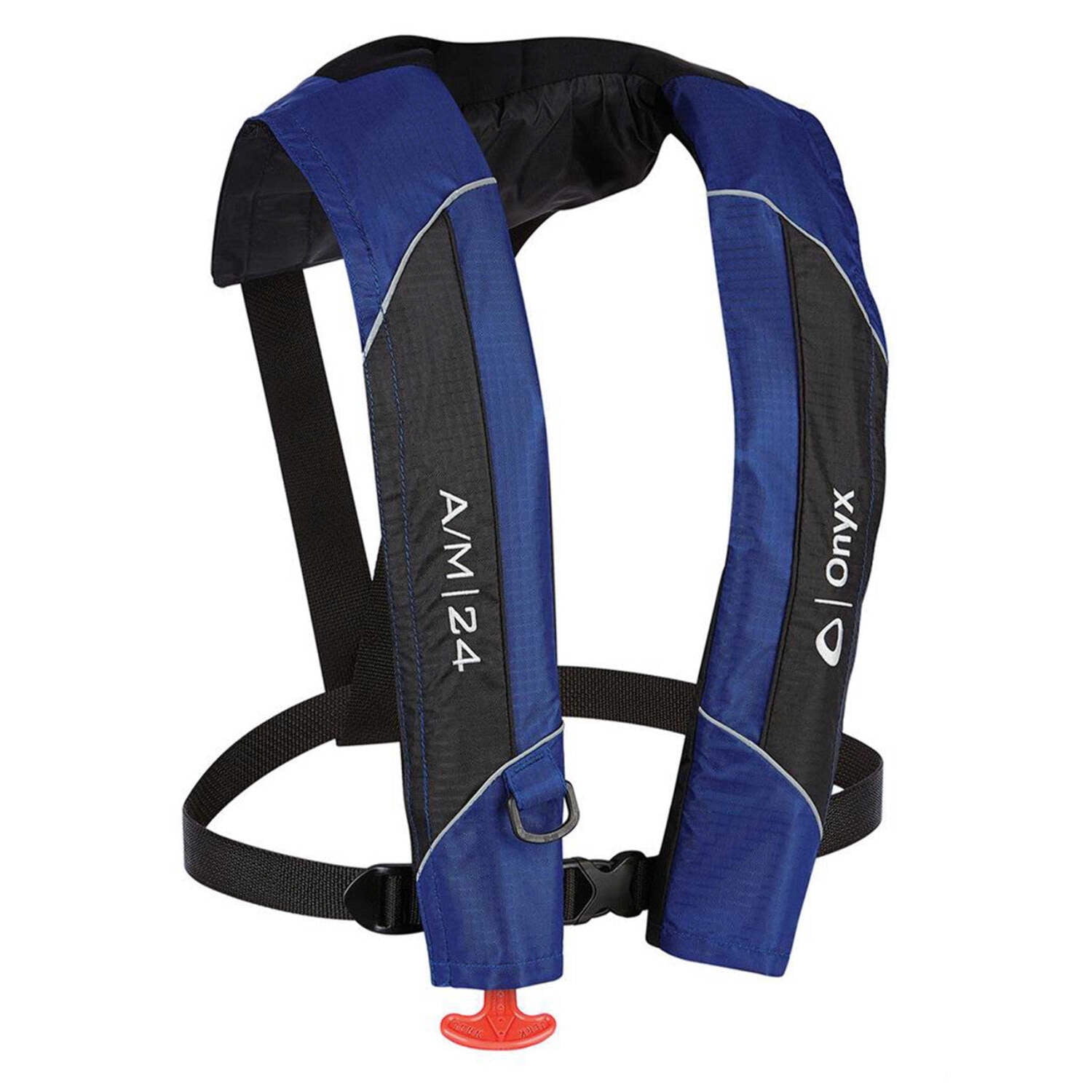Onyx Inflatable Life Jacket Automatic & Manual Inflatation Lightweight, low profile design keeps you cool in warm weather without limiting movement. Automatically inflates upon immersion in water or when the wearer pulls the “Jerk to Inflate” handle Equipped with back-up oral inflation Convertible from AUTO/MANUAL inflation to MANUAL ONLY inflation Provides comfort, safety and peace of mind without knowing you have it on, until you may need it Comfortable, lightweight, low profile design Soft neoprene neckline for all day comfort Durable fabric resists tears and punctures For persons 16 years of age and older; and over 80 lbs. Not recommended for non-swimmers or weak swimmers Minimum buoyancy of 22.5 lbs. when inflated For replacement CO2 cartridge, use Onyx A/M-24 Rearming Kit #1352 (K320) U.S. Coast Guard Approved Type V Life Jacket / Personal Flotation Device (PFD) with Type III Performance Item contains a CO2 cylinder and may not be available to ship to Alaska or Hawaii.