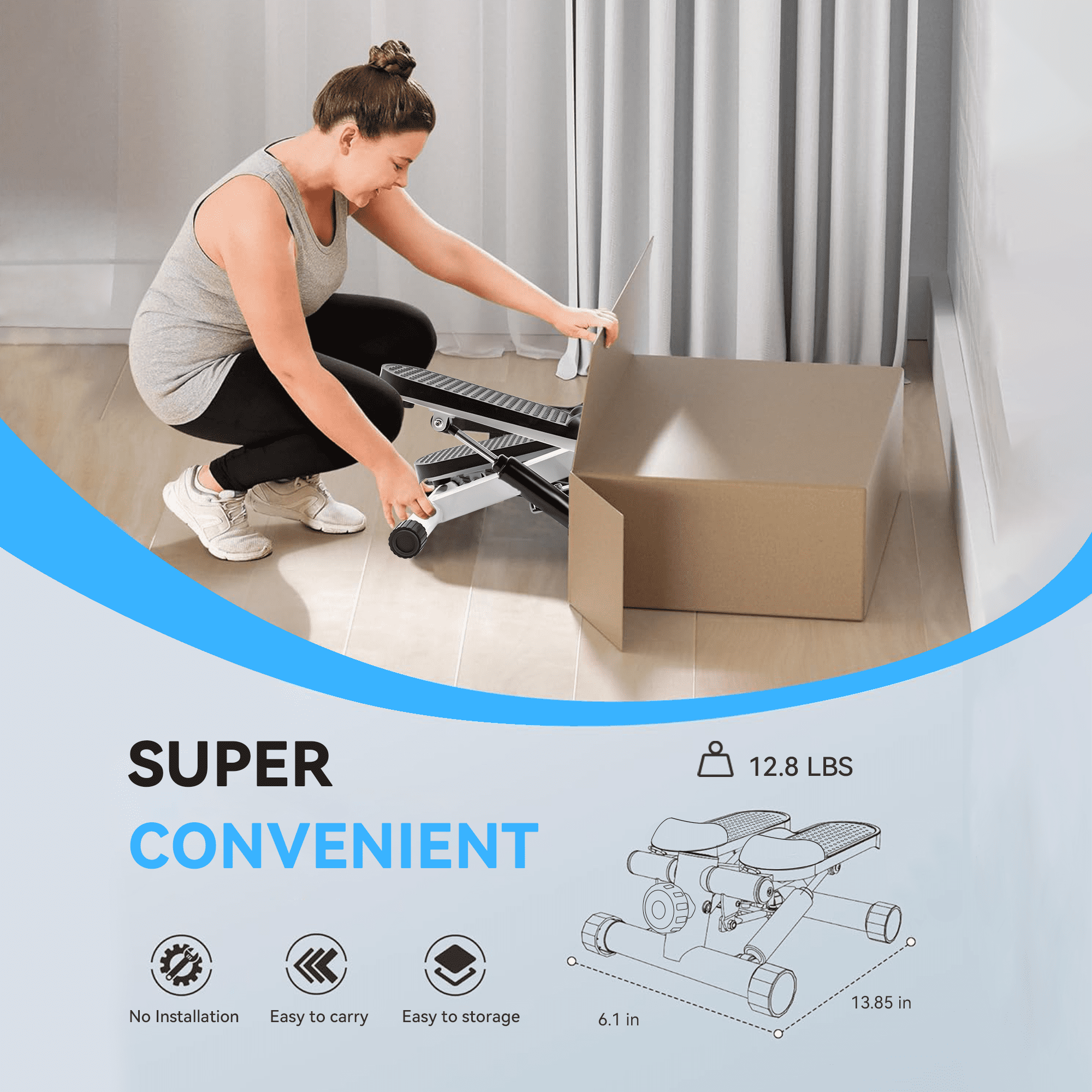 OPMUKIN Steppers For Exercise – Mini stepper’s smooth hydraulic system will maintain high resistance for 30 minutes in each exercise cycle to help you burn fat quickly and get full body exercise. The resistance will gradually decrease after 30 minutes to help you keep in the cardio state and achieve the best exercise effect. It is an ideal exercise equipment at home! Max 331LBS Loading – The loading structure of this stair stepper is made of 2.2MM thick commercial steel & advanced hydraulic system, which ensures absolute stability to protect you from accidental falls, this also gives this mini stepper a maximum load-bearing capacity of 331 pounds, which is suitable for all weight groups. Super Quiet Design – This mini stepper exercise machine offers smooth and ultra-quiet hydraulic drive system and ensures stability and increased resistance while reducing noise from friction. During exercise, it operates at a decibel level of 25 dB, ensuring a quiet workout that does not disturb other people. Comes with a free stepper mat, which is a equipment extra you get to avoid scratching the floor and generating noise. LED Monitor Tracks Your Workout – Stay informed with the smart LCD monitor, tracking the count of steps, exercise time, and calories burned. Make your exercise more effective and aligned with your goals, and provide you with a more scientific and data-driven approach to weight loss and exercise. Equipped with resistance bands to increase the possibility of twist workout. Adjustable Stepper Pedal Height – There is a stride adjustment knob in front of the stepper. You can adjust the height of the steps according to your needs. A low stride makes it easier to step, and a high stride will best simulate the feeling of striding upstairs, in this mode, the exercise effect is almost twice that of the other steppers without an adjustable function 100% Pre-Assembled – This stepper is ready to use right out of the box, no installation is required at all. It’s 100% pre-assembled, so when you receive it, you can skip the hassle of installing it, all you need to do is open the box and enjoy the sport! Choose the OPMUKIN stepper to help you enjoy the pure joy of exercise! Space Saving & Easy Storage – The size of the OPMUKIN fitness stepper is 13.5*11.8*6.1IN and only requires a footprint of about 1FT². The compact size fits in any limited space, so you can start stepping anywhere and store it in any tight corner. With a total body weight of just 16 pounds, it can be lifted with one hand and is easy to handle for all types of people.