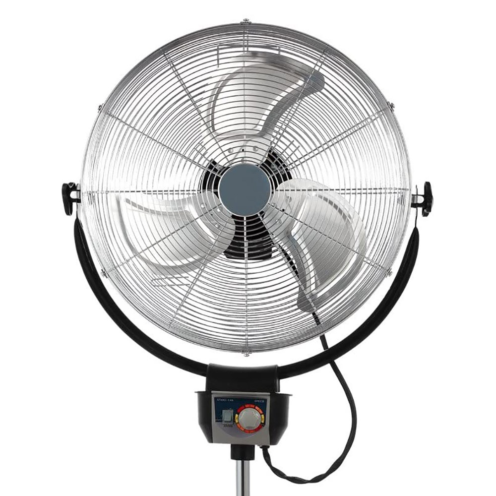 High-torque motor with 3 powerful fan speeds; 4-position rotary switch All-metal construction with heavy-duty aluminum blade; reinforced, circular chrome wire grille for added safety; ideal for industrial settings as well as any area that needs to move high volumes of air 75° of oscillation; adjustable-height pedestal from 40 in. to 49 in.; fan head tilts 360° for use as air circulator; can also point straight up for floor to ceiling ventilation Sturdy base stabilizes operation OSHA-approved 3-prong grounded plug ETL/Intertek listed