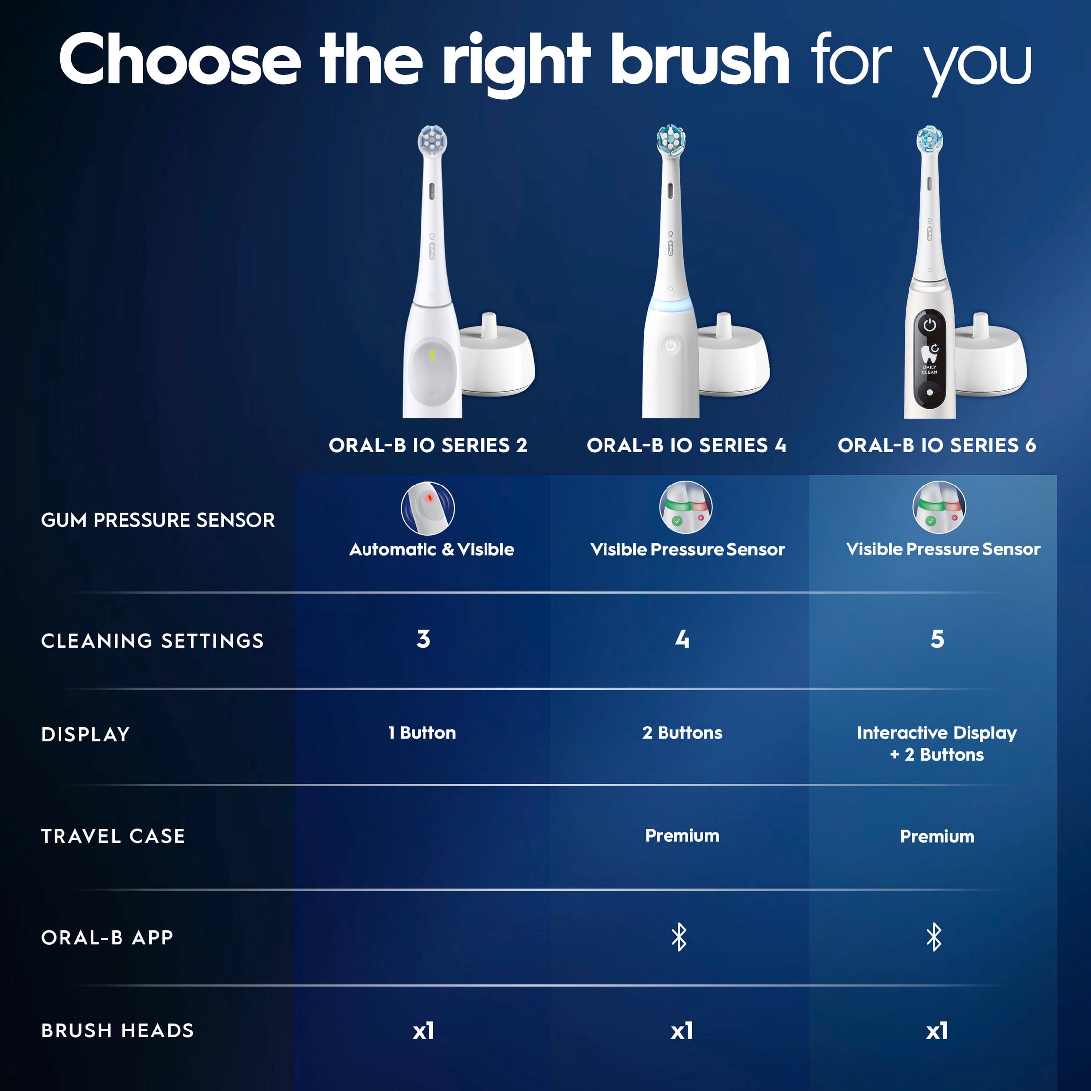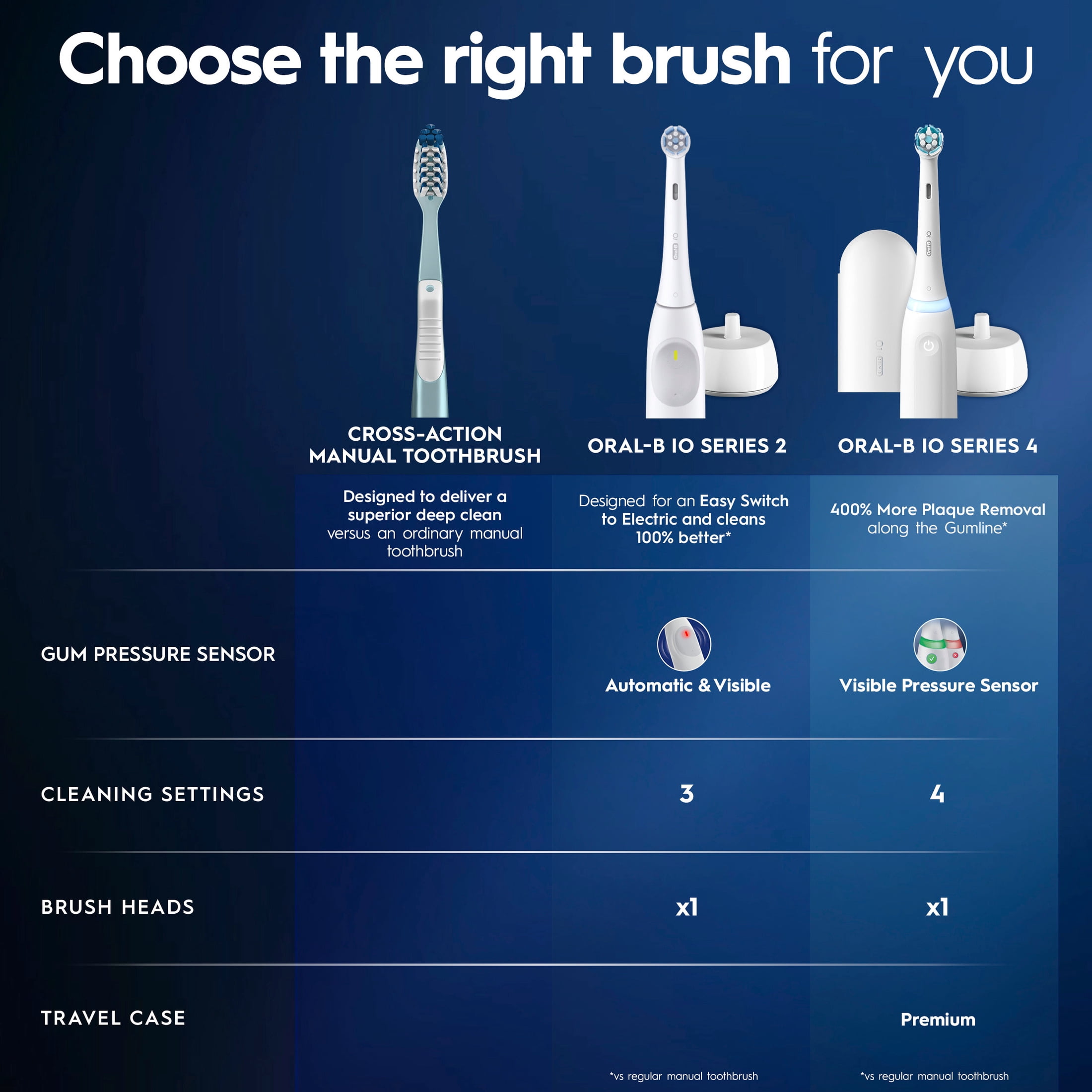 REMOVES 100% MORE PLAQUE vs a regular manual toothbrush with Oral-B’s MOST ADVANCED TECHNOLOGY iO: TOUGH ON PLAQUE, GENTLE ON GUMS DESIGNED FOR AN EASY SWITCH TO ELECTRIC BRUSHES with a 1 touch button, quiet sound, long-lasting battery, and it starts on the super-sensitive cleaning setting. PROTECT YOUR GUMS with the AUTOMATIC GUM PRESSURE SENSOR that slows down speed and signals red when you brush too hard 3 CLEANING SETTINGS to EASILY CHOOSE YOUR PERFECT CLEAN: super-sensitive, gentle, daily clean BRUSH FOR DENTIST-RECOMMENDED TIME with 2-MIN BRUSH TIMER that alerts you every 30 seconds to change your brushing zone FITS ALL ORAL-B iO REPLACEMENT BRUSH HEADS: Ultimate Clean, Gentle Care, Radiant White, Specialized Clean LONG-LASTING BATTERY with a low-charge indicator SWITCH TO ORAL-B ELECTRIC TOOTHBRUSHES CAREFREE: We offer a 30-DAY MONEY-BACK GUARANTEE
