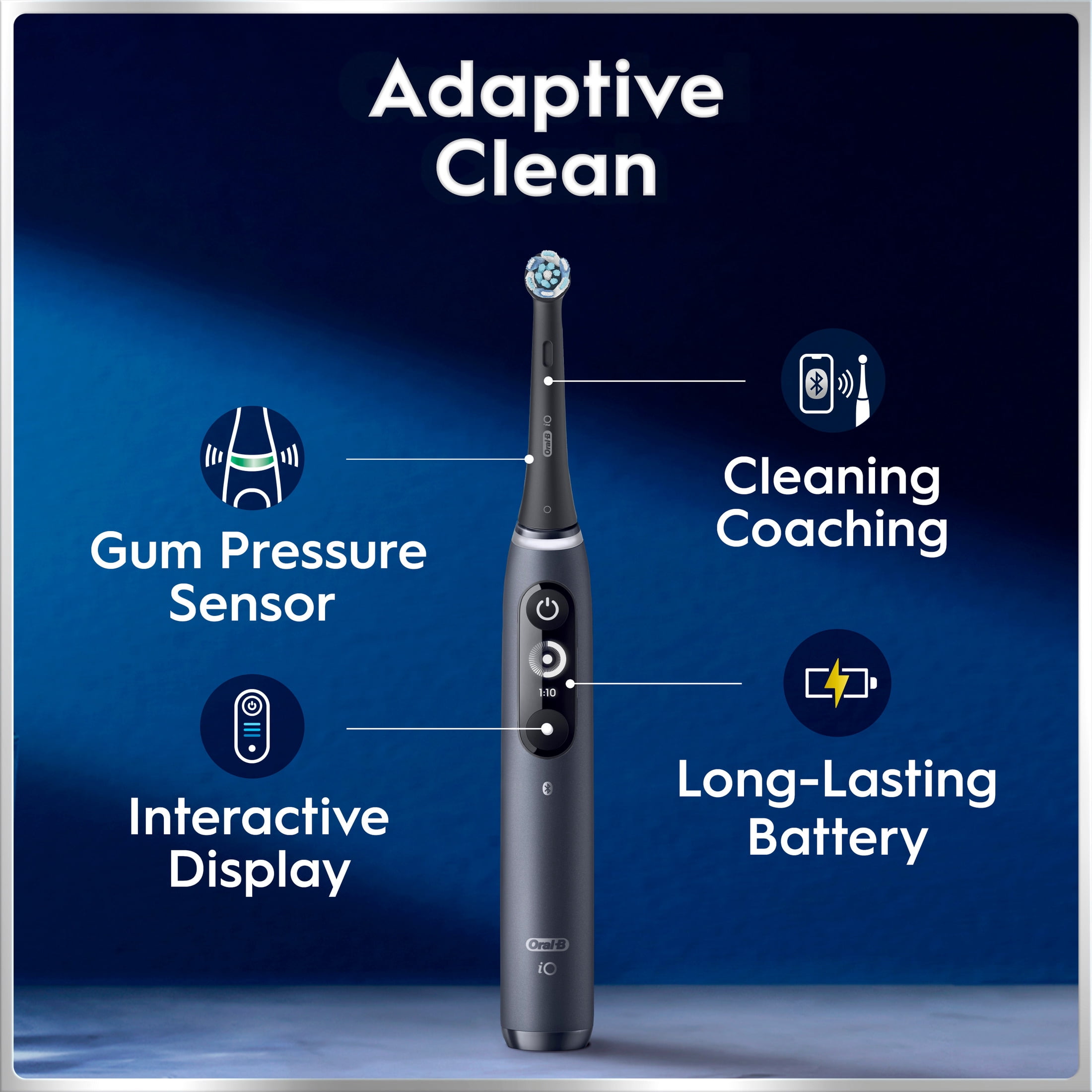 You will receive 1 Oral-B iO Series 7 Black Onyx Electric Toothbrush, 2 Oral-B iO Ultimate Clean Replacement Brush Heads, and a premium travel case 5 Smart Modes for personalized brushing: Daily Clean, Whitening, Gum Care, Sensitive, and Intense Interactive display for real-time coaching AI recognizes your brushing style and guides you to better brushing every day Compatible with Oral-B iO Replacement Brush Heads Connects to the Oral-B app using Bluetooth to help you track your brushing habits For Adults and Children 3+